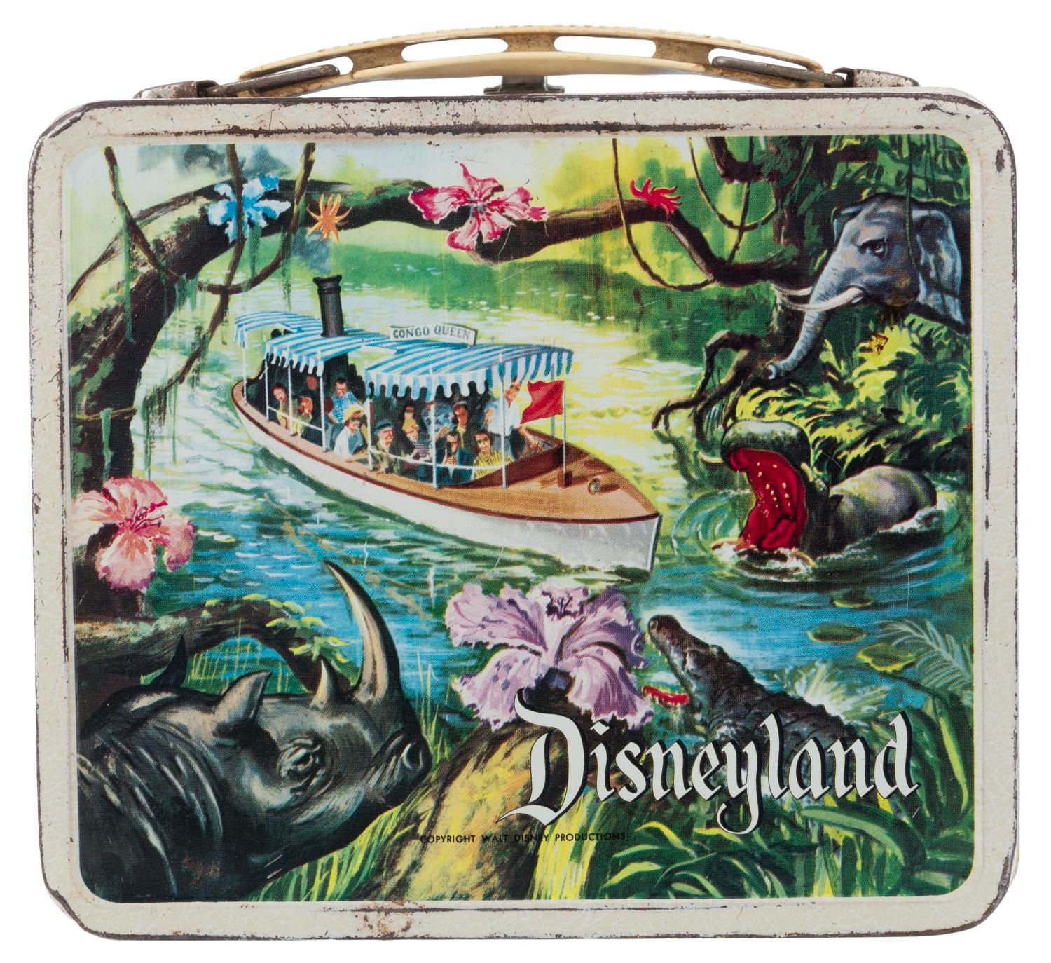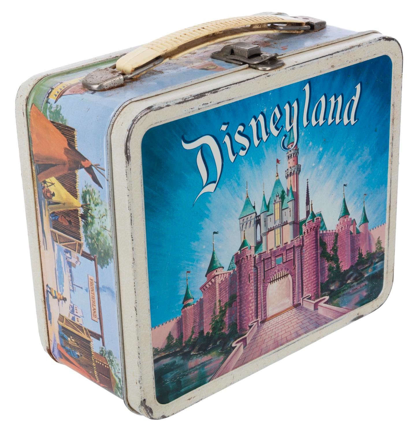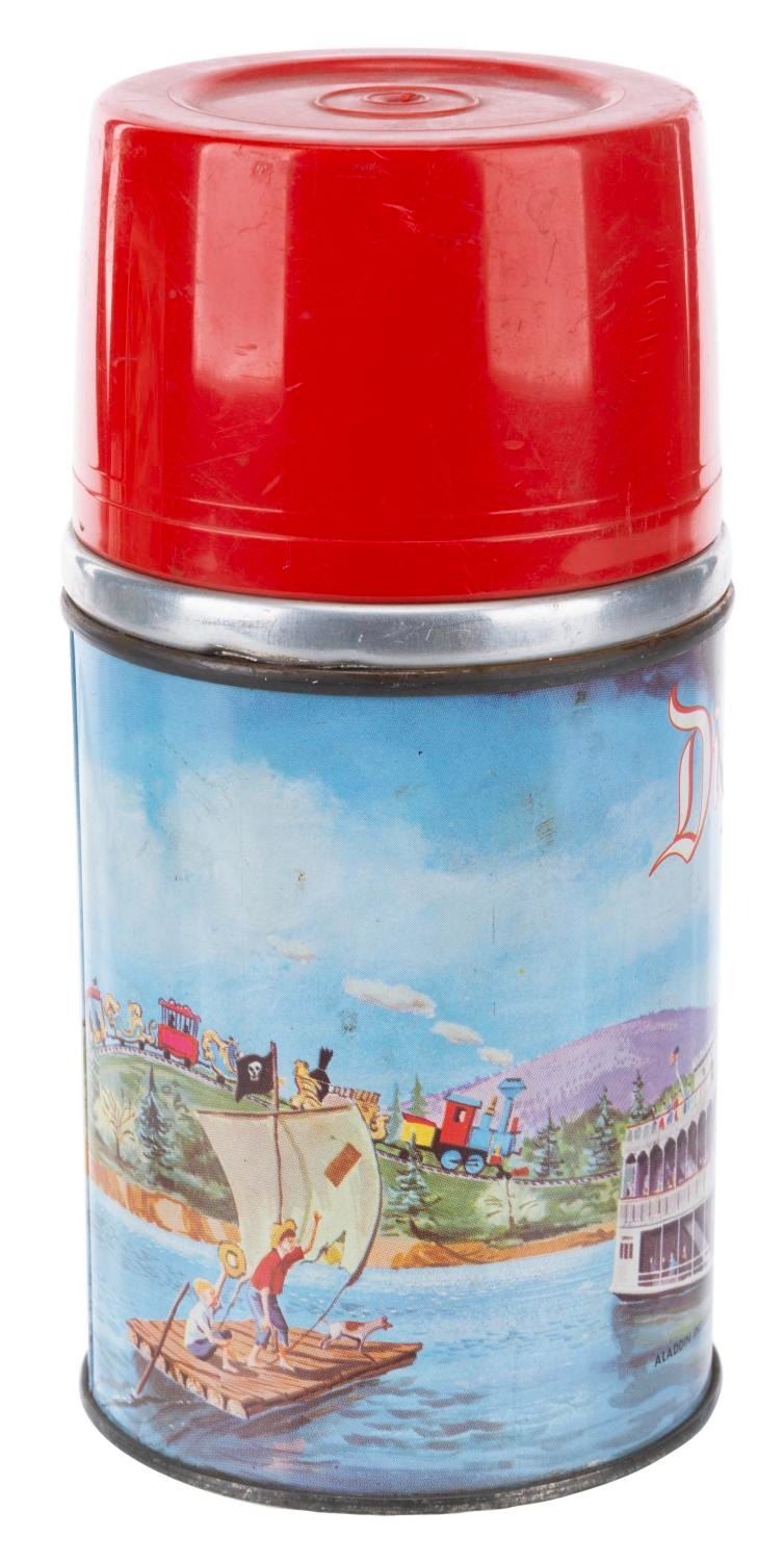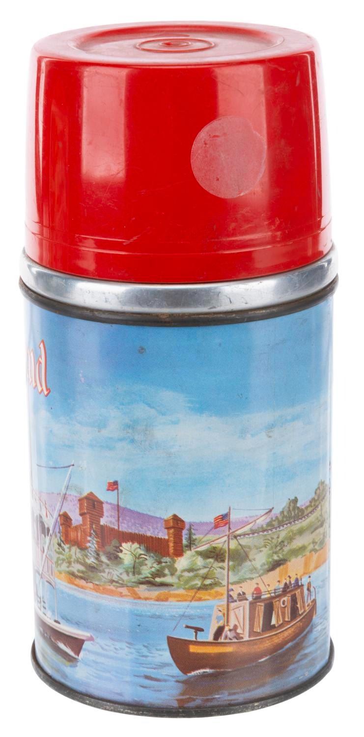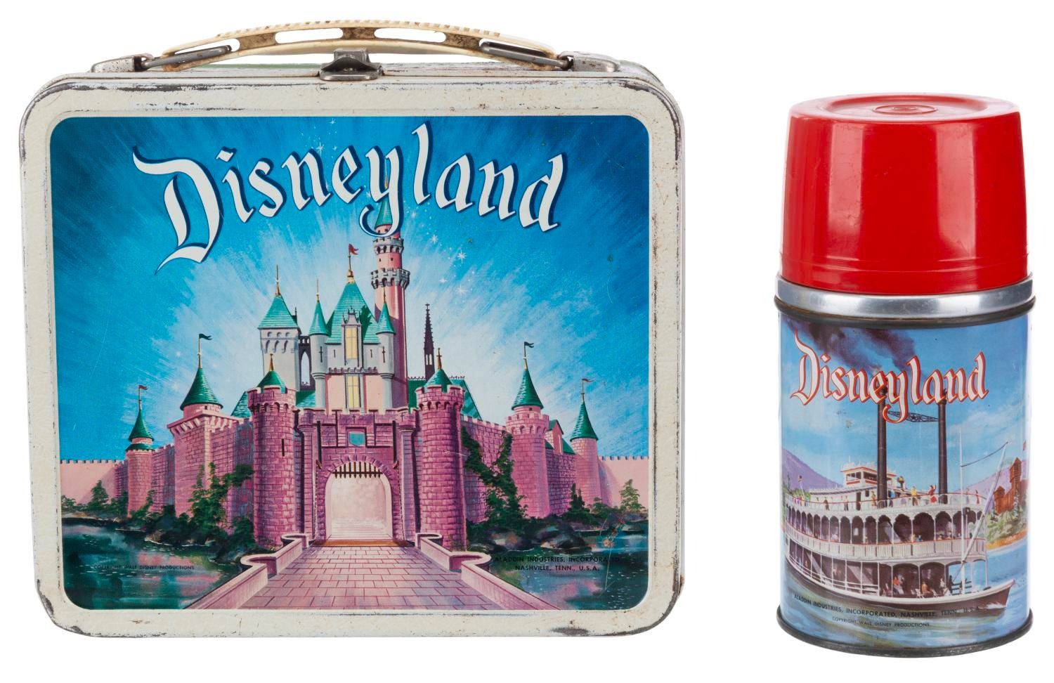 (Disneyland, 1960s) A fantastic early souvenir Disneyland lunchbox and thermos. The lunchbox features imagery from Main Street, Adventureland, Frontierland, Tomorrowland, and Fantasyland in stunning color. The lunchbox measures 8" x 4" x 7" tall and the thermos 6.5" tall and 4" in diameter. Both display in good condition with scratches, oxidation, stains, and wear.