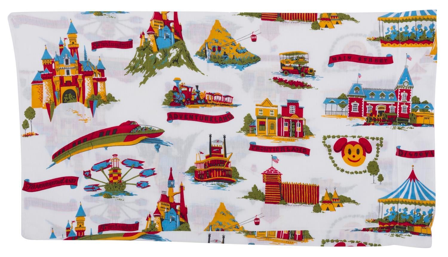 (Disneyland, 1960s) A pillow case featuring the attractions of Disneyland including the Monorail and Indian Village. Measuring 18" x 34", the pillow case is in fine condition.