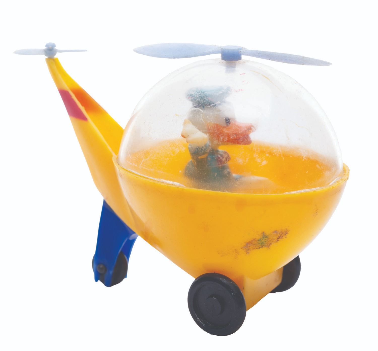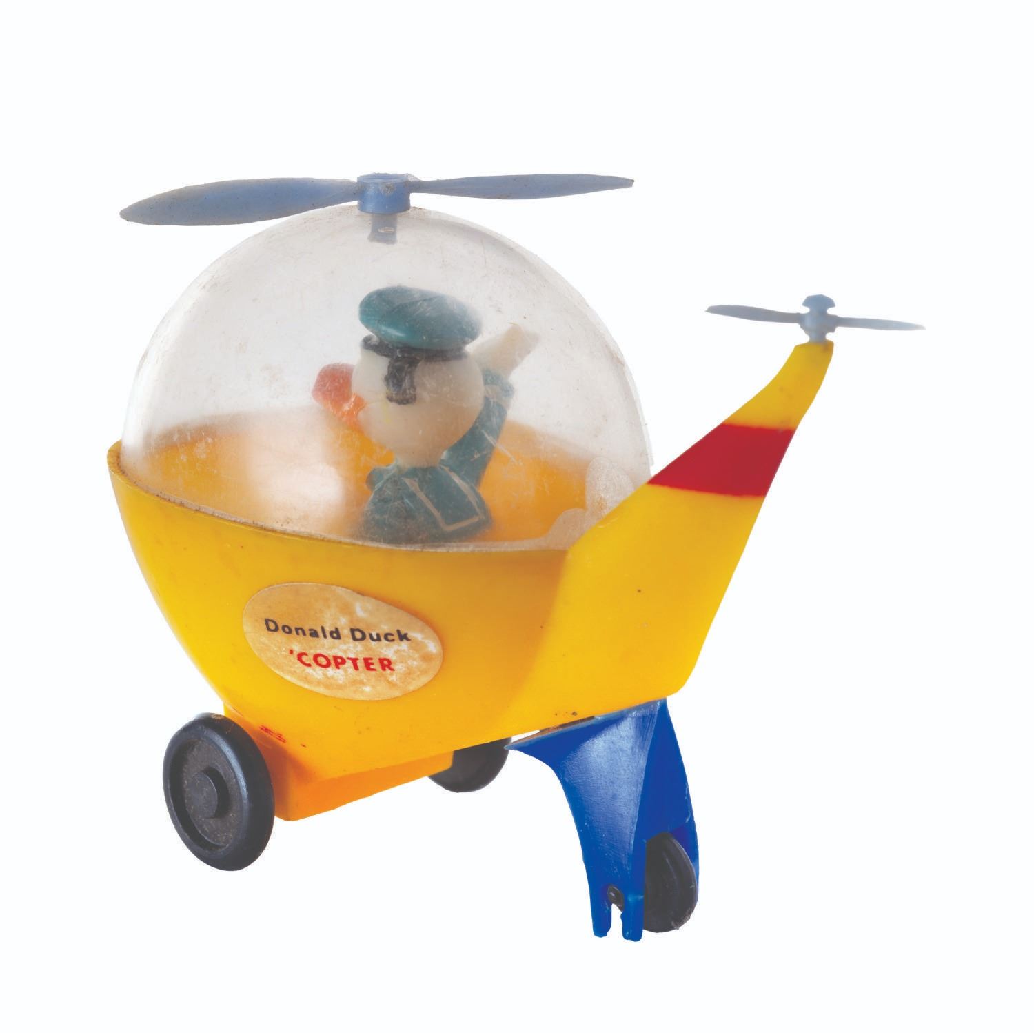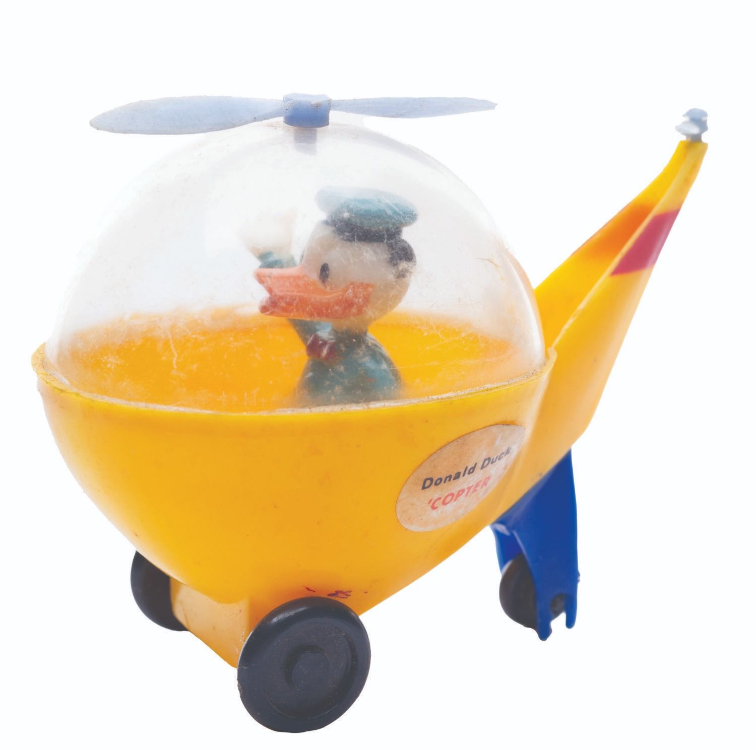 (Multiple Toymaker, 1960s) A Walt Disney's Donald Duck's Whirly-bird toy with a hand-decorated figurine of Donald Duck. Measuring 3" tall and 3.25" long, the plastic toy is in good condition, with slight scuffs and wear.