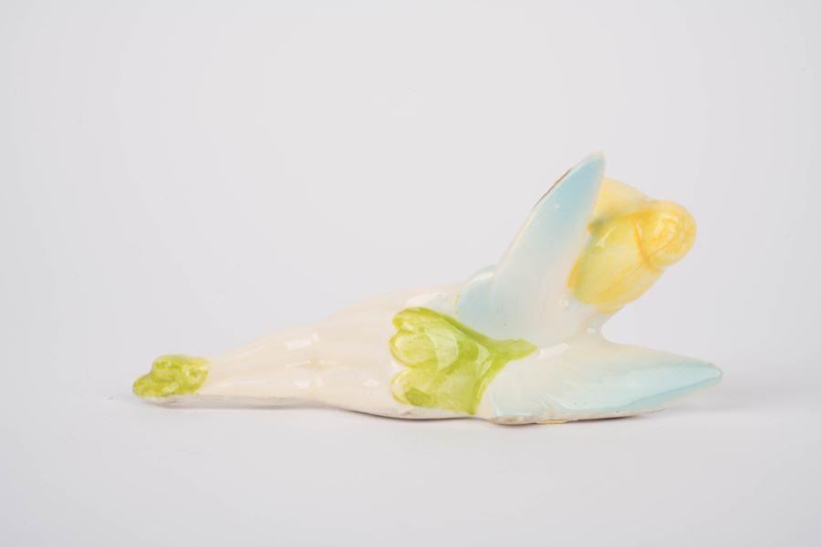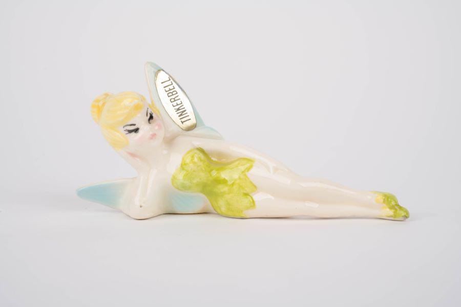(Enesco, 1960s) A ceramic figurine of Tinker Bell from"Peter Pan" manufactured by Enesco and likely sold at Disneyland in the ‘60s. Measuring 4.25" x 1" and 2" tall, the figurine is in very good condition with some minor manufacturing imperfections and some light wear from age.
