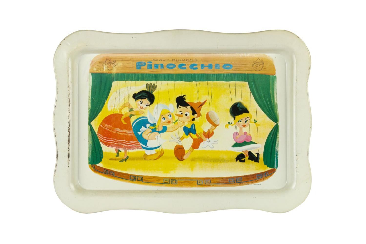 (Disney, 1961) A tin tray featuring Pinocchio surrounded by three of Stromboli’s dancer puppets. Measuring 12.75” x 17.75”, the tray displays in good condition with scratches and scuffs throughout.