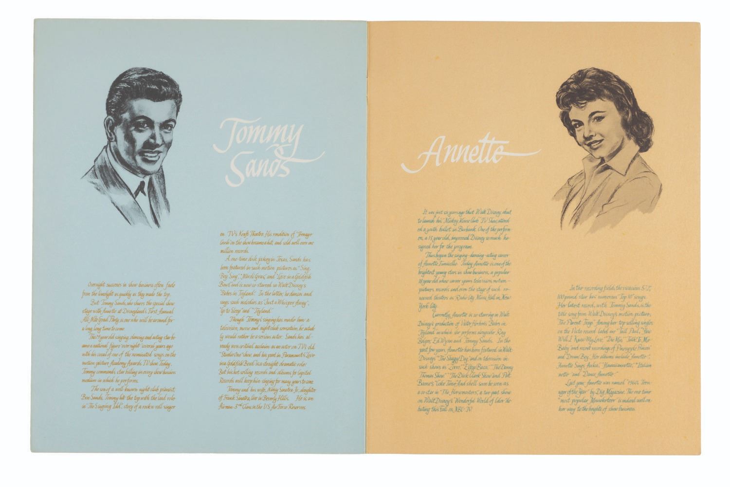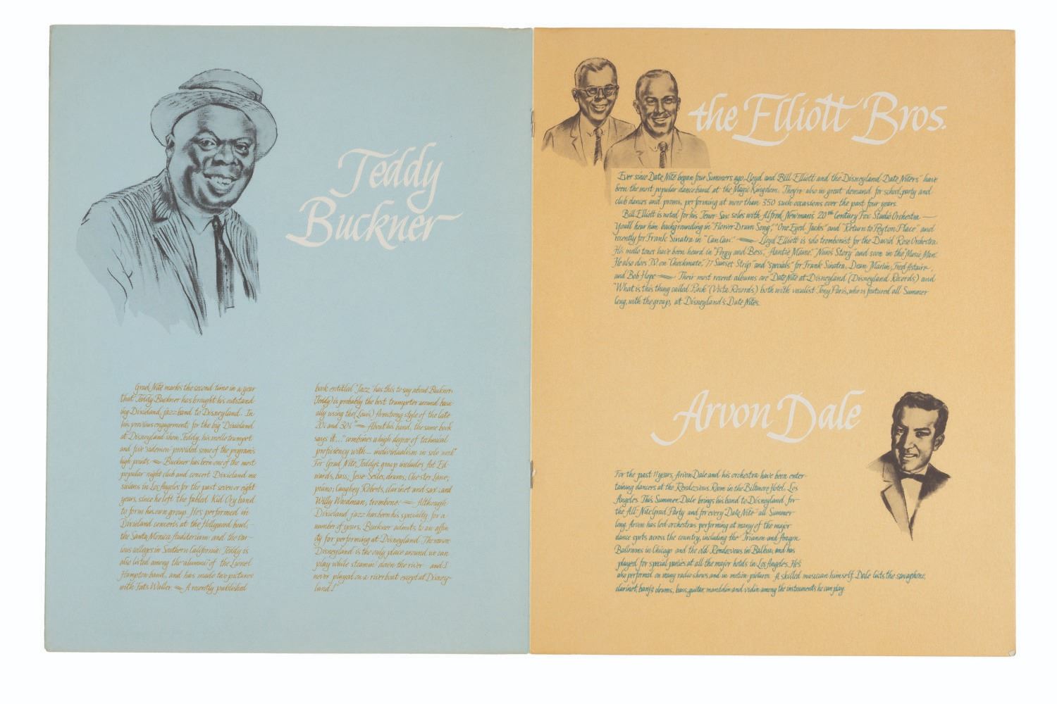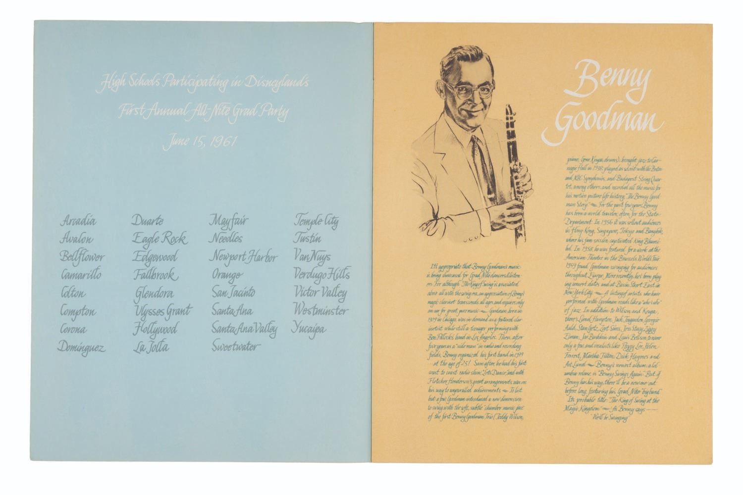 (Disneyland, 1961) A souvenir program from the June 15, 1961, Grad Nite celebration at Disneyland, with a list of the High Schools attending and information on the musical entertainment for the evening. Measuring 8.5" x 11", the program is in good condition with discoloration and wear around the edges due to age, as well as surface wear along the spine.
