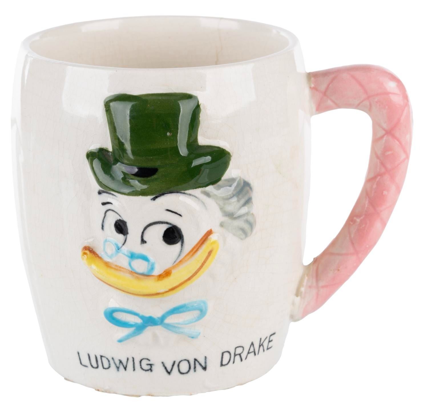 (Disney, 1961) A Ludwig Von Drake mug with a sculpted image of Ludwig Von Drake, the paternal Uncle of the famous Donald Duck. Measuring 3.5" tall and 3" in diameter, the mug is in good condition with crazing throughout and typical handling wear.
