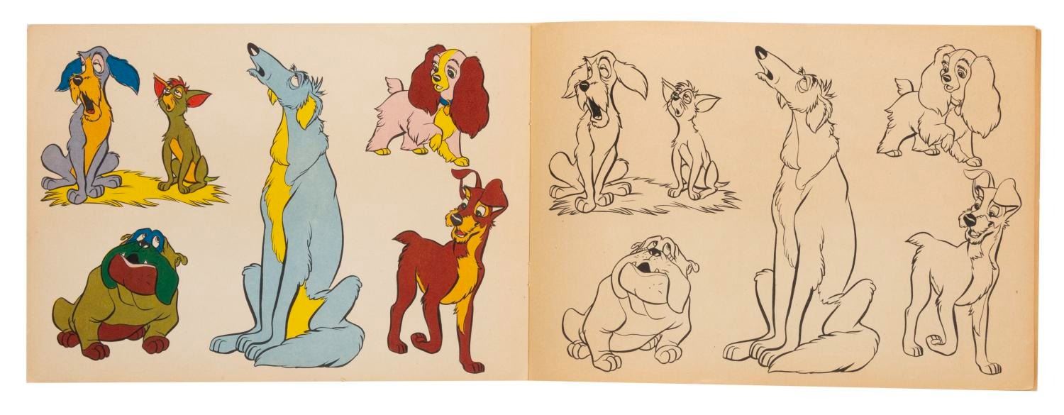 (Leho, 1962) A"Lady and the Tramp" coloring book. Measuring 8" x 11.5", the 16-page book is in very good condition with light wear from handling and age.