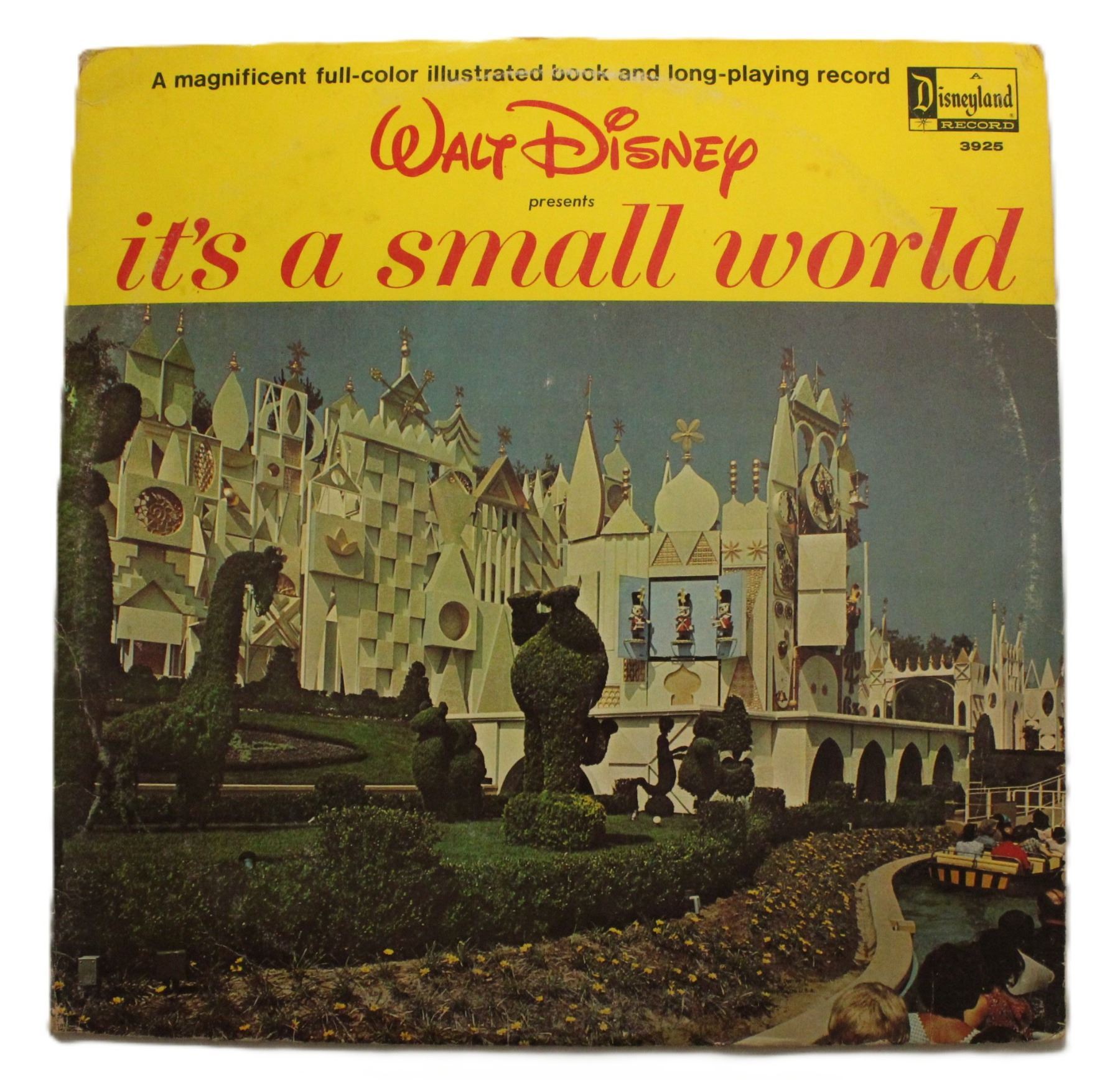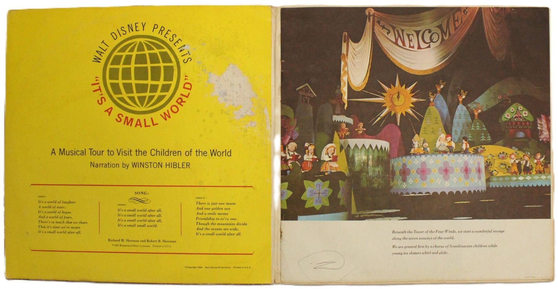 Walt Disney Presents It's a Small World. This record is a musical tour to visit the children of the world. It features the original music by the Sherman brothers and is narrated by Winston Hibler. The sleeve includes a full size, full color insert with images from the ride and narration. Record sleeve shows wear from use and age. Record is in good condition and may have a small scratches from use.