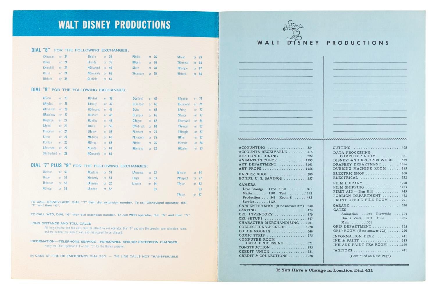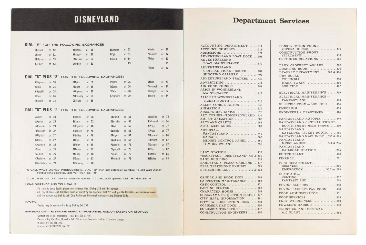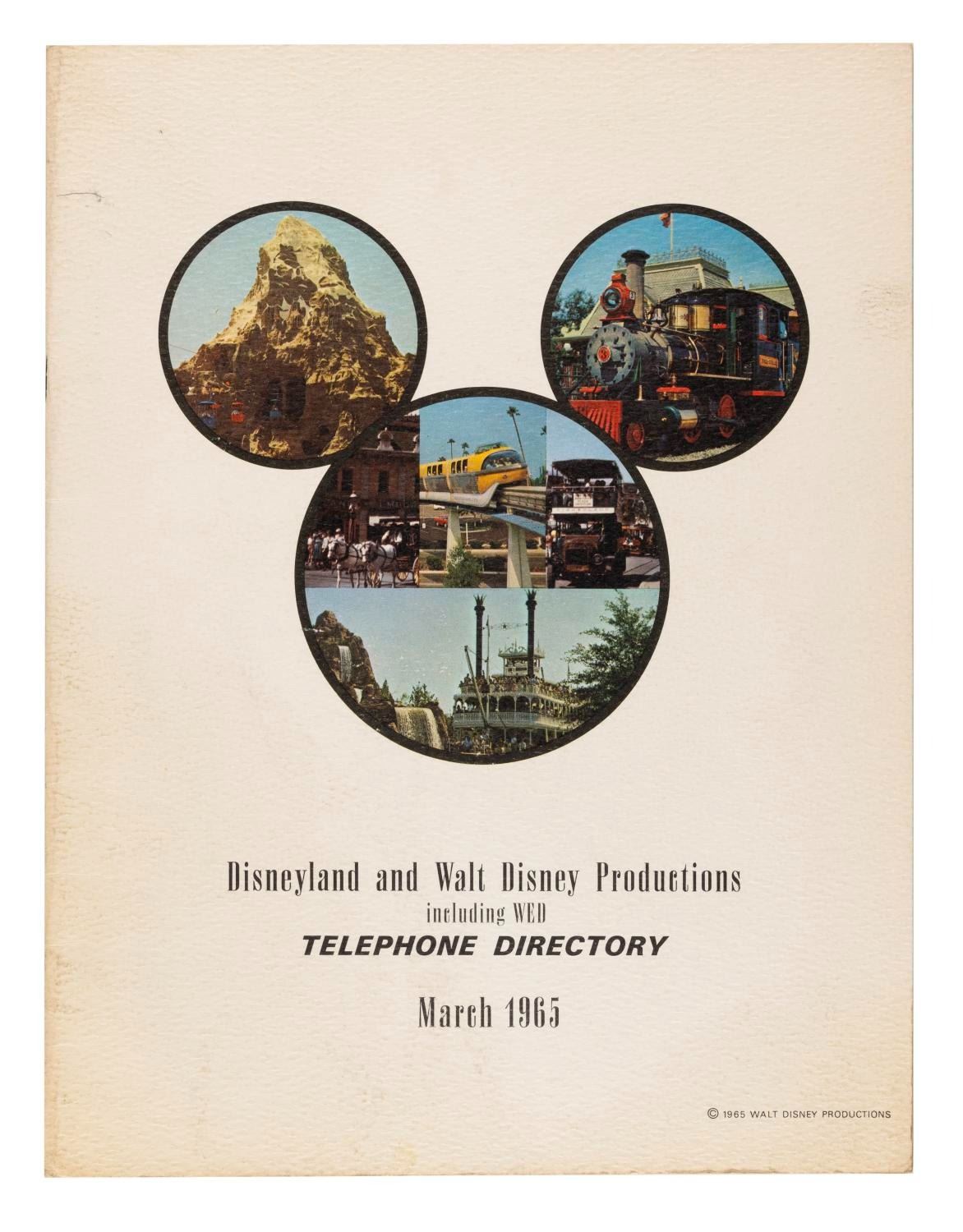 (Disney, 1965) A March 1965 Disneyland and Walt Disney Productions, including WED, Telephone Directory, with pages listing employee phone numbers, department services, lessees, exhibitors, and contractors, with general information about dialing. Measuring 8.5" x 11", the directory is in good condition with edge wear, smudges, and discoloration throughout.