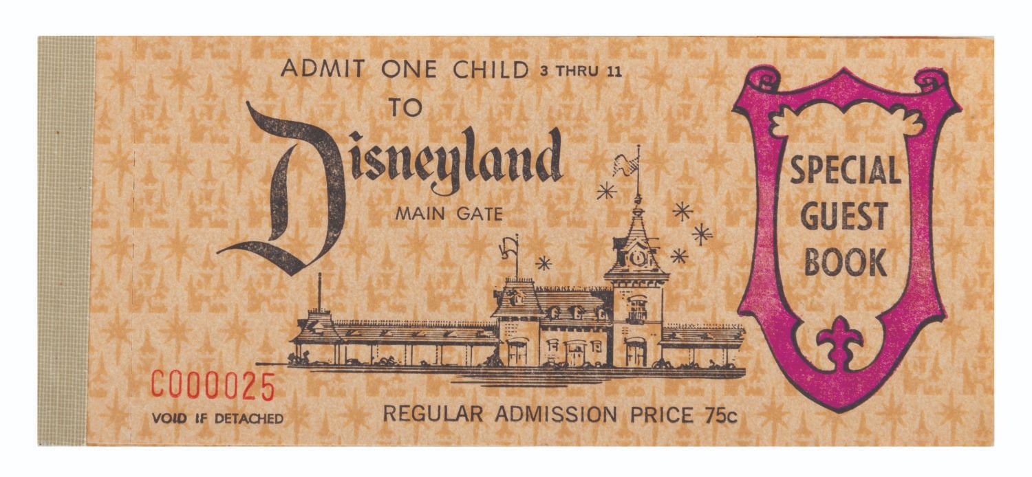 (Disneyland, 1966) A complete Child Special Guest 12 ticket book from May of 1966. Numbered “C000025”, the book includes the front Main Gate ticket, a Welcome to Disneyland tab, a Great Moments With Mr. Lincoln ticket, 4 “E” tickets, 3 “D” tickets, 3 “C” tickets, 1 “B” ticket, and 1 “A” ticket. Measuring 2.5” x 6”, the ticket book is in very good condition with wear to the back cover.