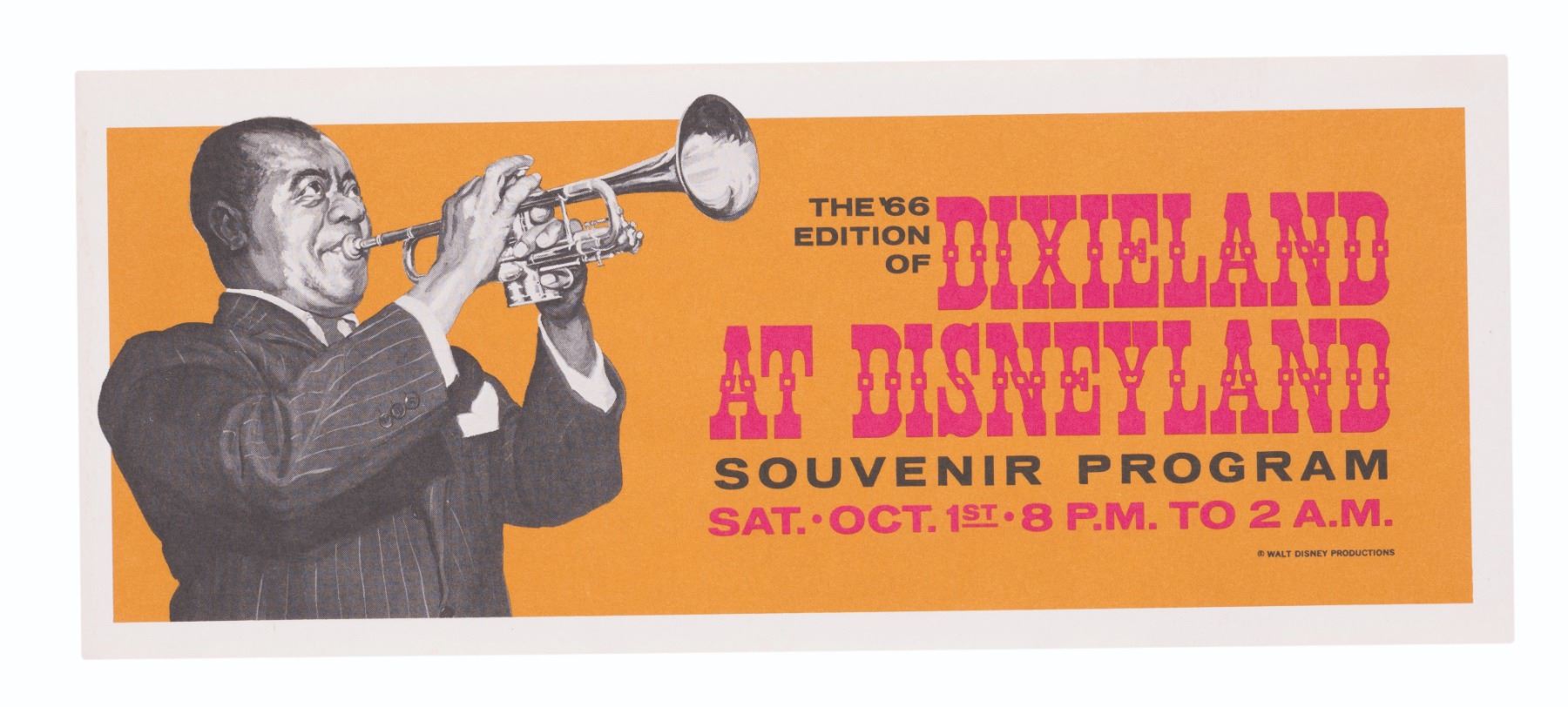 (Disneyland, 1966) A souvenir program of the 1966 edition of Dixieland at Disneyland. A rare piece of admission media, this bifold brochure features monochromatic imagery of headliner Louie "Satchmo" Armstrong and lists the evening's entertainers with areas of appearance inside. Measuring 8.5"x3.5" folded, the vintage piece is in very good condition with only slight yellowing and minor wear along edges and corners from age and handling.