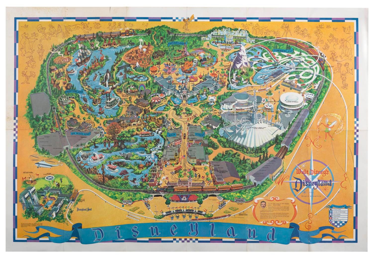 (Disneyland, 1966) A large souvenir map of Disneyland from 1966. This map was the first to feature the New Tomorrowland and World's Fair attractions It's a Small World and Great Moments With Lincoln. Measuring 45"x30", the map is in very good condition with light wear along original folds including small scuffs to exterior folds, light spotting visible in the left upper and center borders, and hairline 1" cuts to top and bottom edges.