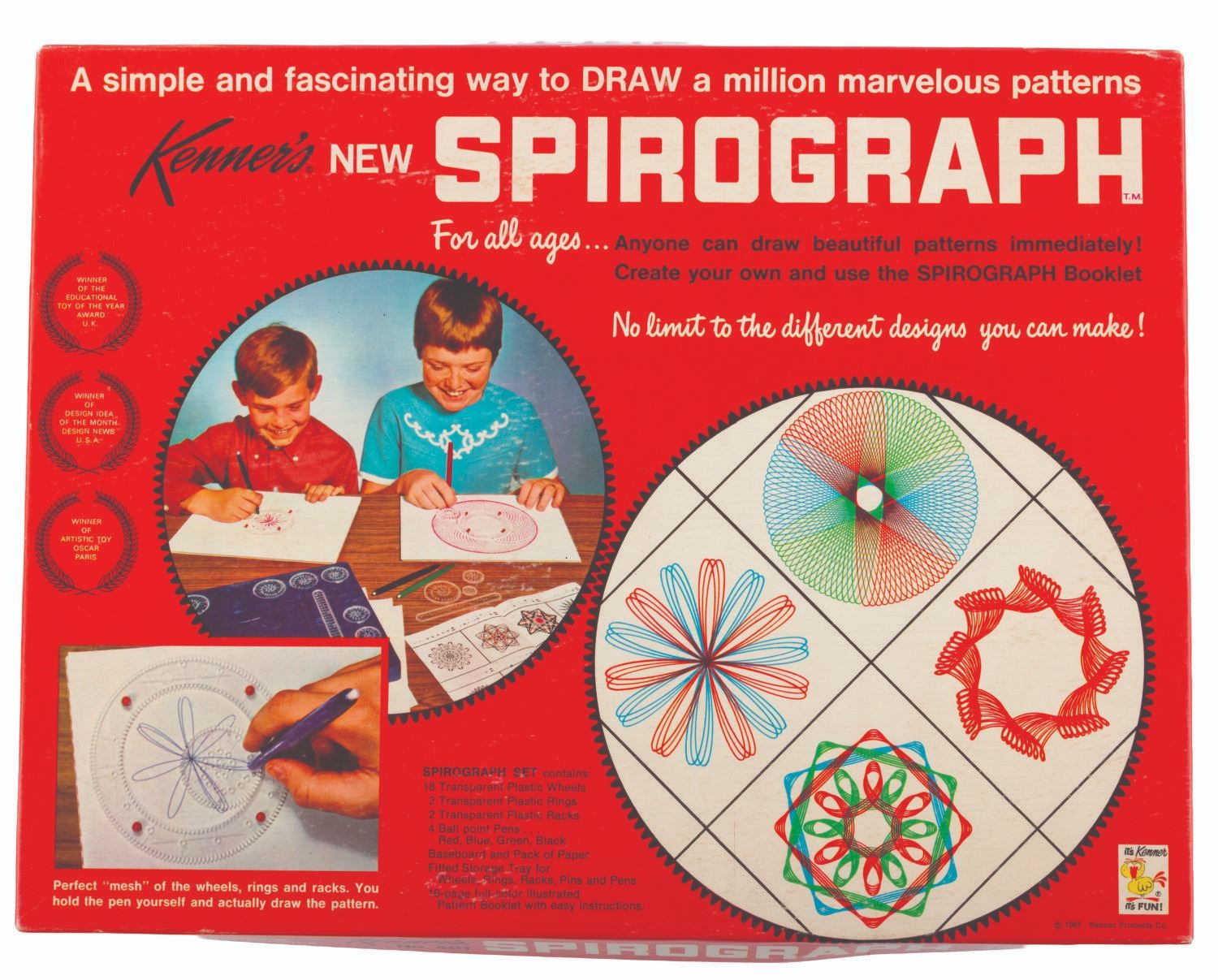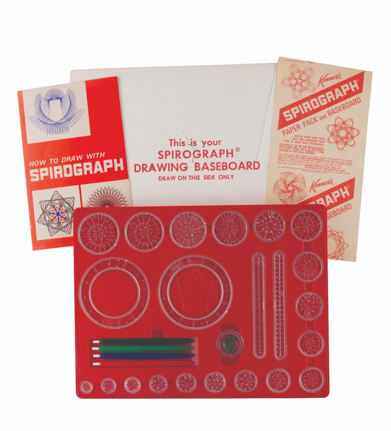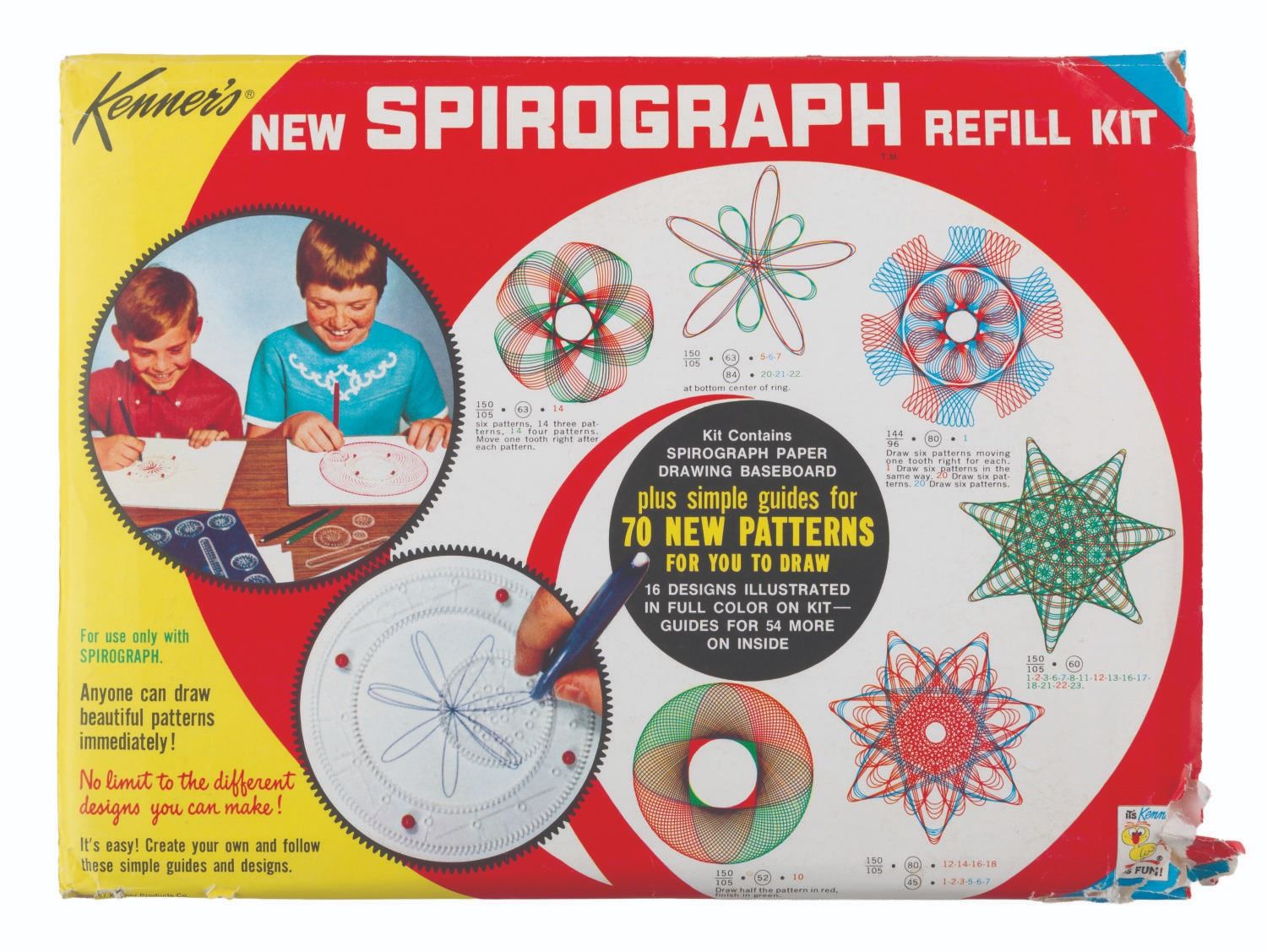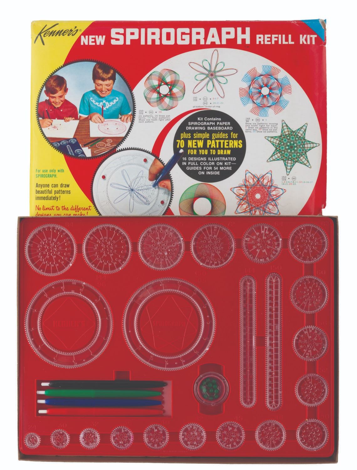 (Kenner, 1967) A complete original spirograph set and refill kit. The set includes the instruction book and all original parts, with the refill kit providing 70 new patterns to draw, extra paper, and an extra baseboard. The set is overall in very good condition, with typical light wear from age, spots of paper loss to the refill pack envelope, and light scuffs to the box from age. The four original ballpoint pens display well, but are non-functional from age and easily replaceable.