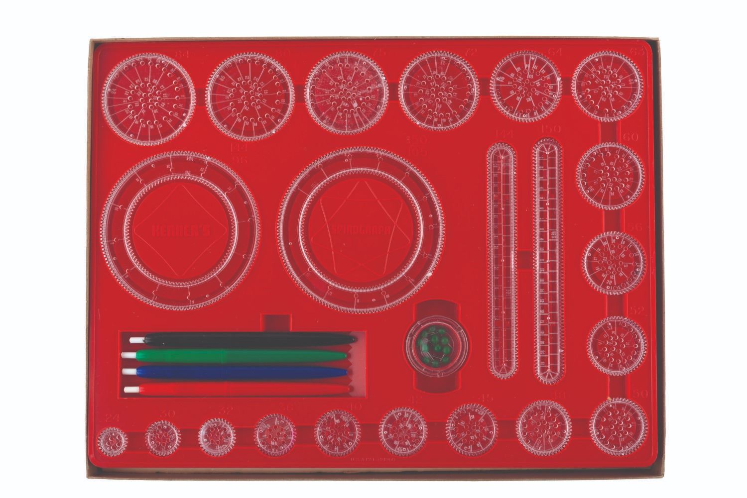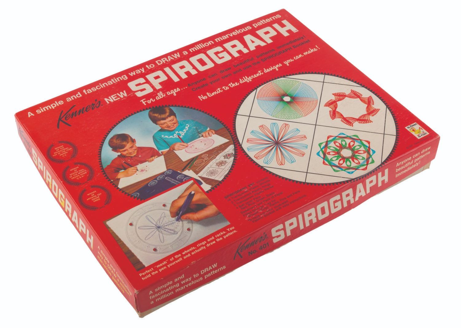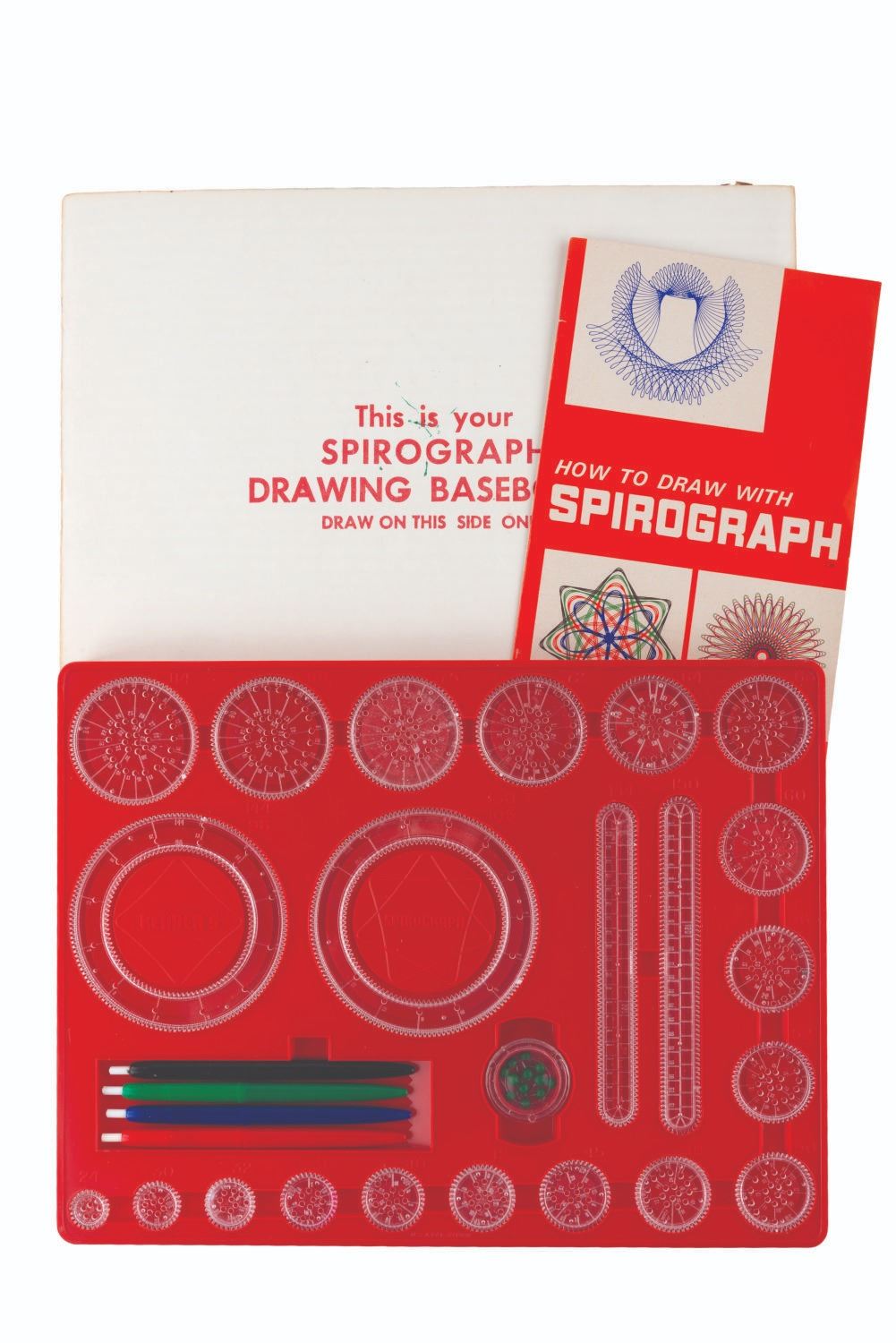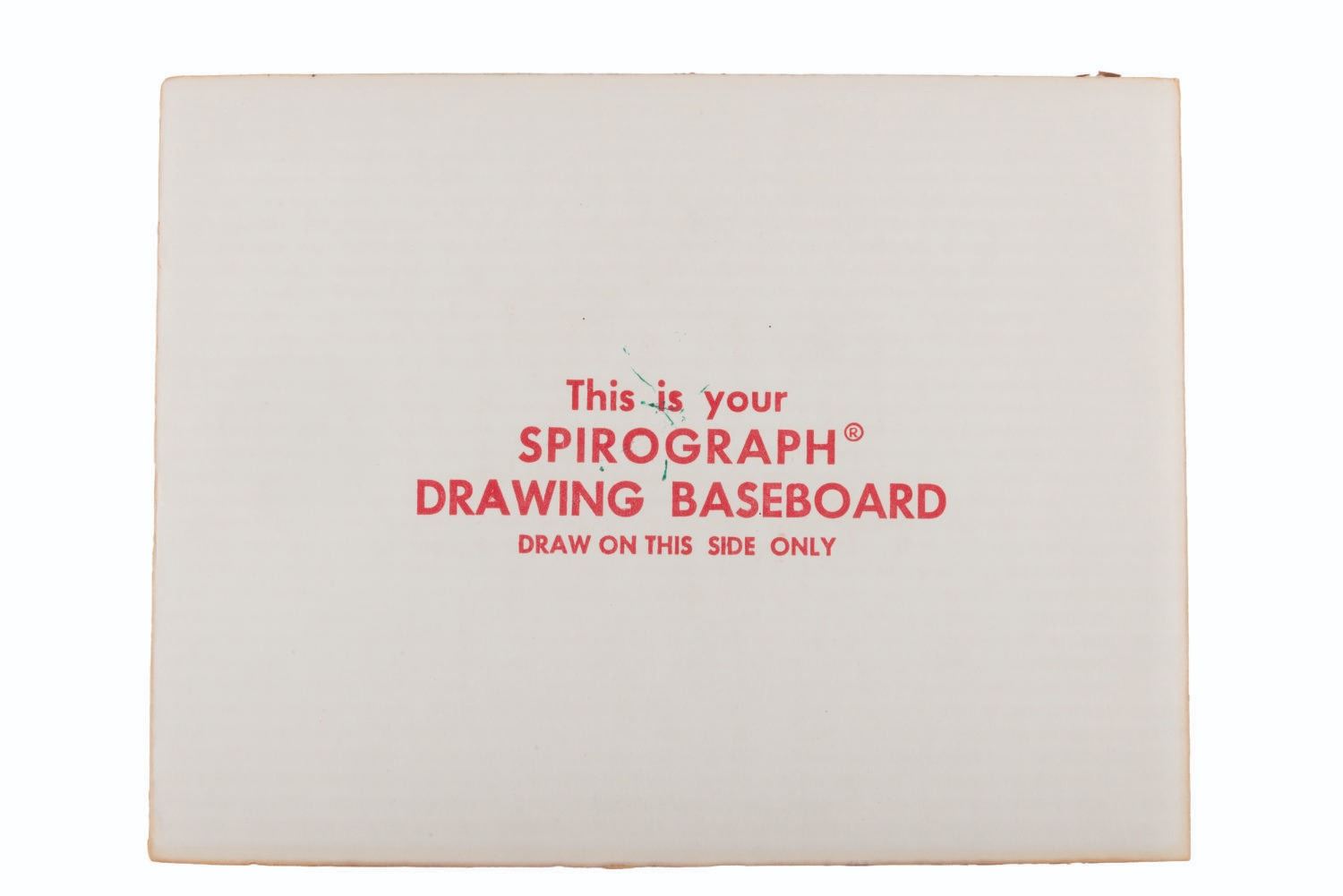 (Kenner, 1967) A complete original spirograph set and refill kit. The set includes the instruction book and all original parts, with the refill kit providing 70 new patterns to draw, extra paper, and an extra baseboard. The set is overall in very good condition, with typical light wear from age, spots of paper loss to the refill pack envelope, and light scuffs to the box from age. The four original ballpoint pens display well, but are non-functional from age and easily replaceable.