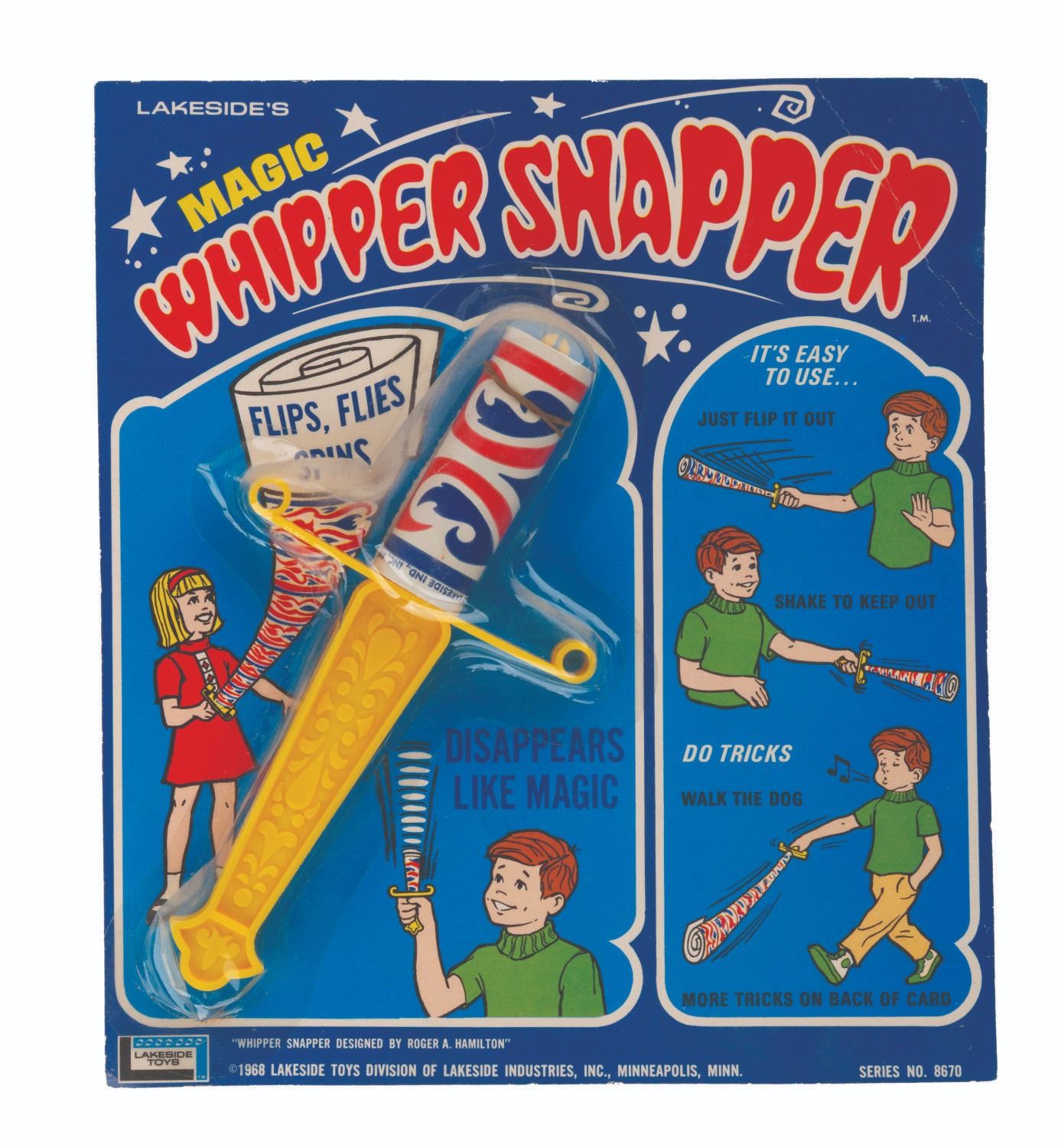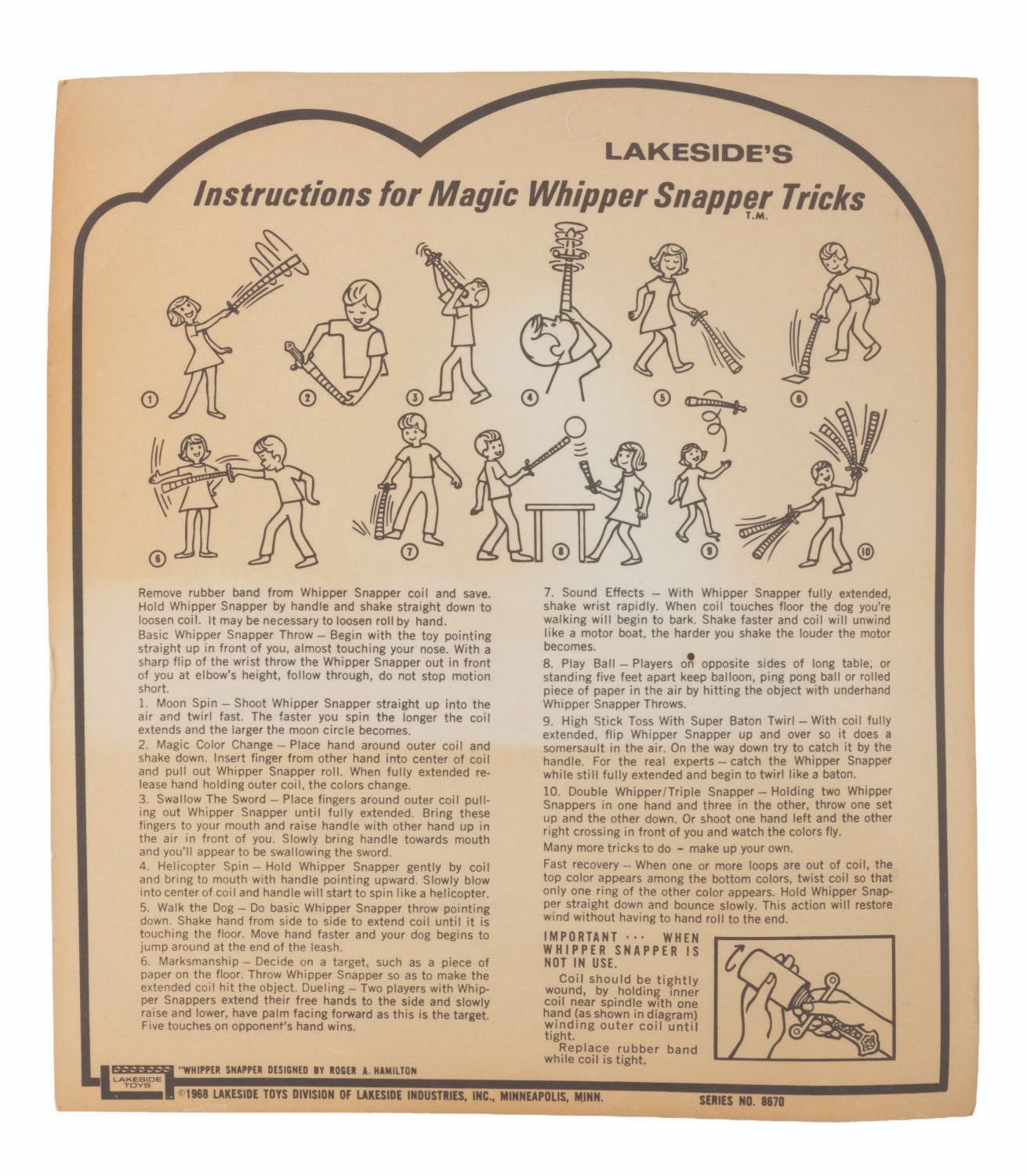 (Lakeside, 1967) A Magic Whipper Snapper toy by Lakeside, on the original card. This plastic coil toy details how to do yo-yo style tricks on the back of the card. The toy is in fine condition, with the unpunched sealed card in very good condition with light creasing to the plastic bubble at some corners.