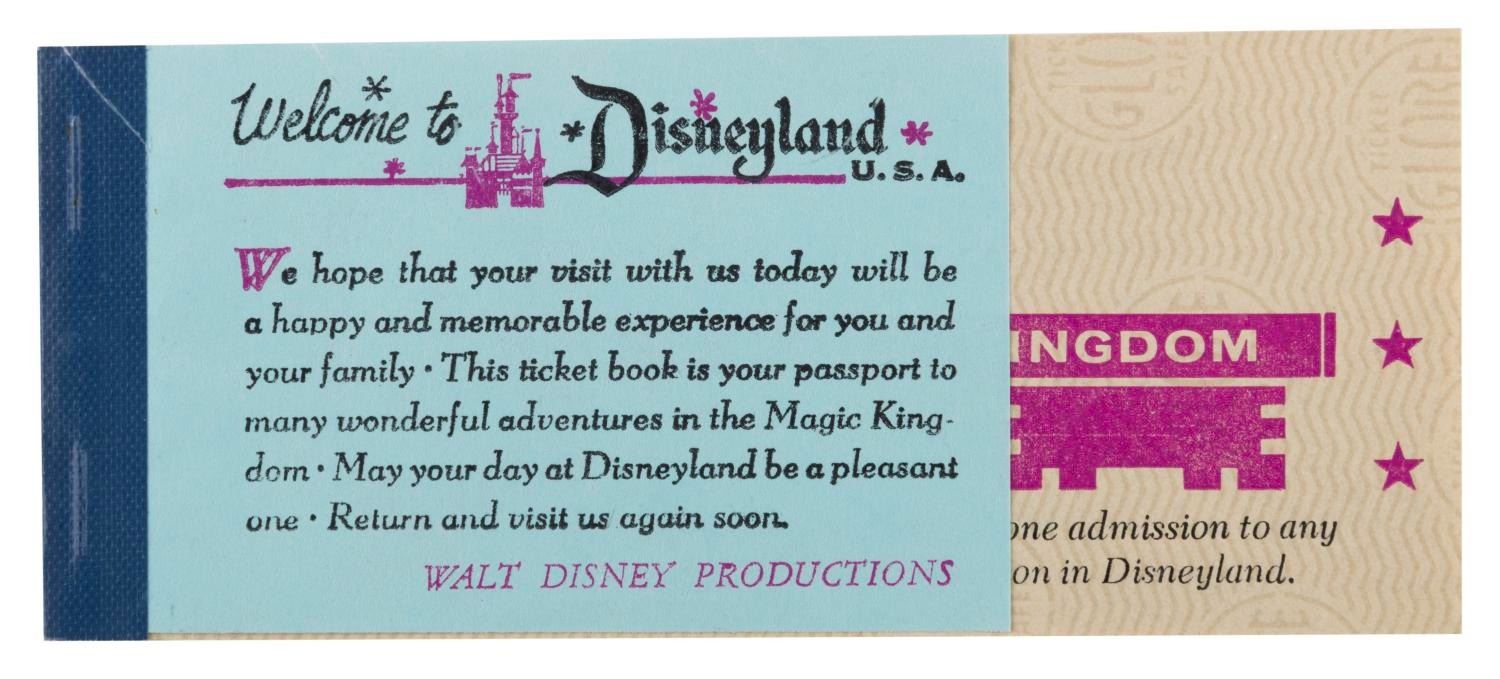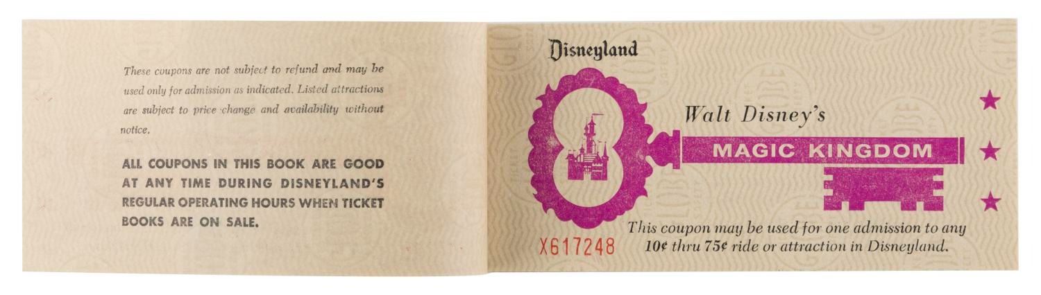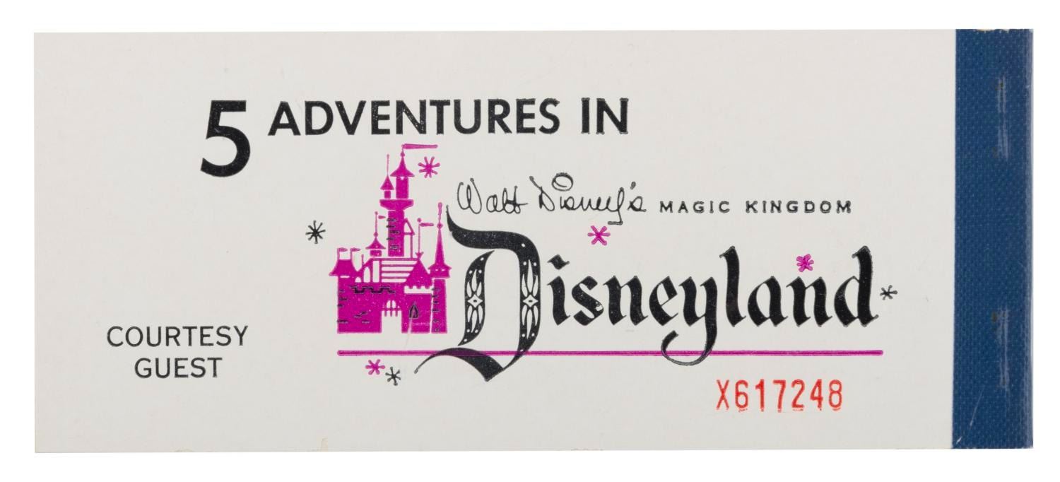 (Disneyland, 1968-69) A Disneyland Courtesy Guest 5 Adventures Ticket Book from 1968 or 1969. The complete book includes the Welcome to Disneyland tab and five coupons good for any"A" thru"E" attraction. The book lists The Pirates of the Caribbean in New Orleans Square, but not the Haunted Mansion, which opened in 1969. Numbered X617248, the 2.5" x 6" booklet is in very good to fine condition.
