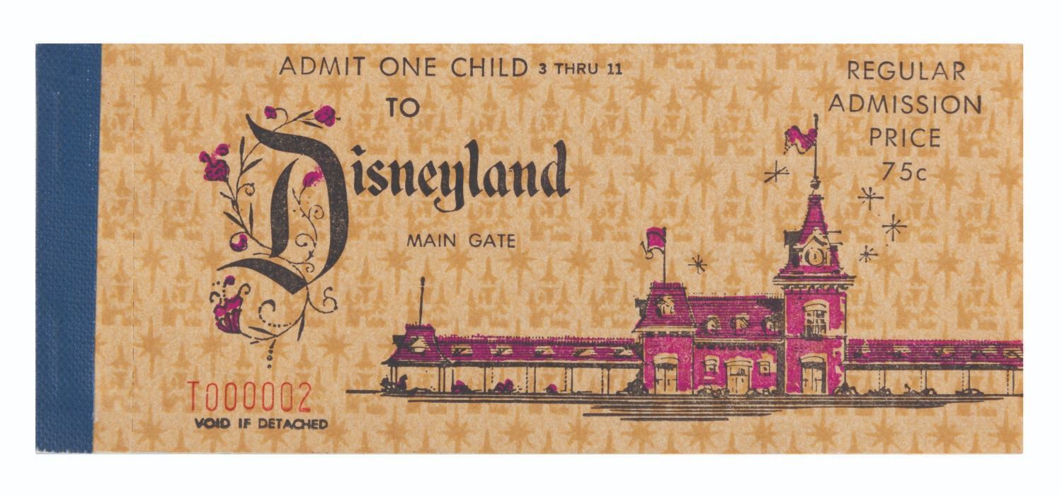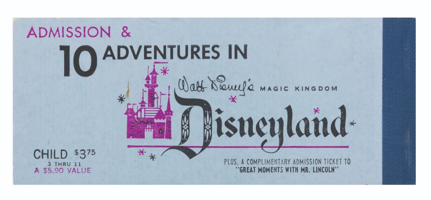 (Disneyland, 1968) A complete Child 10 ticket book from May of 1968. This book includes the front Main Gate ticket, a Welcome to Disneyland tab, a Great Moments With Mr. Lincoln ticket, an Adventure Thru Inner Space ticket, 3 “E” tickets, 3 “D” tickets, 2 “C” tickets, 1 “B” ticket, and 1 “A” ticket. Numbered “T000002,” the 2.5” x 6” ticket book is in fine condition with very light wear to the back cover.