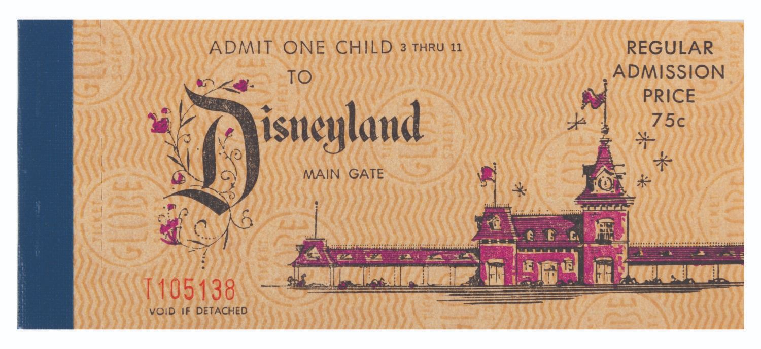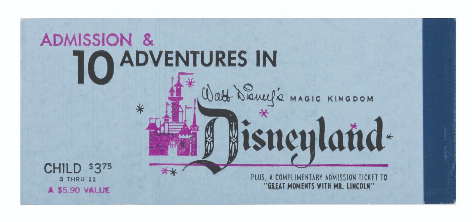 (Disneyland, 1968) A complete Child 10 ticket book from October 1968. This book includes the front Main Gate ticket, a Welcome to Disneyland tab, a Great Moments With Mr. Lincoln ticket, 3 “E” tickets, 3 “D” tickets, 2 “C” tickets, 1 “B” ticket, and 1 “A” ticket. Numbered “T105138”, the 2.5” x 6” ticket book is in fine condition.