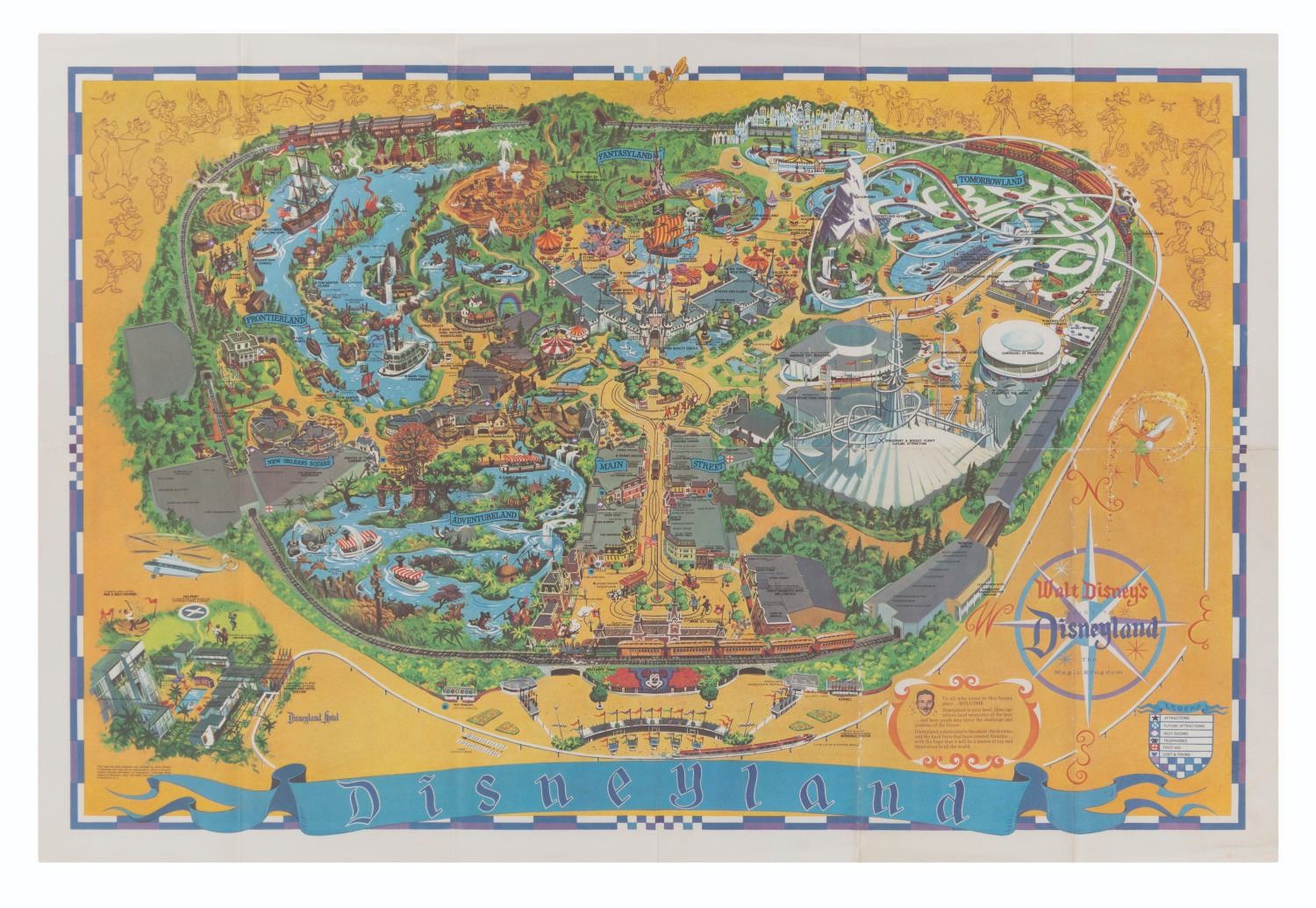 (Disneyland, 1968) A large souvenir Disneyland Park map from 1968, the first to show Adventure Thru Inner Space and to omit the House of the Future. Measuring 30” x 44.25”, the map displays in very good condition with stains, edge wear, scrapes along the fold on the right side, and intentional folds from how the map was originally sold and stored.