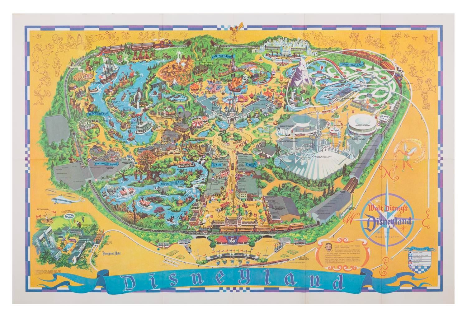 (Disneyland, 1968) A large souvenir Disneyland Park map from 1968, the first to show Adventure Thru Inner Space and to omit the House of the Future. Measuring 30” x 45”, the map displays in very good condition with creases, edge tears, wear along the original folds, and spots of discoloration from age.