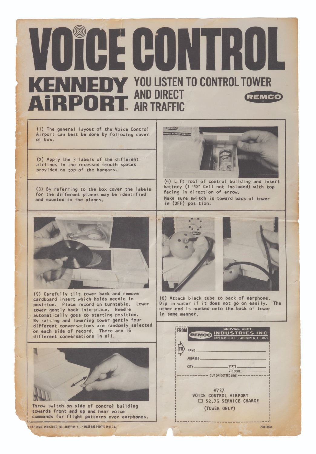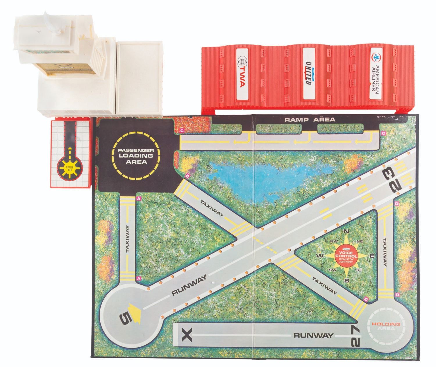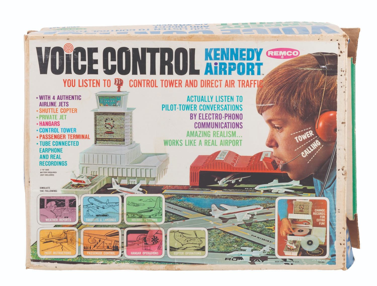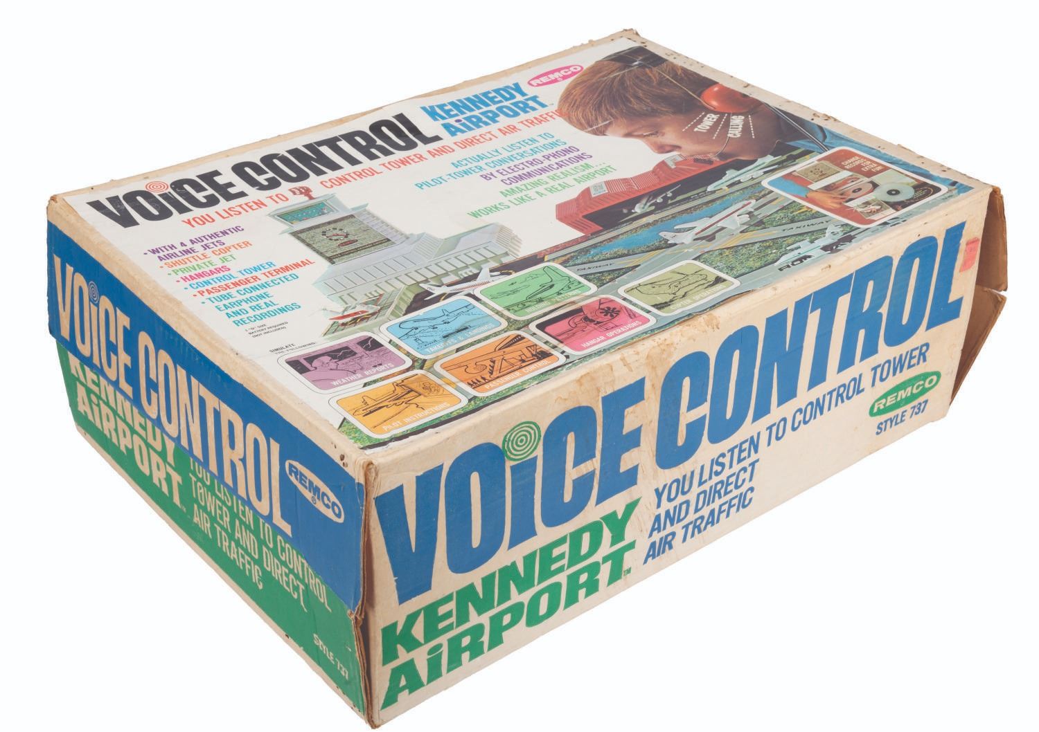 (Remco, 1968) A complete Voice Control Kennedy Airport playset in the original box. The set contains an airfield board, control tower, passenger terminal, hangars, four jets, a shuttle helicopter, a tube-connected headset, and two records of control tower conversations to listen to on the built-in player. Tested for function with one"D" battery (not included), the player is non-working. Also included are the original instruction sheet, and all decals for the planes, though they've come loose over time. In the box measuring 19.5" x 14" x 7", the playset is in fair to good condition, with wear from use and age, including browning and chipping to the instruction sheet, and wear, including creases, staining, and paper loss to the box.
