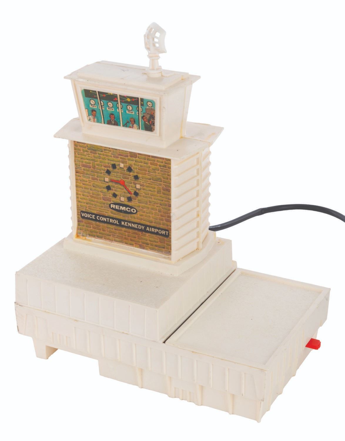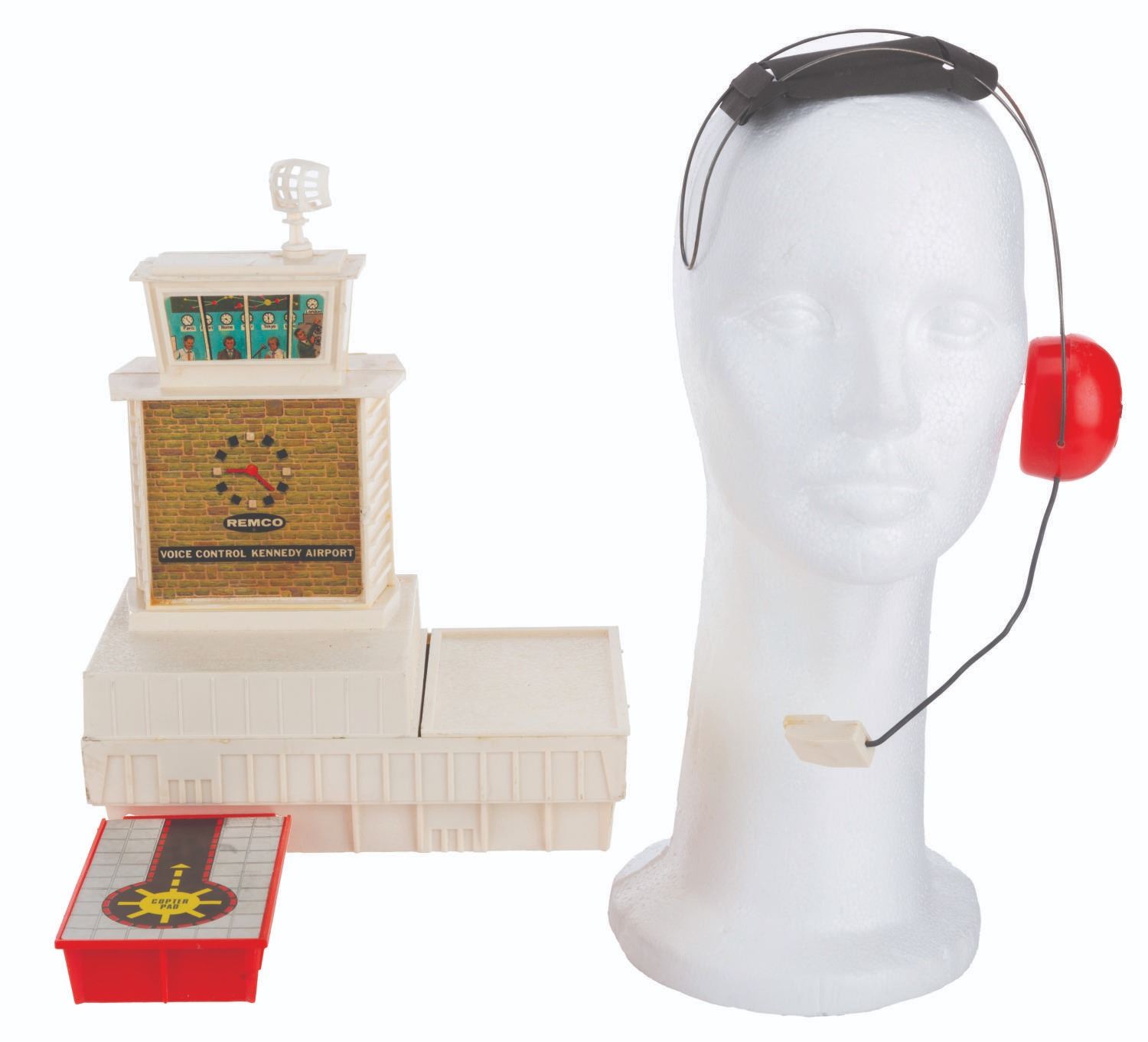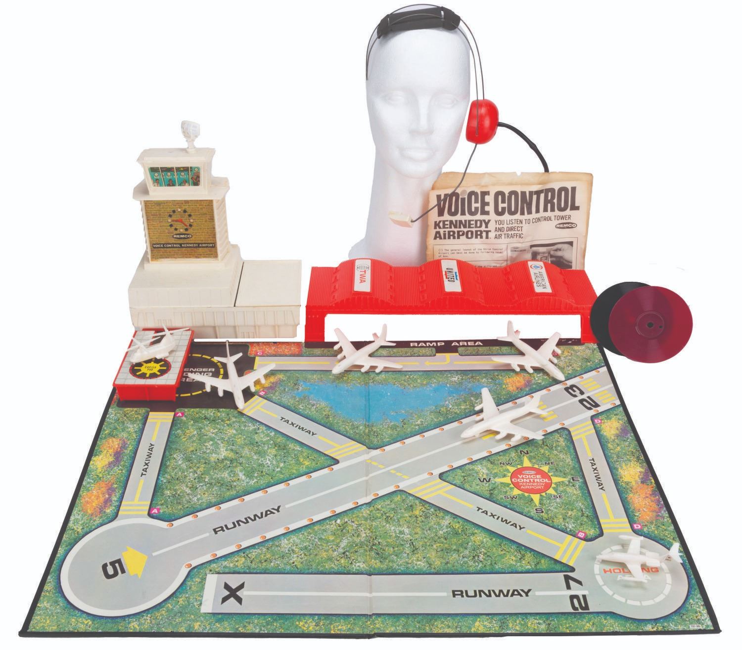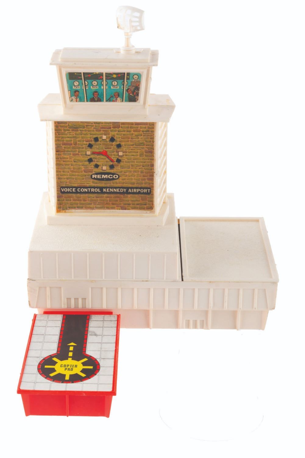 (Remco, 1968) A complete Voice Control Kennedy Airport playset in the original box. The set contains an airfield board, control tower, passenger terminal, hangars, four jets, a shuttle helicopter, a tube-connected headset, and two records of control tower conversations to listen to on the built-in player. Tested for function with one"D" battery (not included), the player is non-working. Also included are the original instruction sheet, and all decals for the planes, though they've come loose over time. In the box measuring 19.5" x 14" x 7", the playset is in fair to good condition, with wear from use and age, including browning and chipping to the instruction sheet, and wear, including creases, staining, and paper loss to the box.
