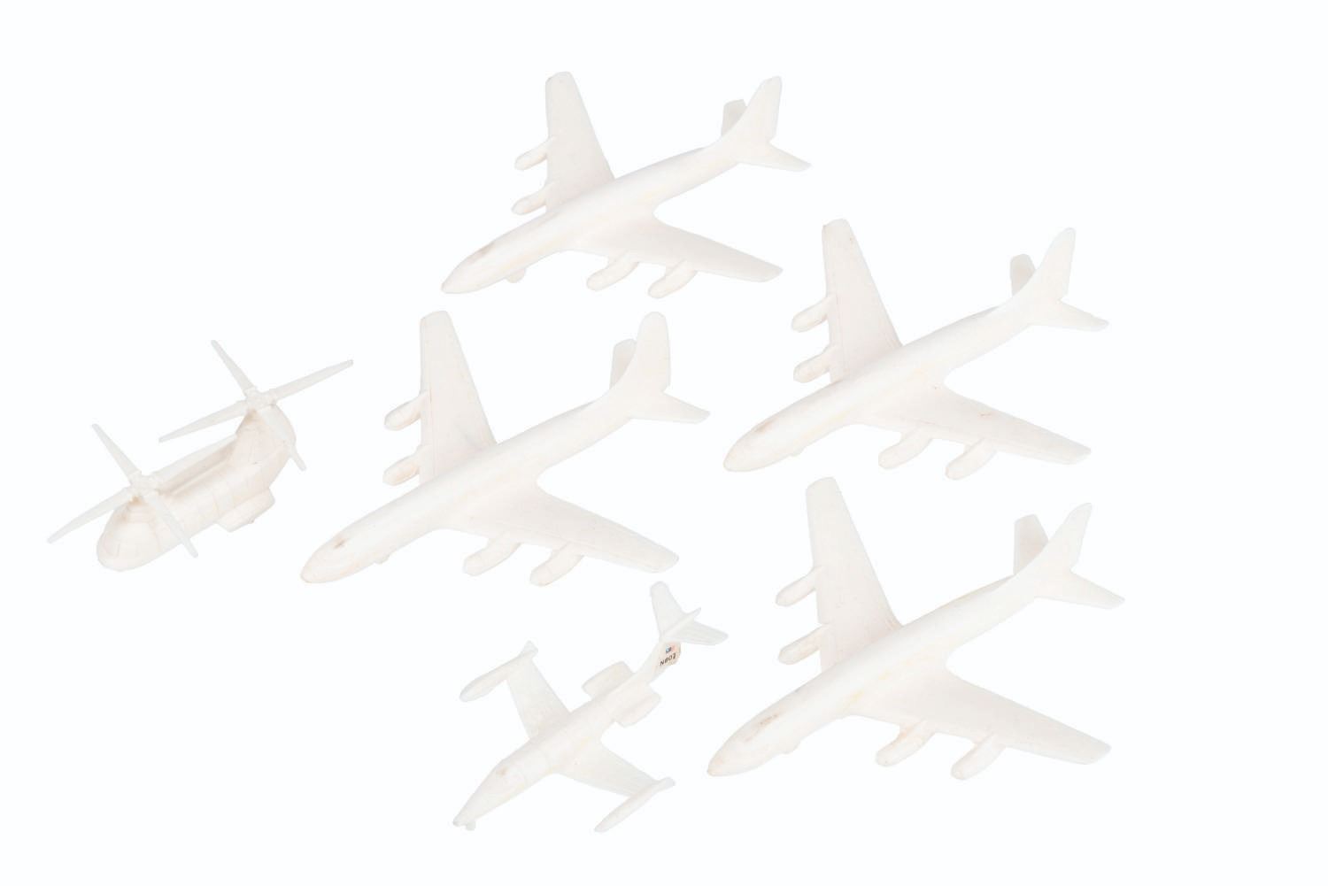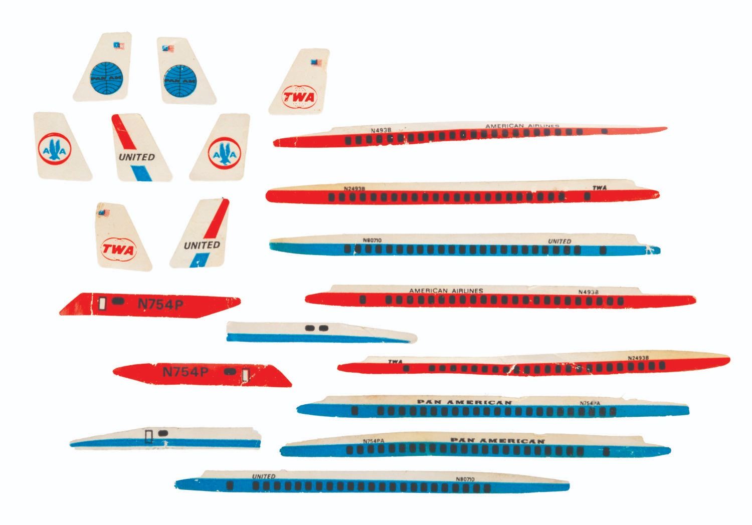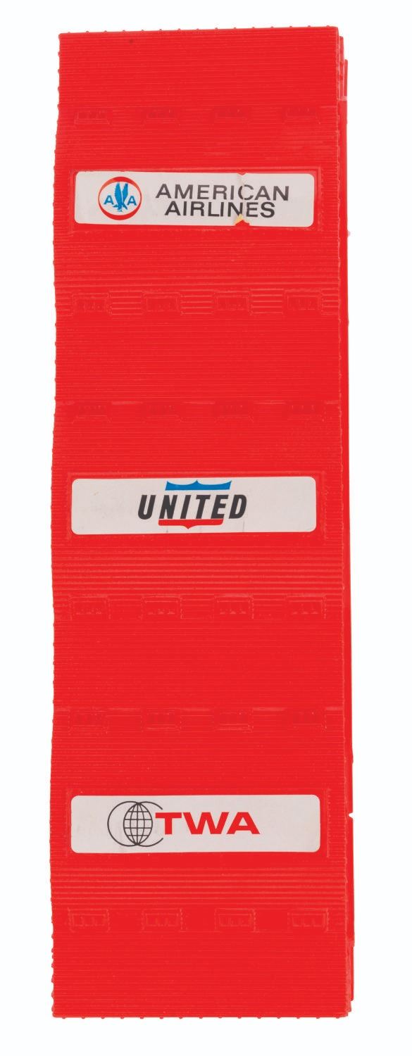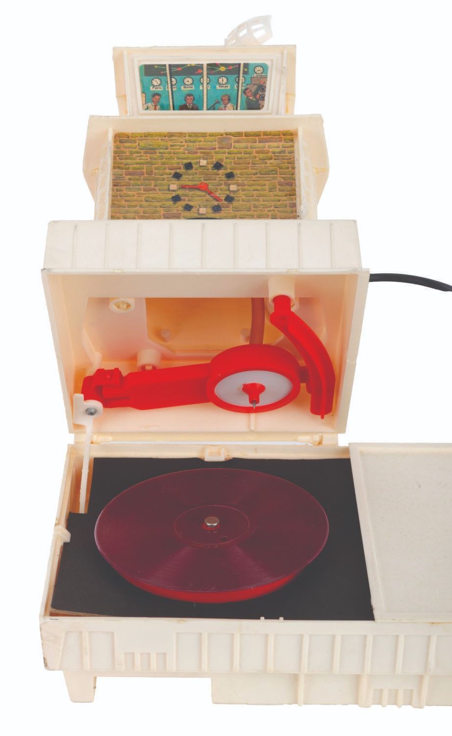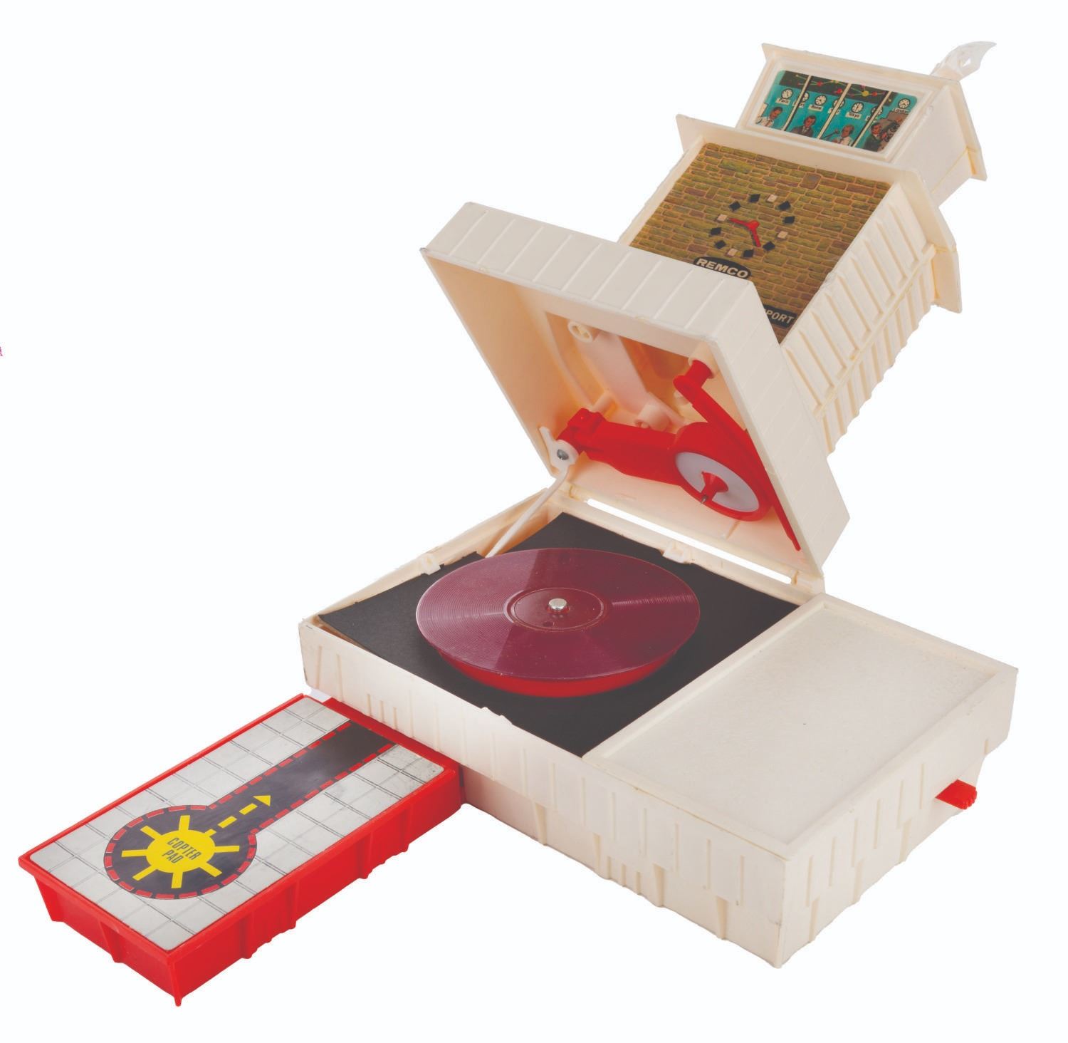(Remco, 1968) A complete Voice Control Kennedy Airport playset in the original box. The set contains an airfield board, control tower, passenger terminal, hangars, four jets, a shuttle helicopter, a tube-connected headset, and two records of control tower conversations to listen to on the built-in player. Tested for function with one"D" battery (not included), the player is non-working. Also included are the original instruction sheet, and all decals for the planes, though they've come loose over time. In the box measuring 19.5" x 14" x 7", the playset is in fair to good condition, with wear from use and age, including browning and chipping to the instruction sheet, and wear, including creases, staining, and paper loss to the box.