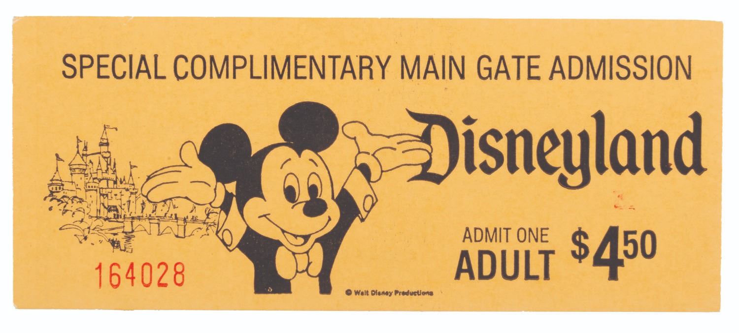 (Disneyland, 1970) A Special Complimentary Disneyland Main Gate Adult Admission Ticket from 1970. Numbered 164028 and measuring 2” x 5”, the ticket is in very good unused condition with light wear.