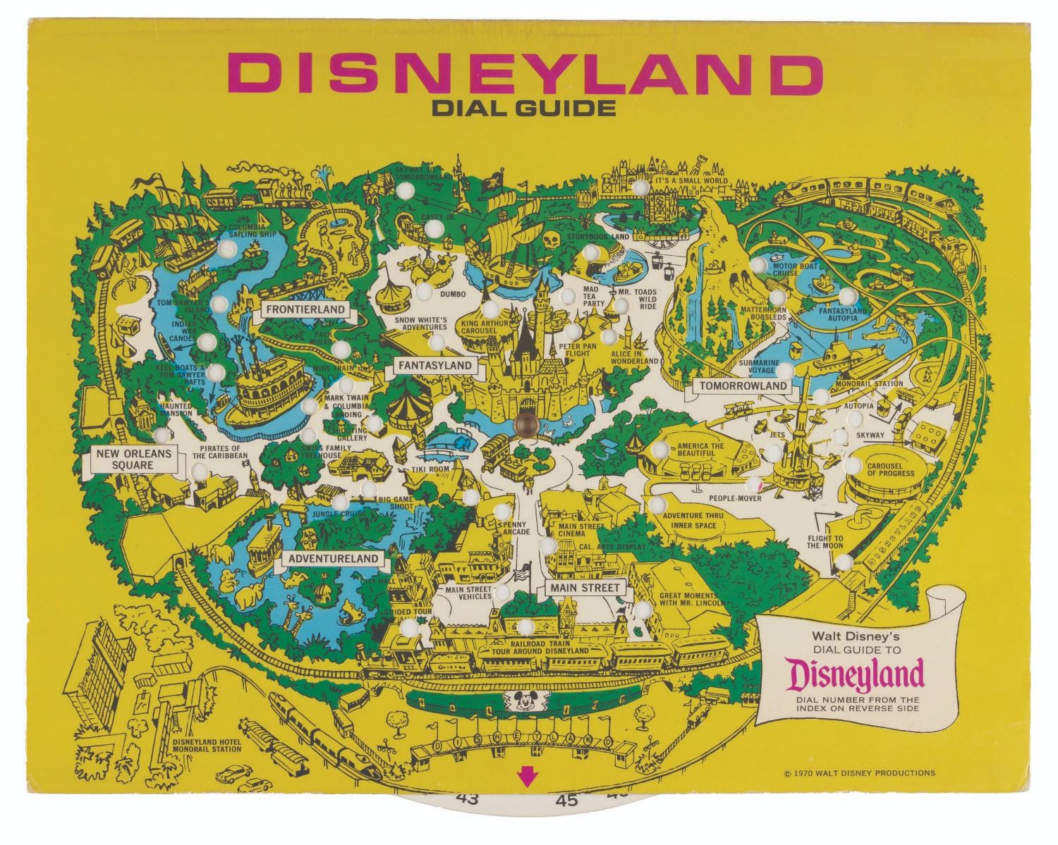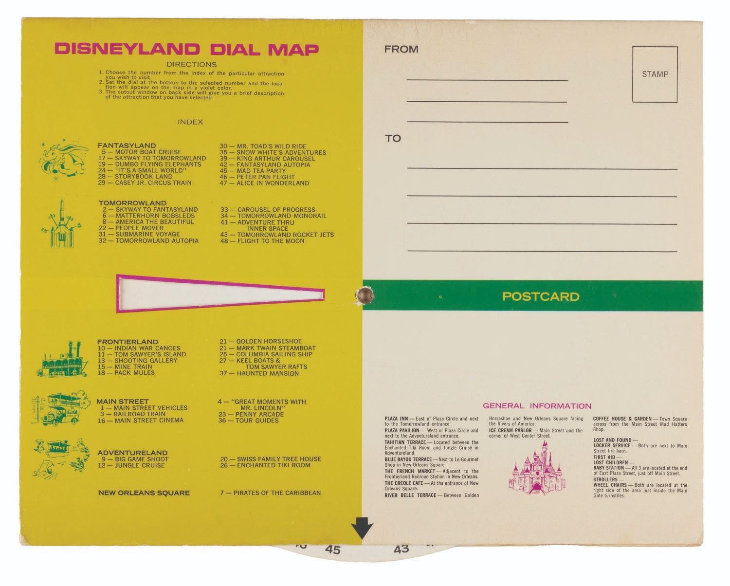 (Disneyland, 1970) A rotating dial guide with a map of Disneyland and a list of the Park's attractions. Each attraction is given a number on the back, and by spinning the dial, the map highlights the location of the selected attraction. Measuring 8.75" x 11", the map is in good working condition with edge wear, and a soft horizontal crease across the back.