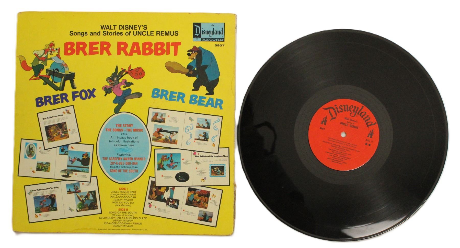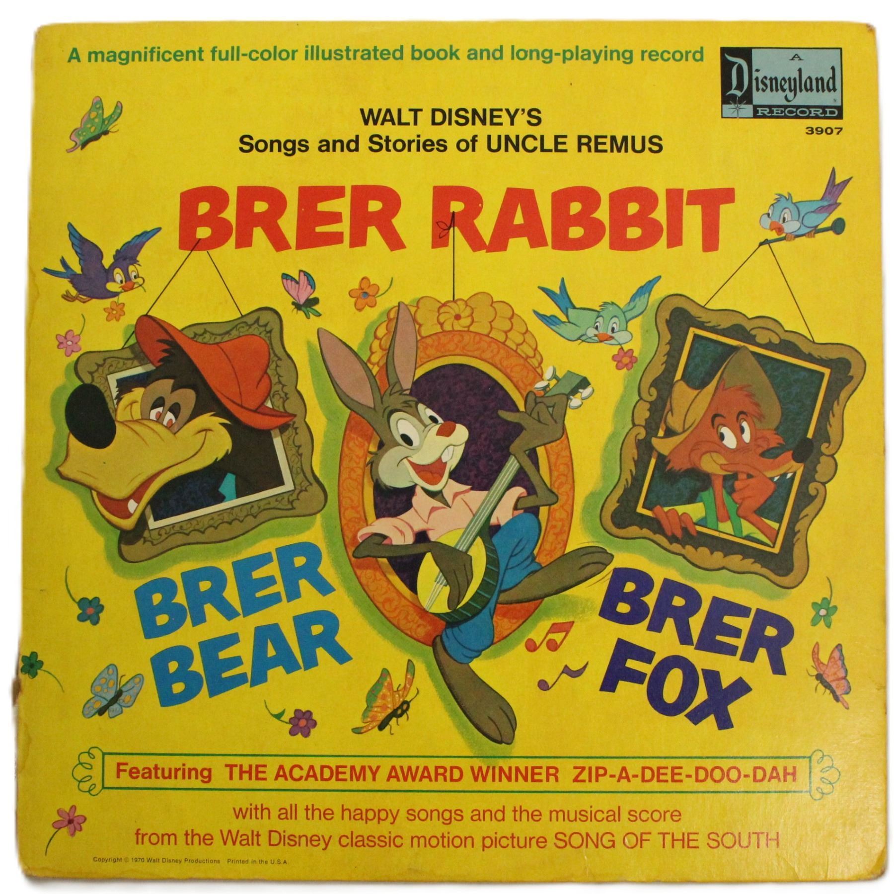 Walt Disney's Songs and Stories of Uncle Remus Features a big 11-page book of full color illustrations in good condition for its age with some small tears and separation from the binding. The sleeve is in good condition does show wear from age and use. The record is in great condition and may have small scratches from use. From the Movie Song of the South, it includes the Academy award winning song "Zip-A-Dee-Doo-Dah" later used in the beloved ride Splash Mountain.
