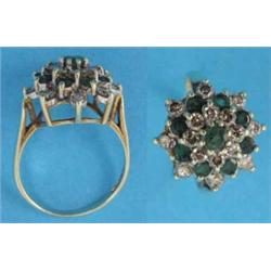 A 1970's emerald and diamond circular cluster cocktail ring, claw-set in 14k gold £180-220