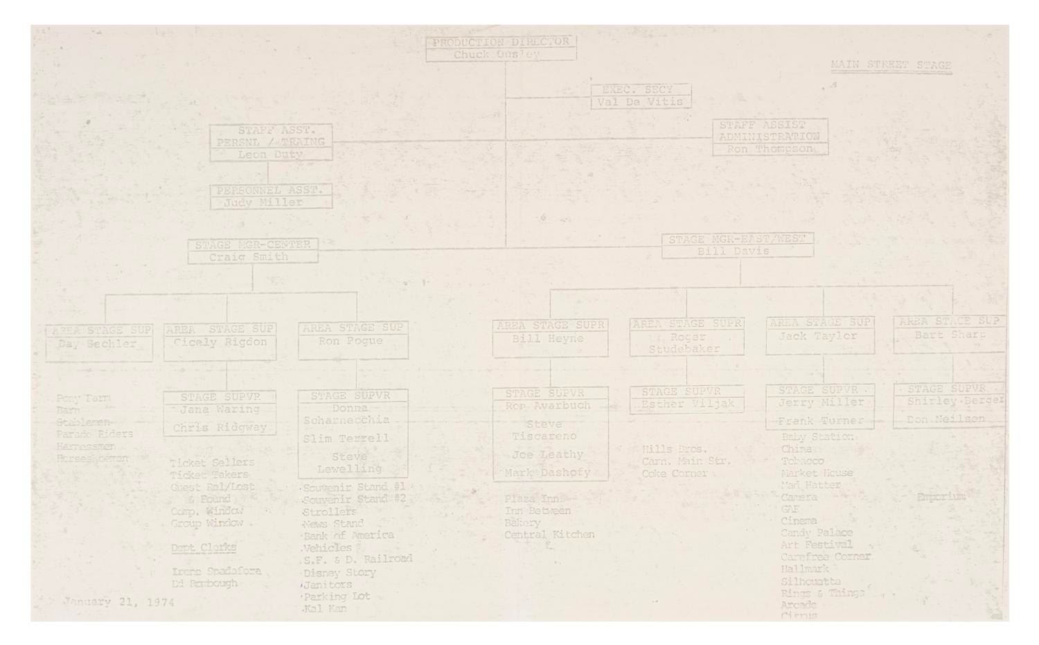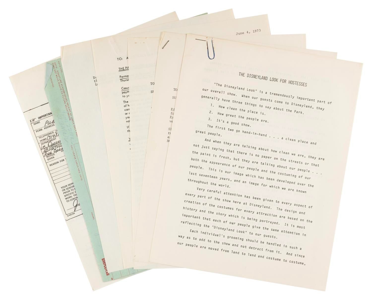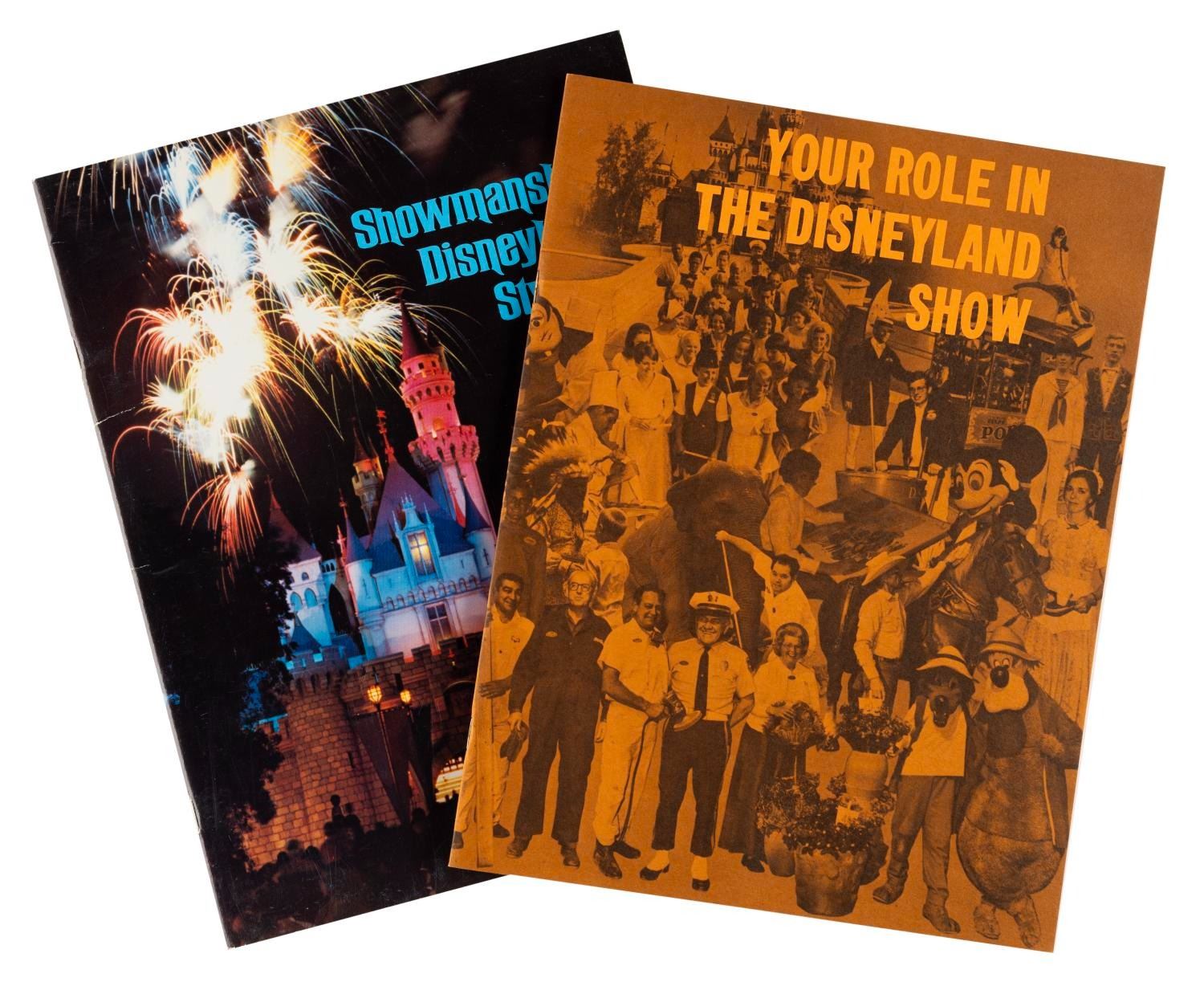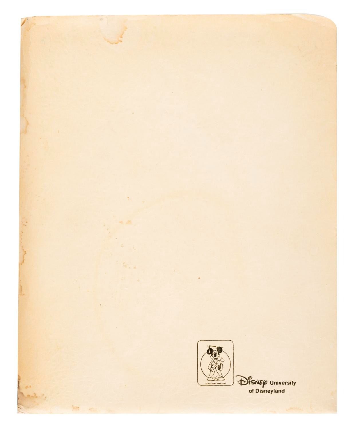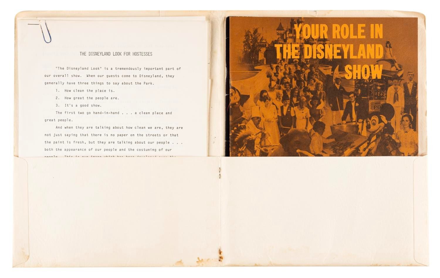 (Disneyland, 1970s) A Disney University folder full of hiring and history documents from Disneyland, including "Your Role in the Disneyland Show" and "Showmanship ... Disneyland Style" Cast Member Booklets. Measuring 9.5" x 11.5" overall, the folder is in fair condition with much wear including stains, while the papers and booklets are in very good condition with light handling wear.