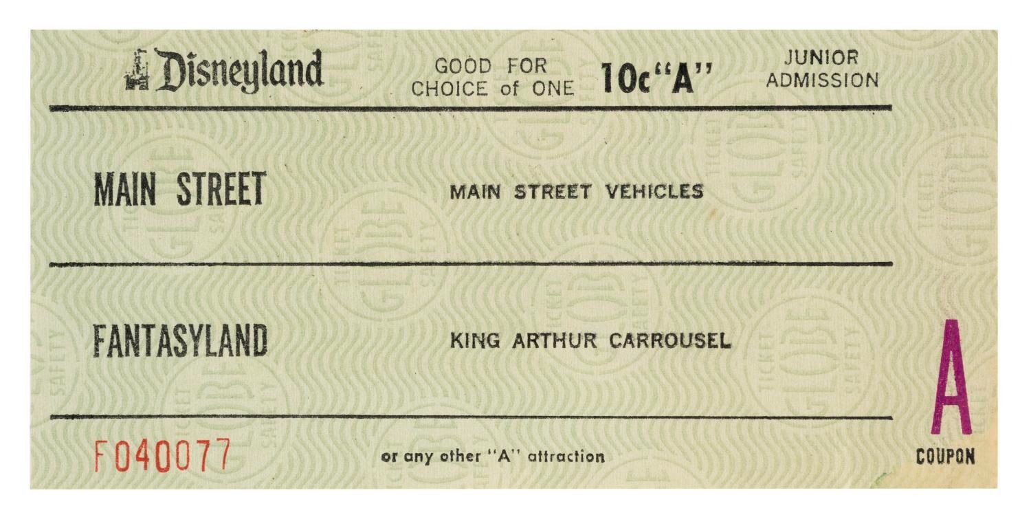 (Disneyland, 1970s) A ten cent Junior “A” ticket from a Disneyland ticket book of the 1970s. Measuring 2.5” x 5.5” the ticket is in very good condition with slight discoloration from age.