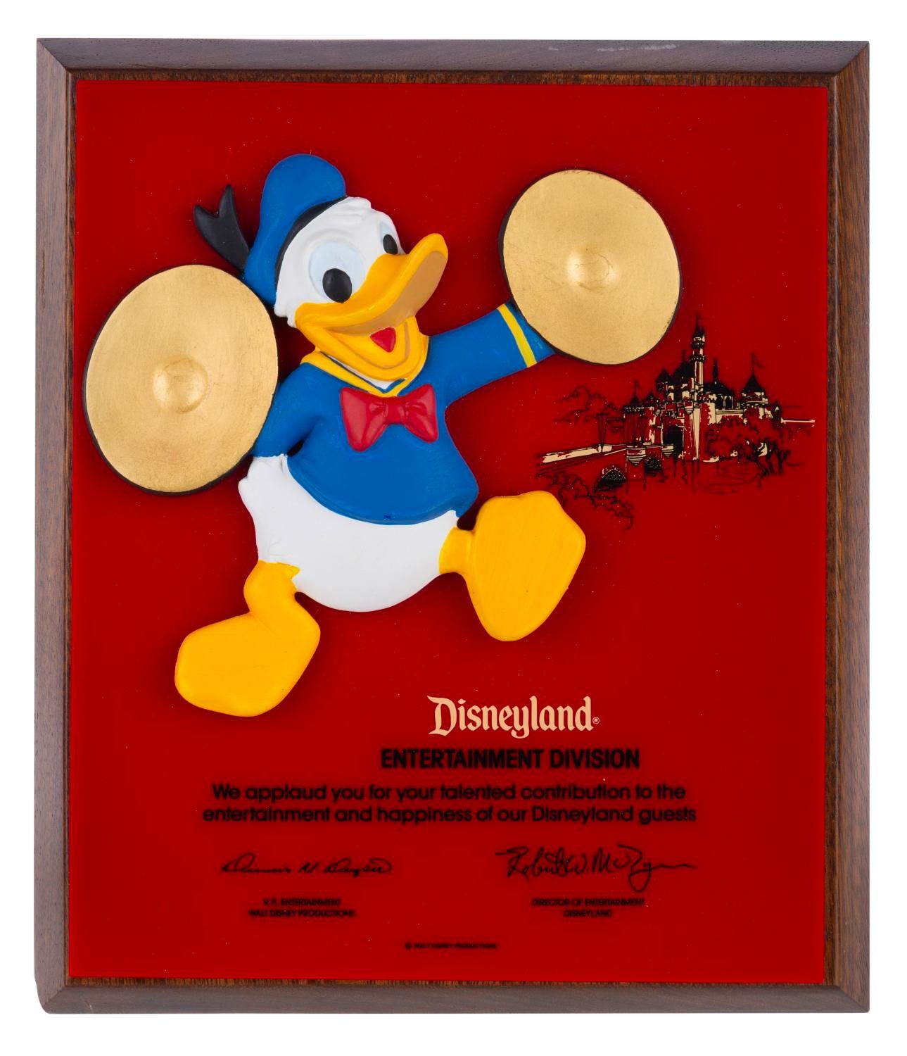 (Disney, 1970s) An Entertainment Division award given to a Cast Member for excellence in entertainment and featuring Donald Duck. Measuring 8.5" x 10" x 1", the plaque is in very good condition with light wear from display.