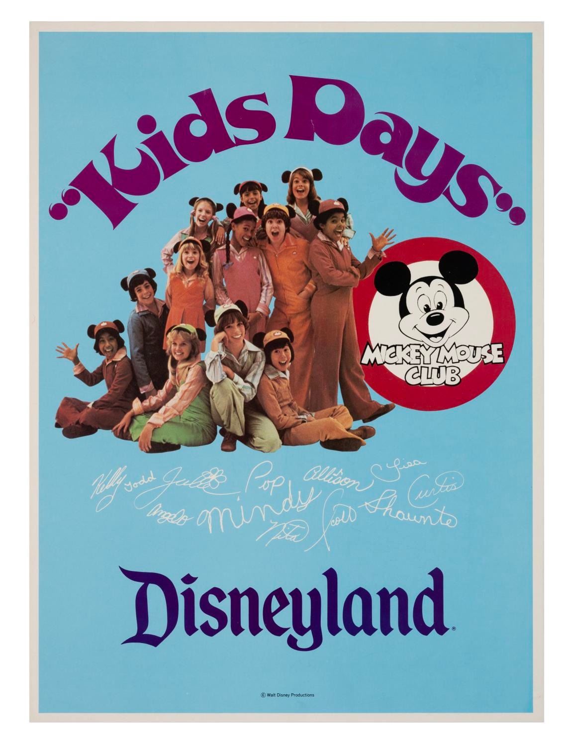 (Disneyland, 1970s) A poster created to promote the New Mickey Mouse Club's Kids Days at Disneyland. Replicas of the cast's signatures are printed below the cast photo. Measuring 14" x 19", the store-rolled poster is in very good condition with a few small creases and light edge wear.