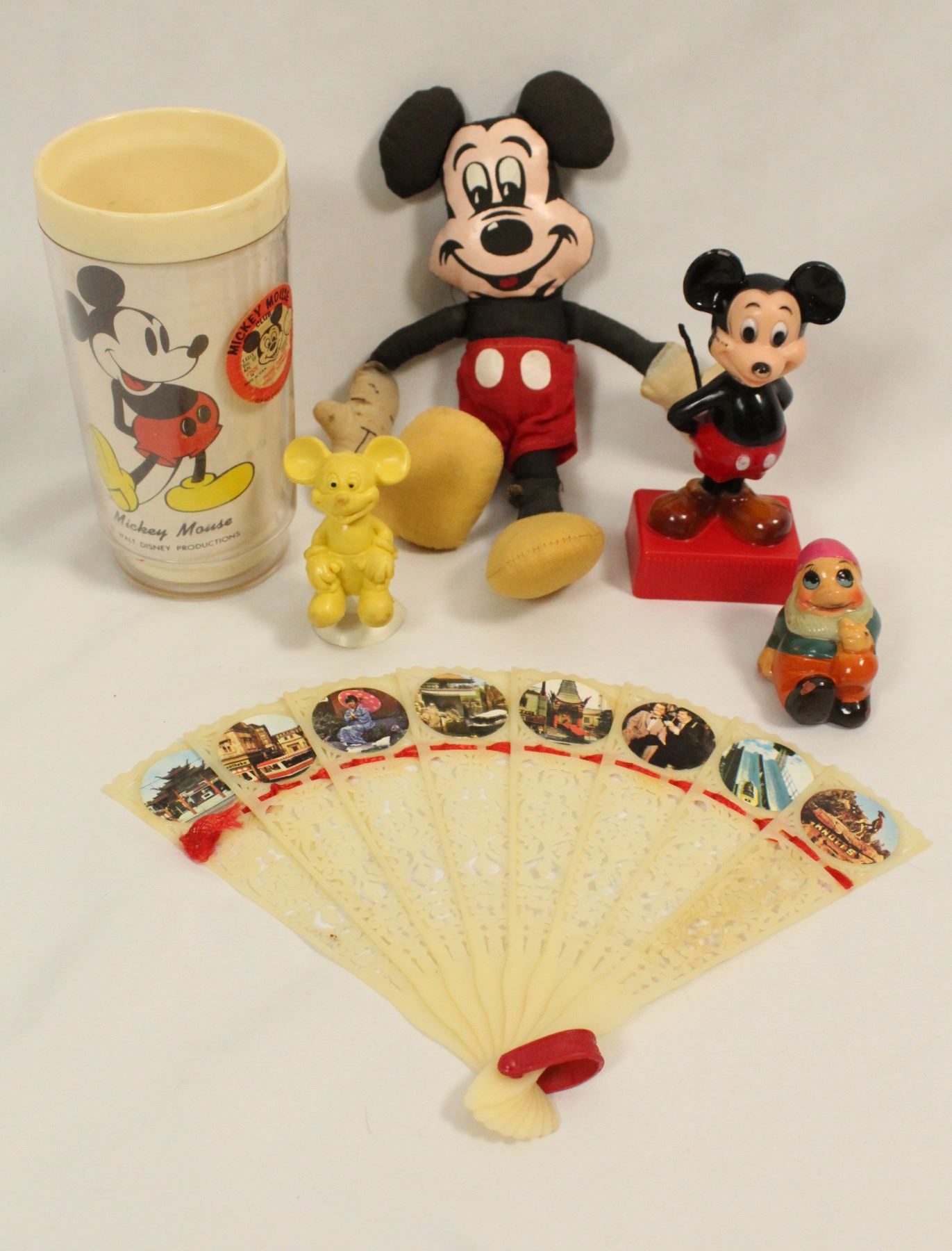 This lot features several items from that would have belonged to a young child in the 70s that was a huge fan of Disney. Included in this lot is an 8" Mickey Mouse plush, A yellow rubber Mickey Mouse suction cup toy, a 5" tall plastic Mickey Mouse pencil sharpener, a Bashful Dwarf wooden pencil sharpener, a filigree plastic celluloid folding fan featuring scenes around Los Angeles, and a Mickey Mouse Club thermo Tumbler with sticker still attached. While the items show some yellowing, staining or wear, they present well and would make an excellent addition to any vintage display.