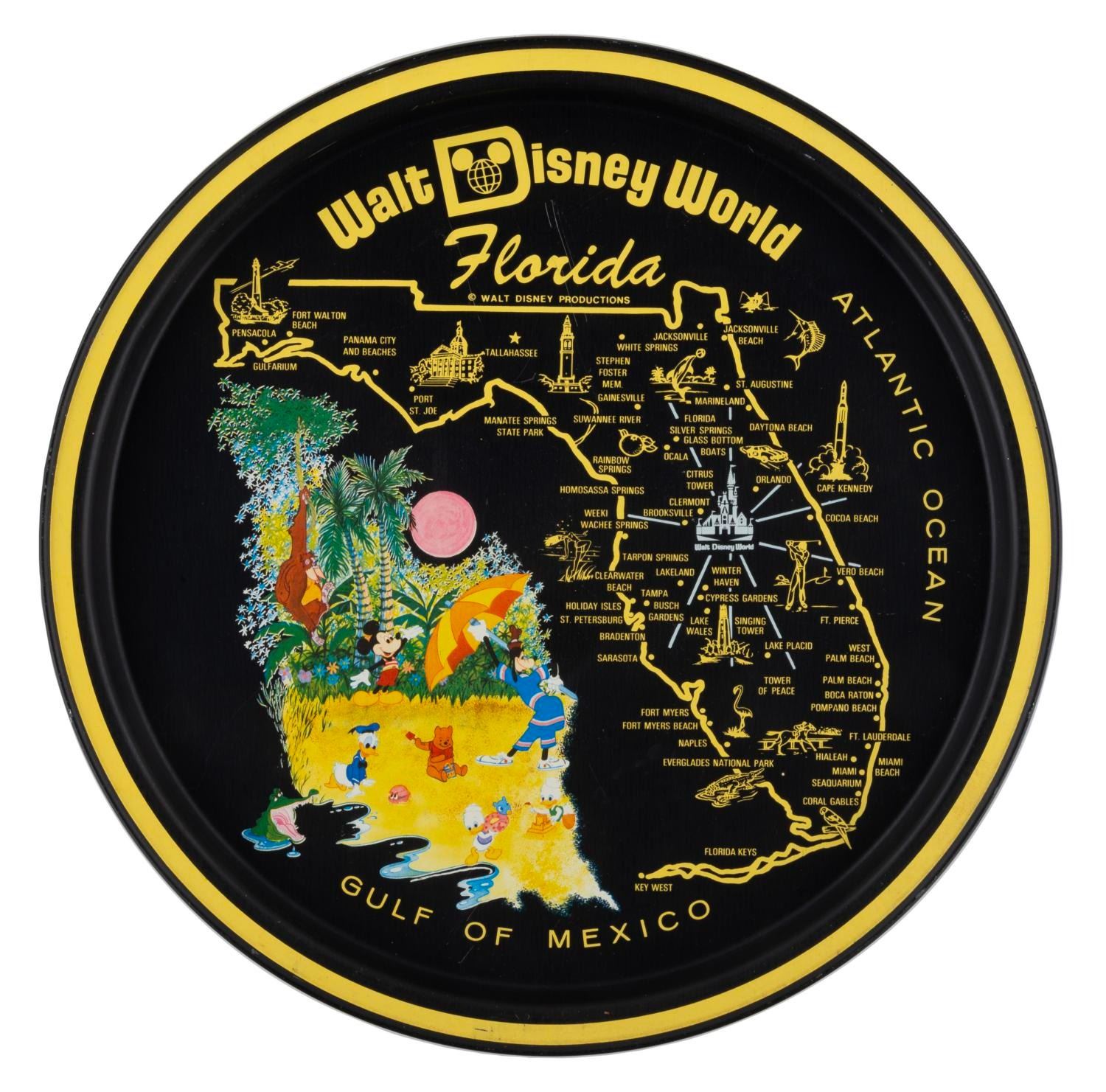 (Walt Disney World, 1970s) A tin serving tray featuring Walt Disney World and a variety of tourist destinations throughout Florida. Measuring 10.75” in diameter, the tray displays in good condition with light scratches, scuffs, and dents.