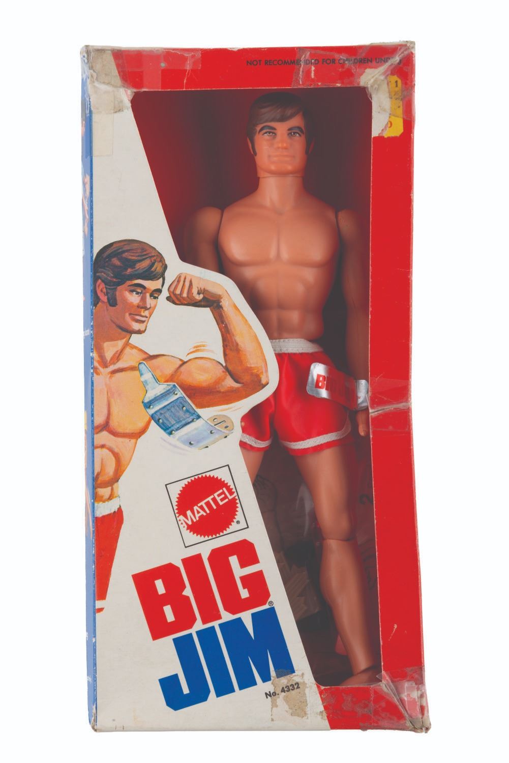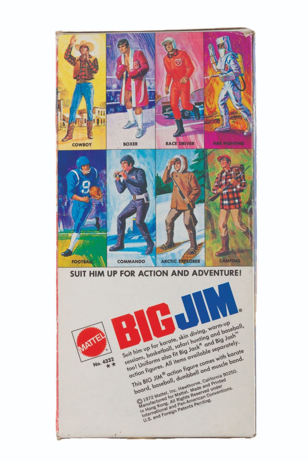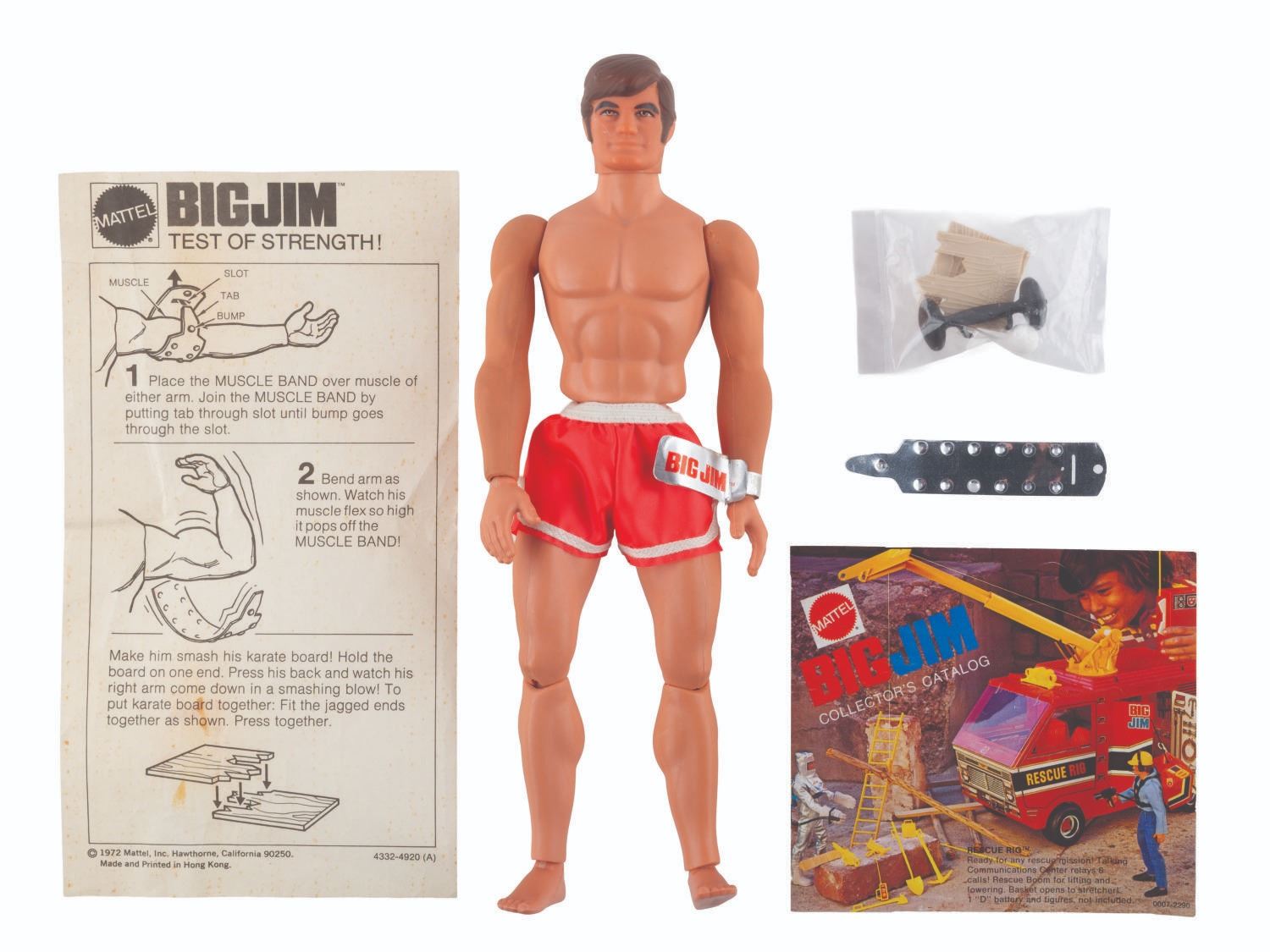 (Mattel, 1972) A Big Jim action figure with the original box. Jim comes with a baseball, dumbbell, and muscle band he can use with his bulging muscle feature and karate chop action. Big Jim is in very good working condition, with slight scuffs to his arms from age. The accessories are in fine condition. The instructions and catalog are in very good condition, with the box in fair condition, showing heavy wear, corner splits, and tape repair.