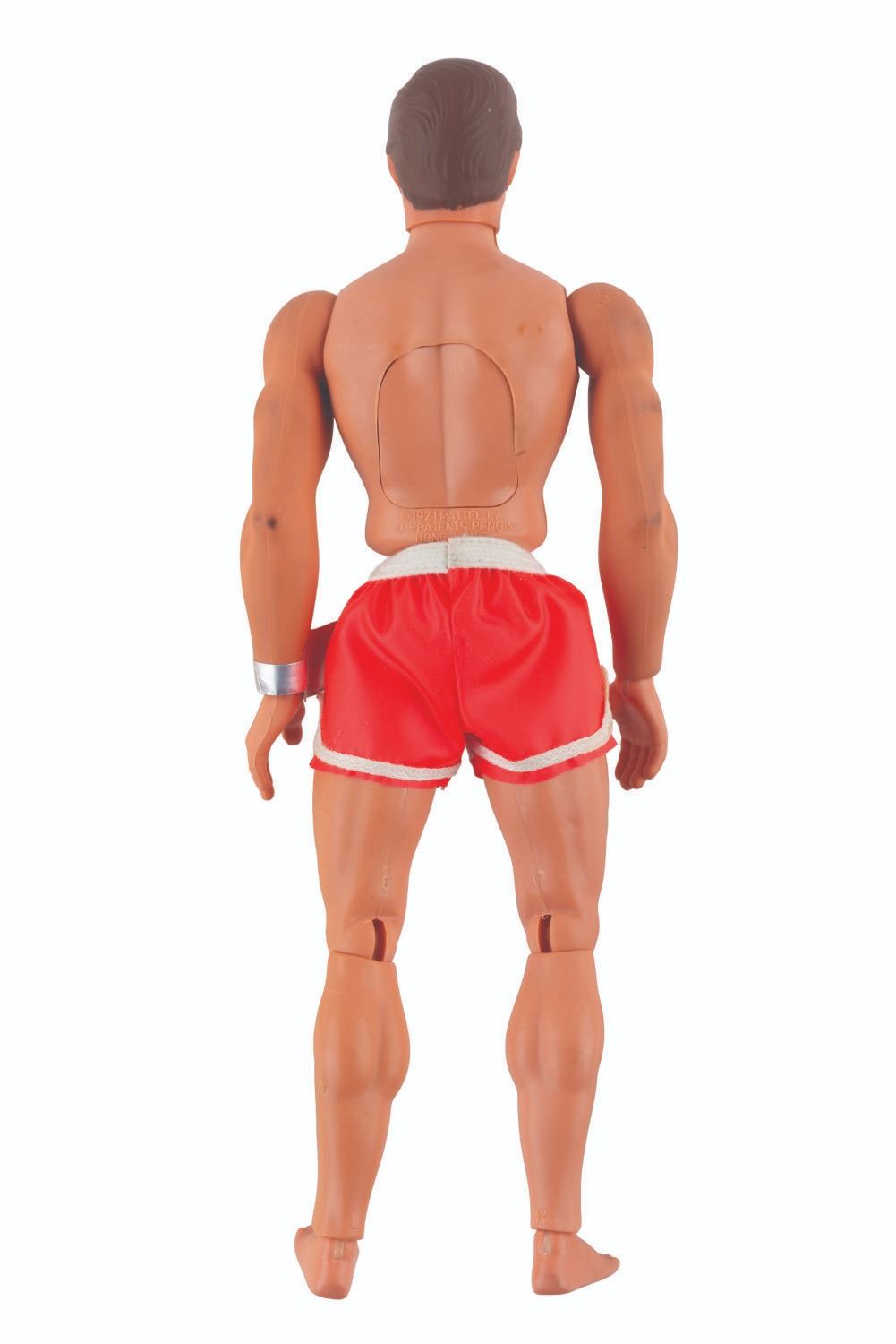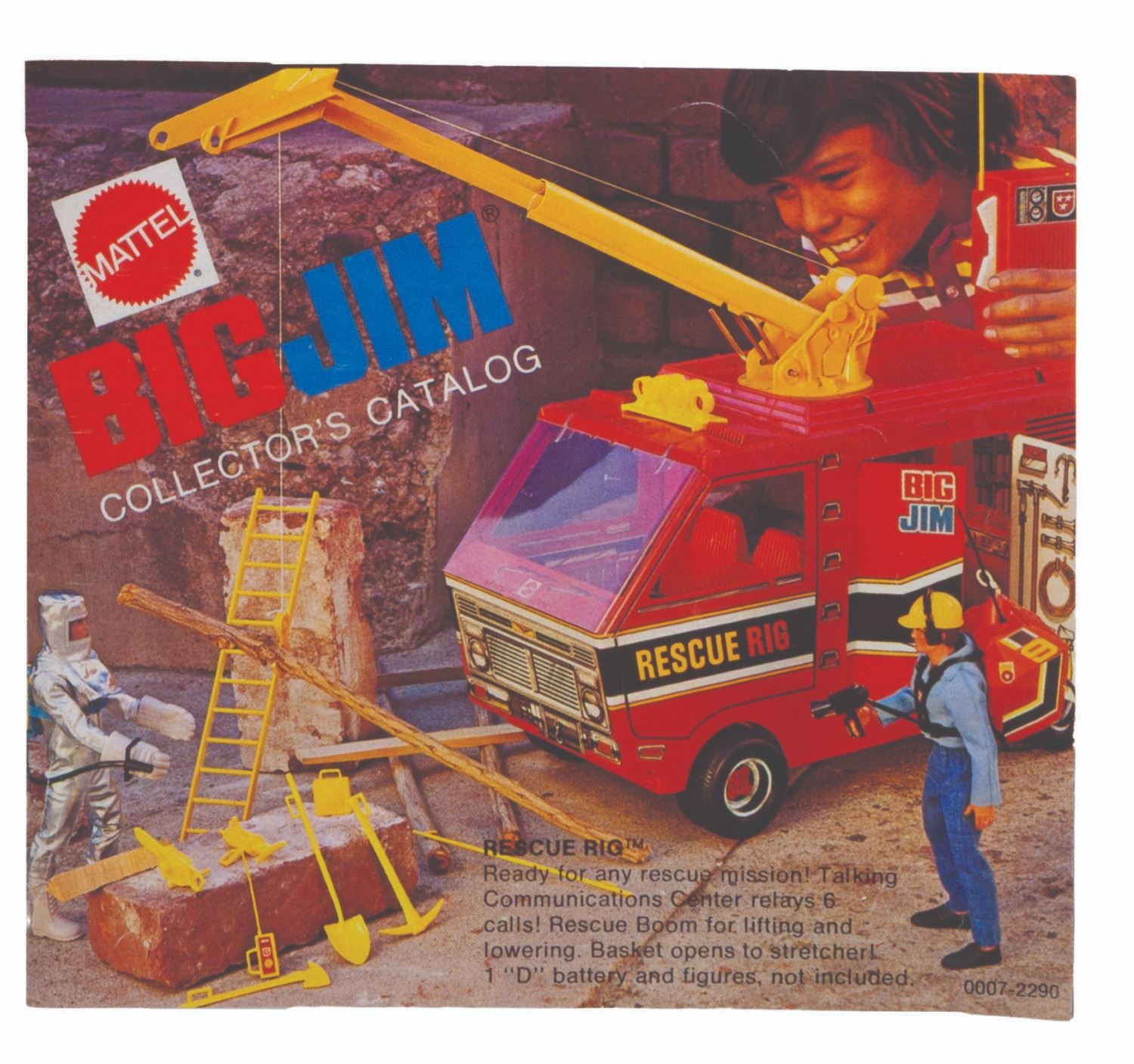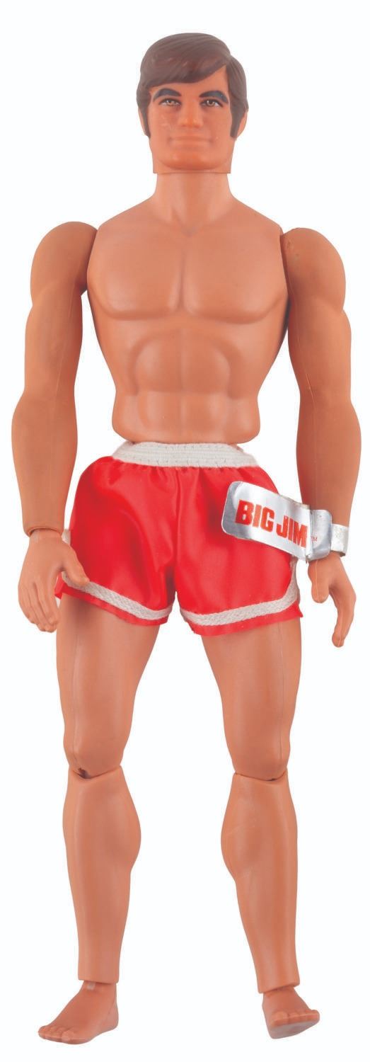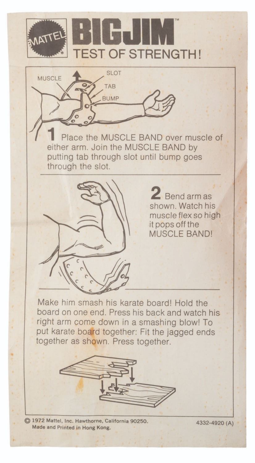 (Mattel, 1972) A Big Jim action figure with the original box. Jim comes with a baseball, dumbbell, and muscle band he can use with his bulging muscle feature and karate chop action. Big Jim is in very good working condition, with slight scuffs to his arms from age. The accessories are in fine condition. The instructions and catalog are in very good condition, with the box in fair condition, showing heavy wear, corner splits, and tape repair.