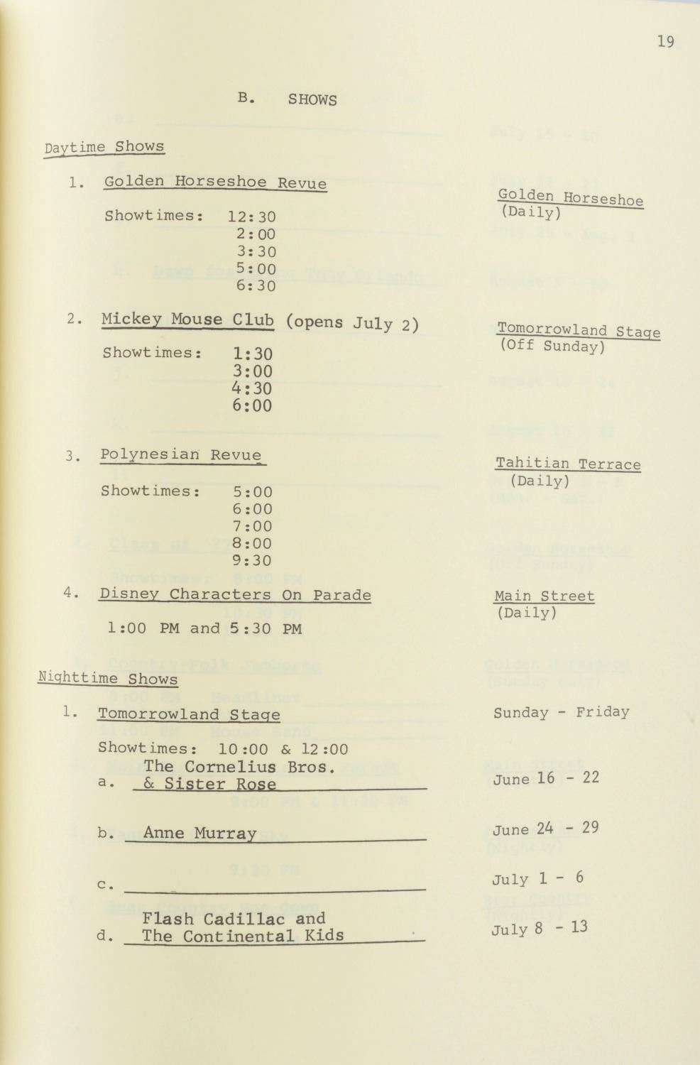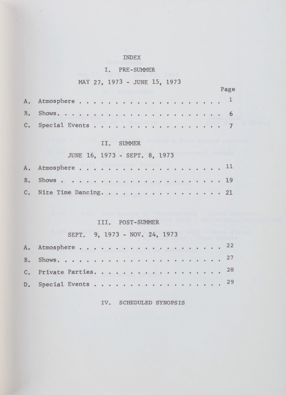 (Disneyland, 1973) A Disneyland Entertainment Schedule for May 27 through November 24, 1973. This 36-page booklet includes character, entertainment, and performer schedules for regular Park days as well as special events including Date Night and Angel Baseball Fun Day. Measuring 8.5” x 11”, the schedule is in fine Park-used condition.