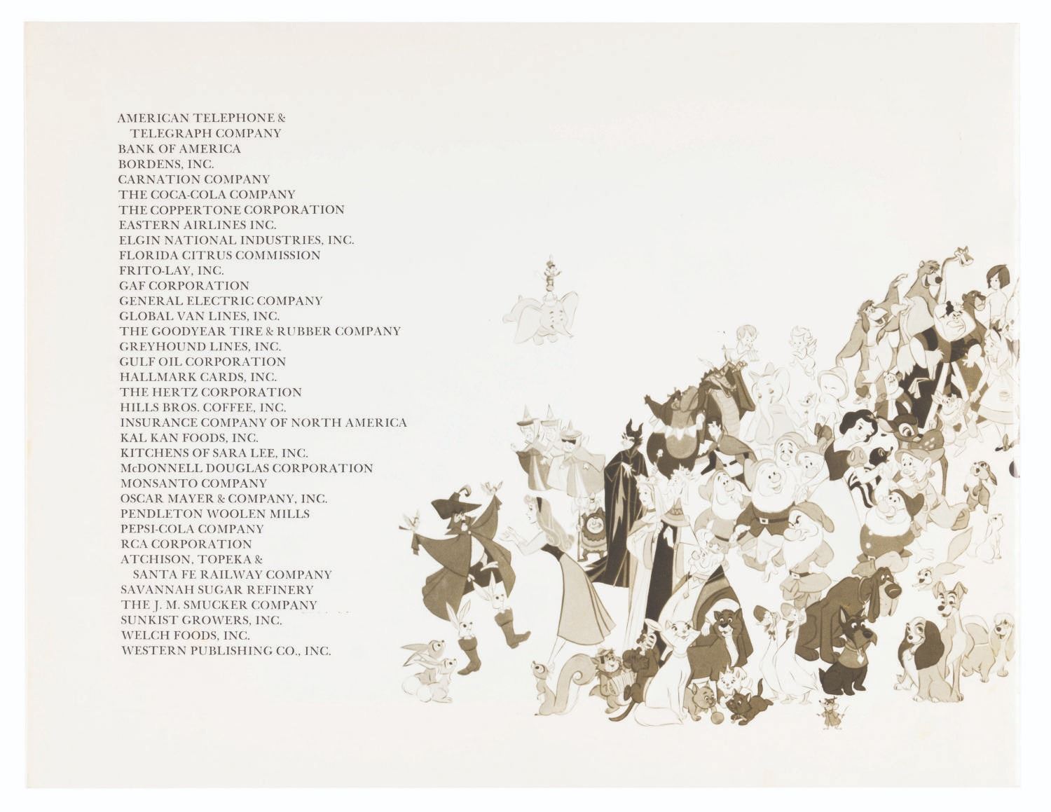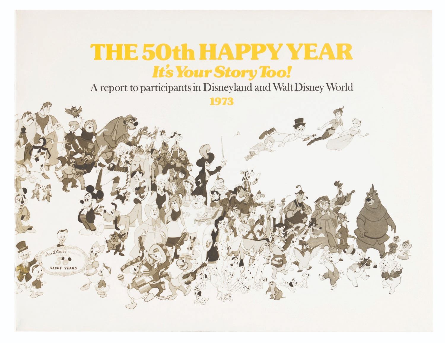 (Disney, 1973) A report and promotional booklet for participating companies at Disneyland and Walt Disney World. The booklet features marketing details, information, and photos on new and upcoming Park attractions, including the PeopleMover, Space Mountain, Pirates of the Caribbean, and the Townhouses at Lake Buena Vista. This is a rare glimpse into the expansion of Disney properties and details valued by their sponsors during the 50th Anniversary of Walt Disney Productions. The glossy, 20-page, staple-bound book measures 8.5” x 11” and is in very fine condition.