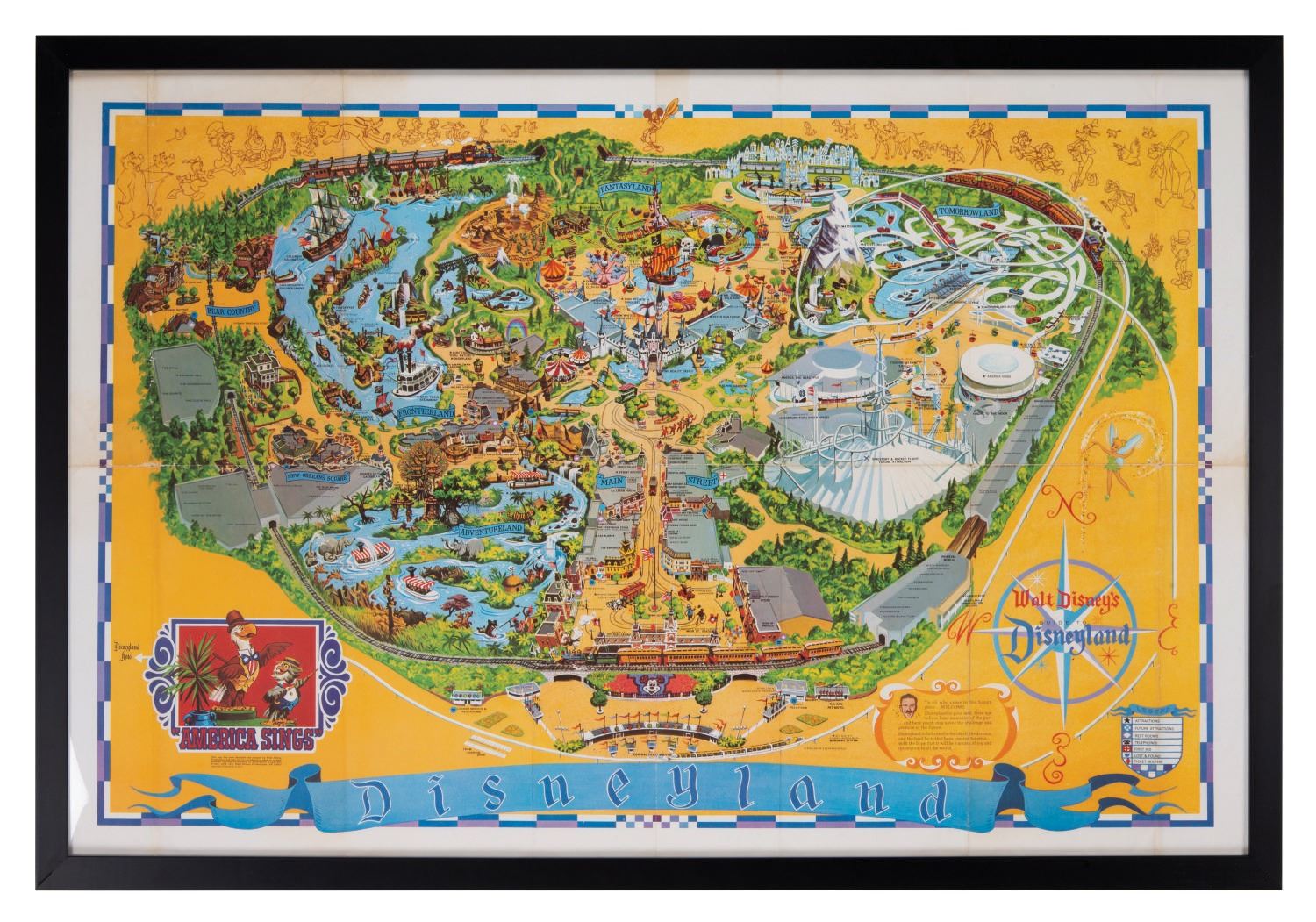 (Disneyland, 1974) This is the fourth map in the "second series" (post-Sam McKim) of Disneyland large souvenir maps. This map features the new "America Sings" attraction and measures 45"x30". The condition is very good with some wear to the fold-lines, slight discoloration on the top border, and minor edge-wear.
