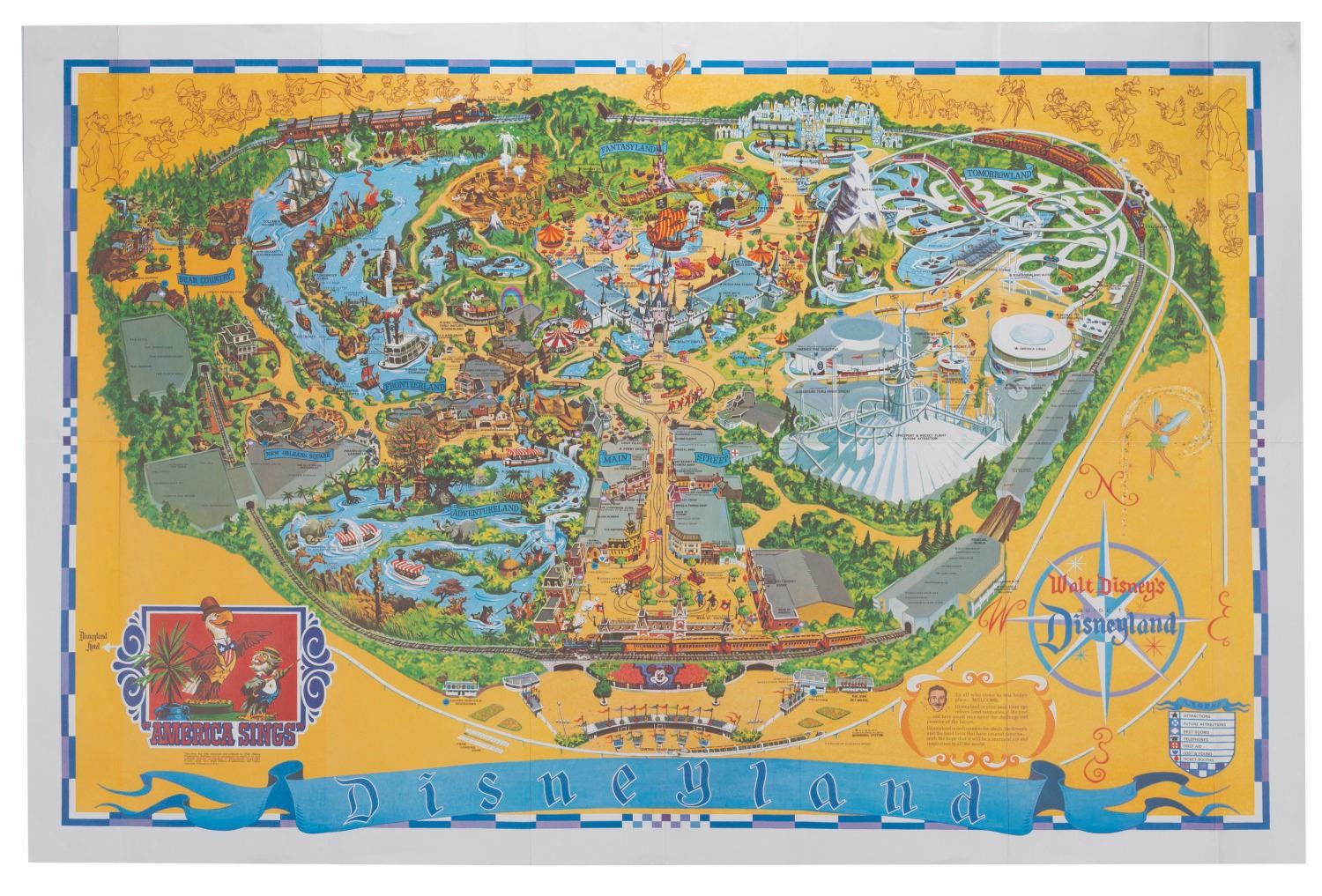 (Disneyland, 1974) A large souvenir map of Disneyland. This fourth map in the "second series" of maps (post Sam-McKim) is the first to feature the new America Sings attraction, which replaced the Carousel of Progress. Measuring 30" x 45", the map is in very good condition with creases and wear along the original folds.