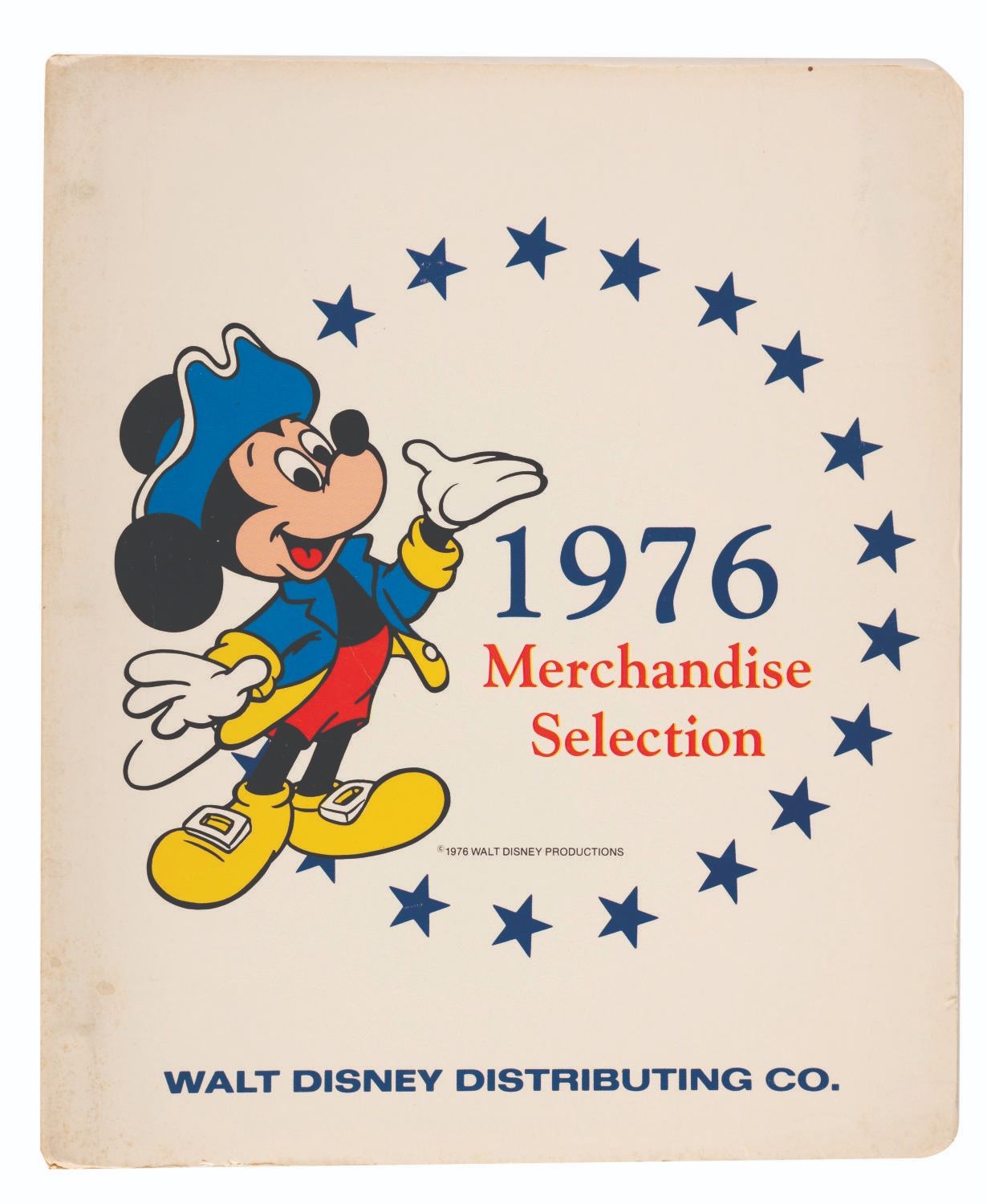 (Disney, 1976) A "1976 Merchandise Selection Catalogue" binder detailing the new products manufactured by Walt Disney Distributing Co. during America's bicentennial year. Measuring 9.5"x11.5", the binder is in good condition with edge wear, spotting on the cover and several pages, and discoloration due to age.