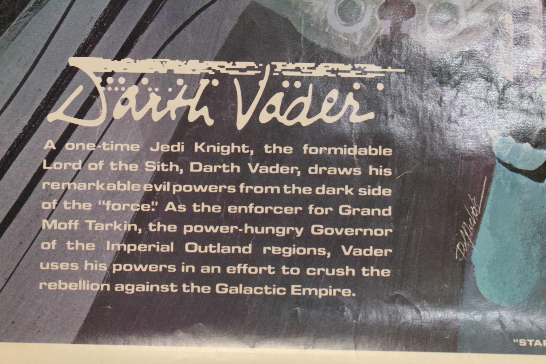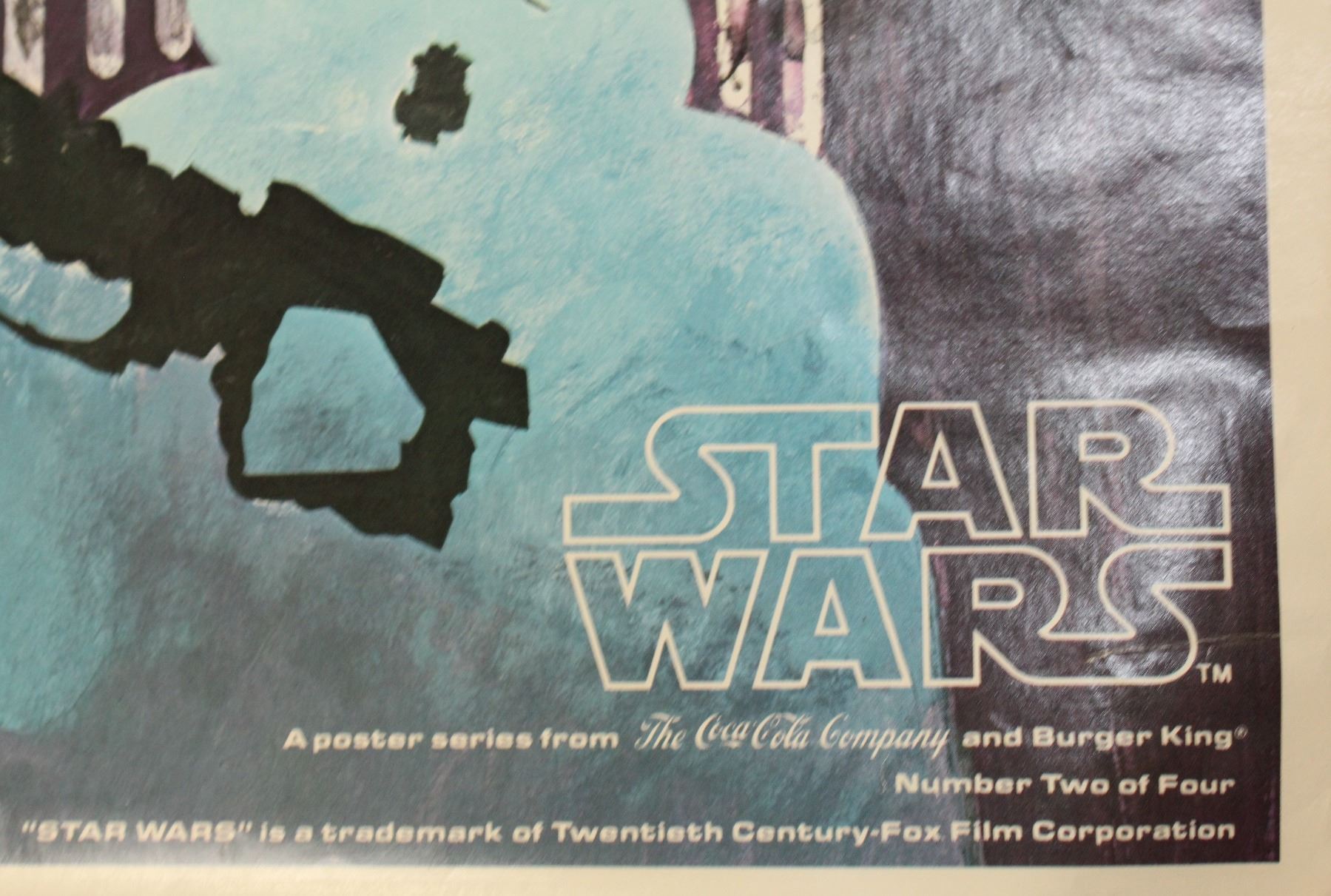 Original Darth Vader 20th Century Fox Coca-Cola promotional poster measuring (18″ X 24″). This poster is Number 3 of 4 and was printed for Coca Cola advertising. This promotional tie-in series was for the Burger Chef franchise (1954-1996), for Burger King, Coca Cola advertising and Japanese audiences. The artist commissioned for painting the set was Del Nichols. This variant has a white border with while some fill the entire panael. All variants are considered original. Ships rolled in tube. Has a small tear in the top border.