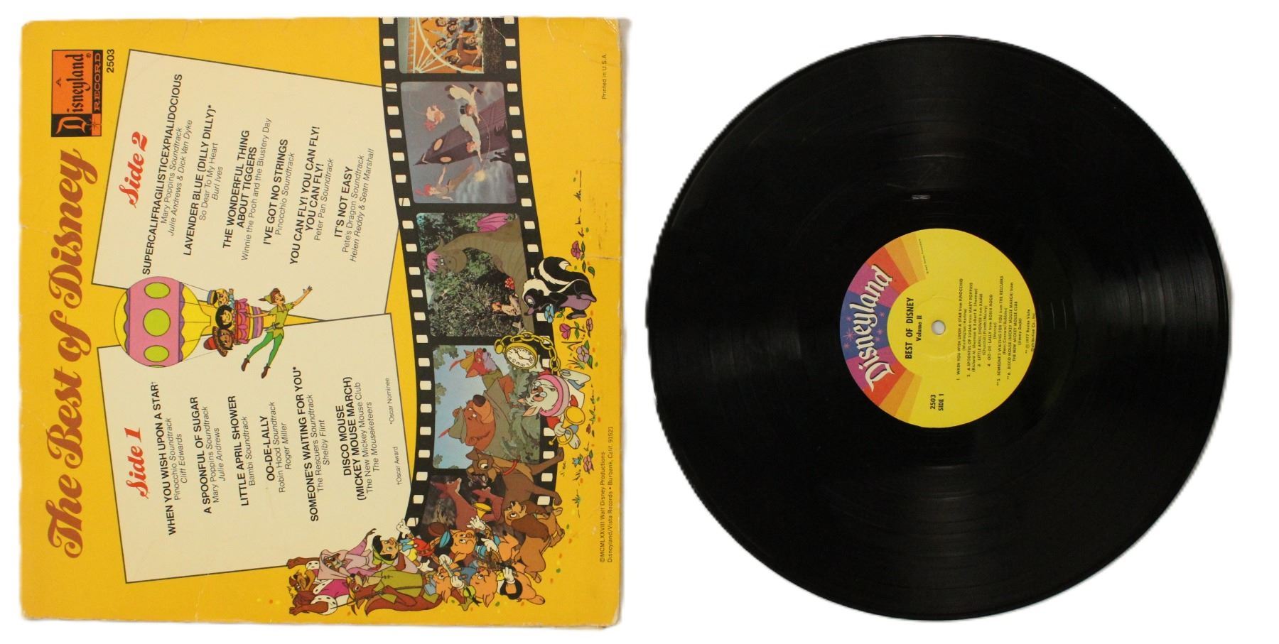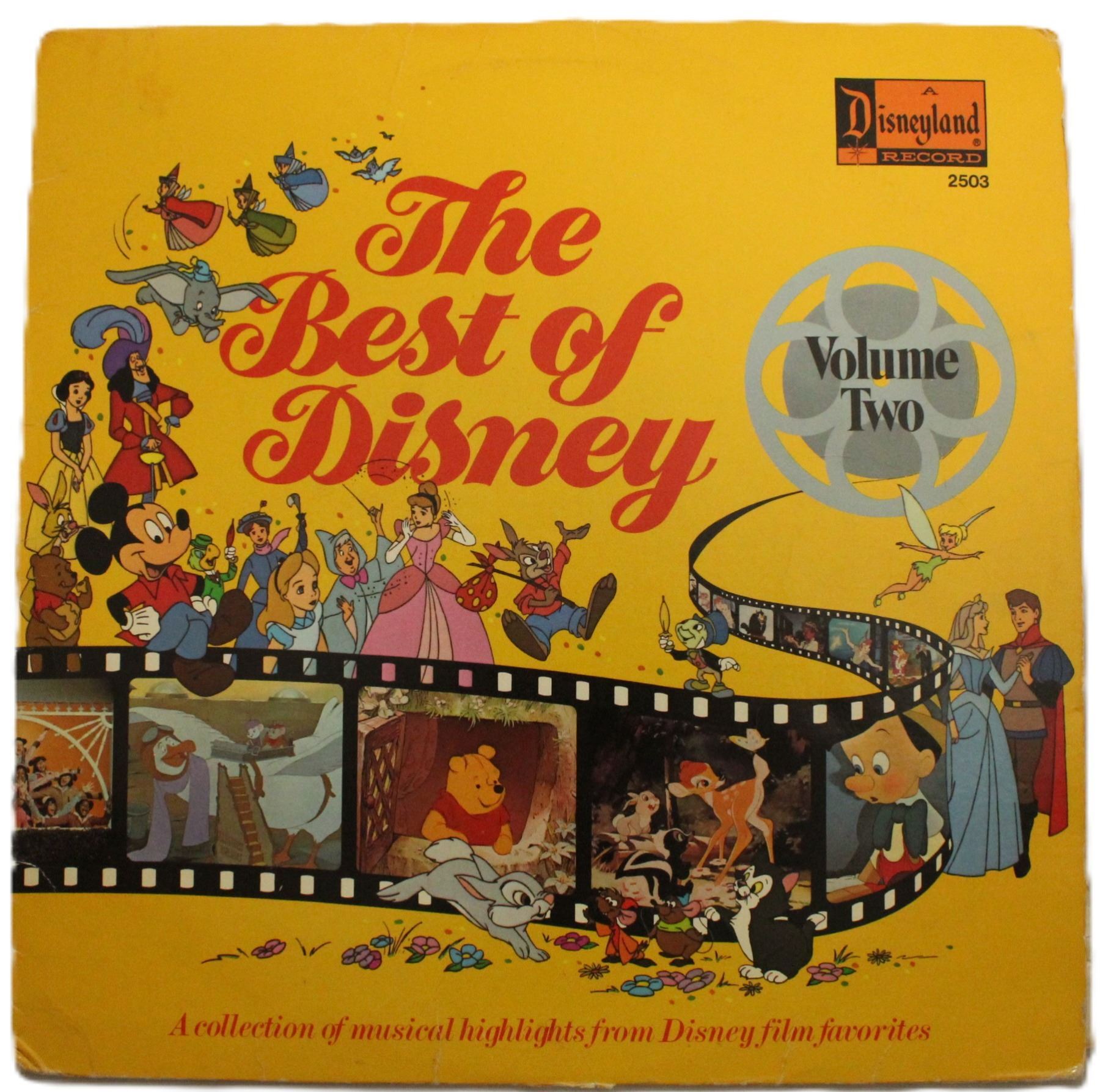 This record includes a collection of musical highlights from Disney film favorites including Pinocchio, Mary Poppins, Robn Hood, The Rescuers, Bambi, Winnie the Pooh, Pete's Dragon and more. The cover is in good condition with signs of wear from use and age. The record is in great condition and may have small scratches from use.