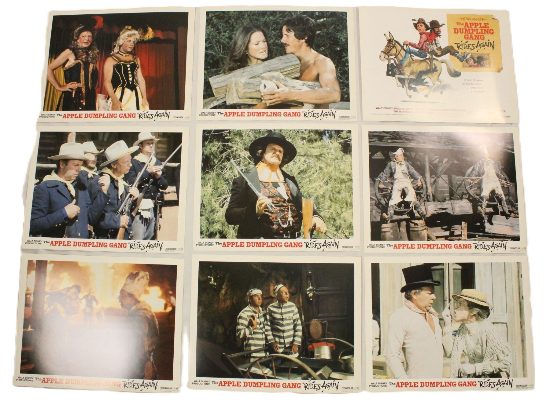 This set comes in new condition and includes nine(9) 11"x14" Full Color Poster and Movie Scenes from Walt Disney Productions' zany live action film "The Apple Dumpling Gang Rides Again". Featuring the talents of Tim Conway, Don Knotts, Tim Matheson and more, this film reprised the characters of Amos Tucker and Theodore Ogelvie as they try to go clean and start over in a new townm, only to get wrapped up in more mischeif than ever. This pack is in mint condition.
