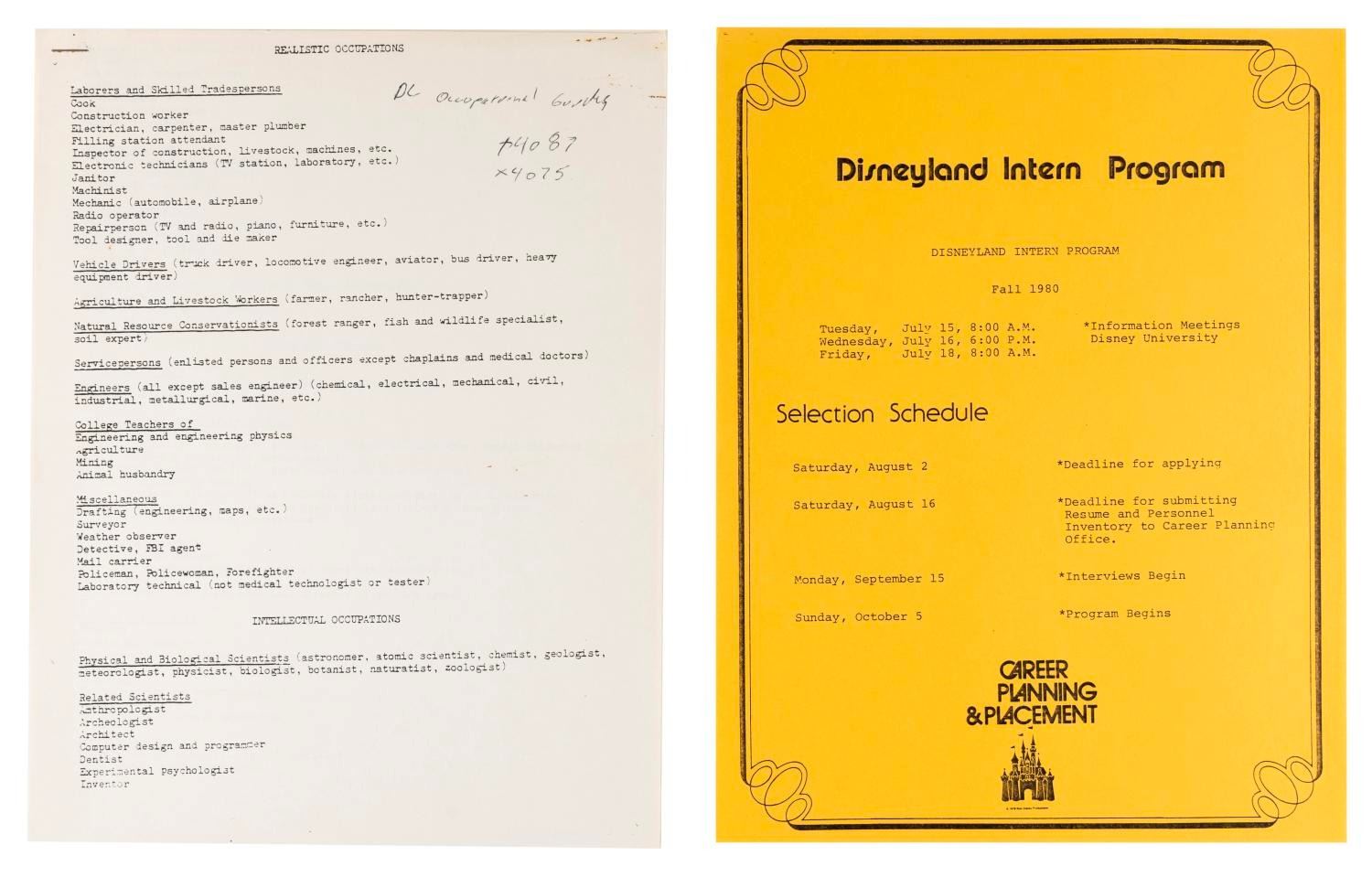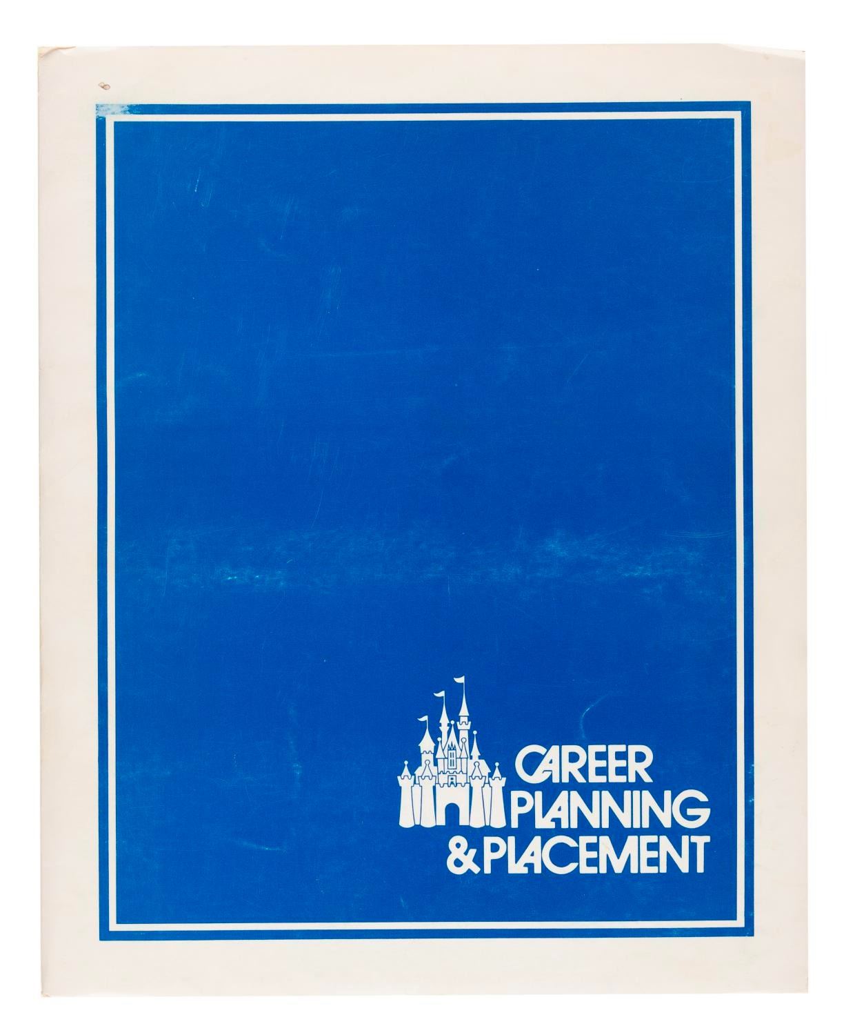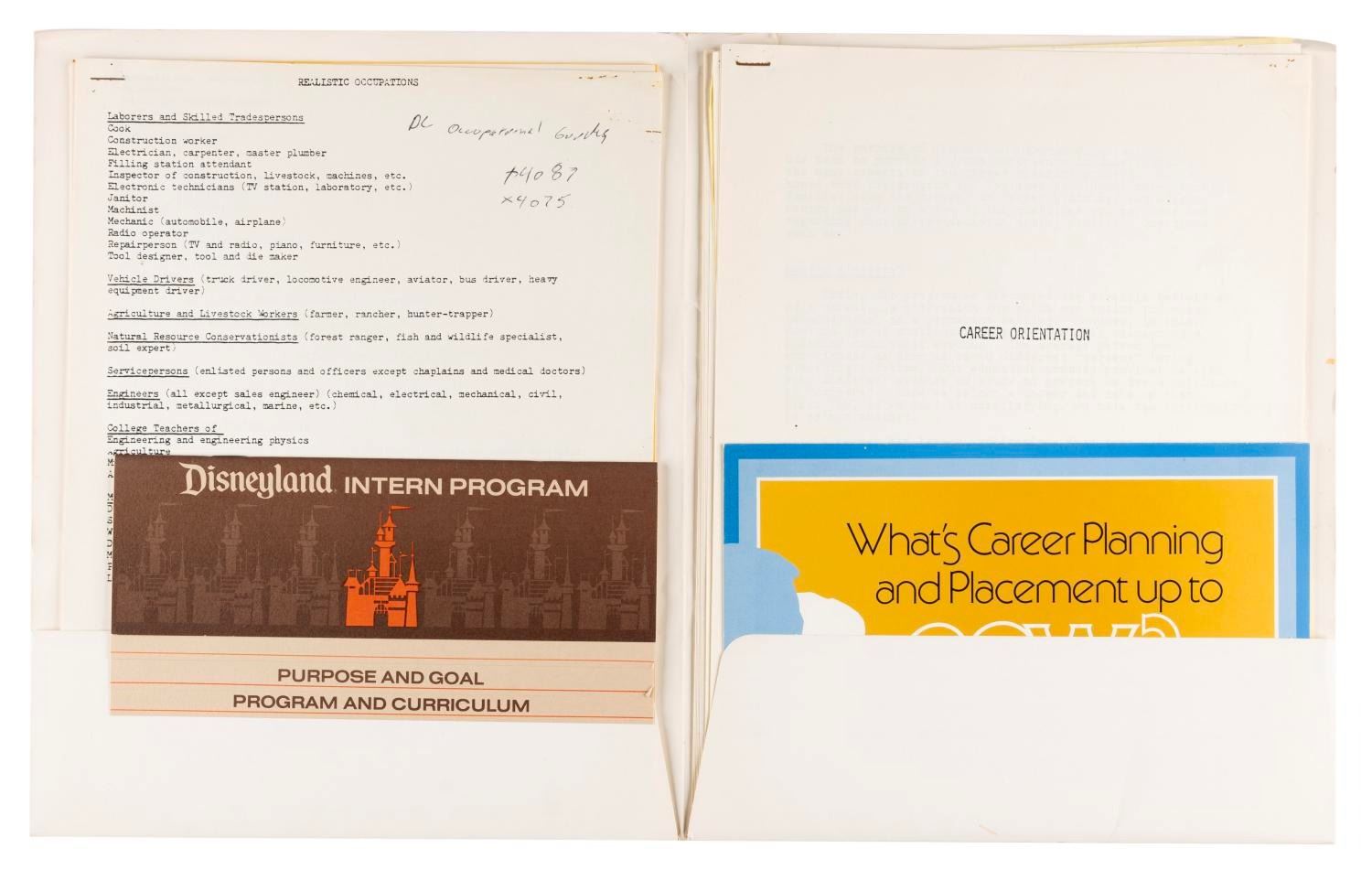 (Disneyland, 1980) A Disneyland Career Planning and Placement Department folder with brochures on the department and the Disneyland internship program, a department newsletter, flyers, and xeroxes about working at Disneyland and choosing a career. Measuring 9.5” x 11.75” overall, the folder is in good condition with wear from handling and age including scuffs and wear to the cover.