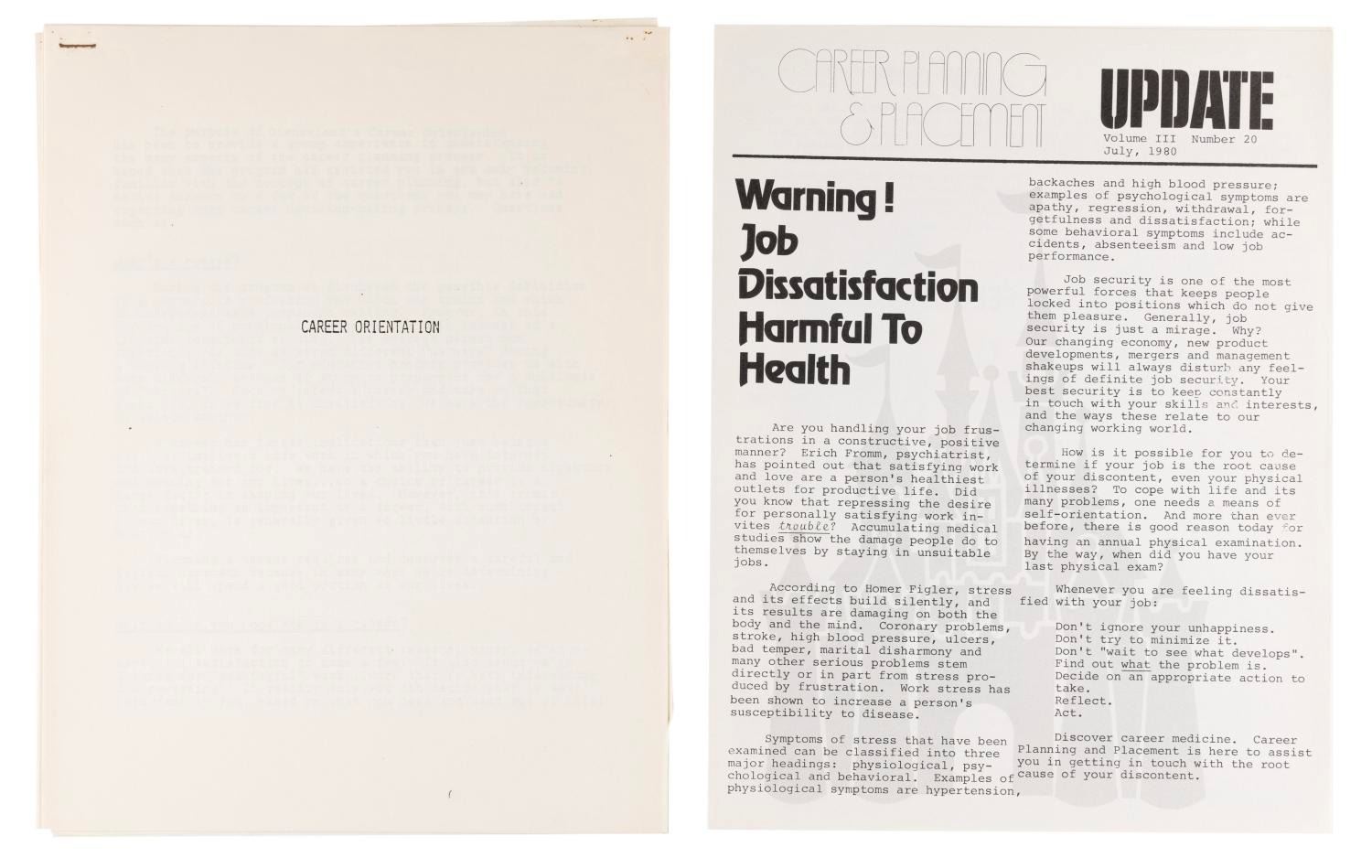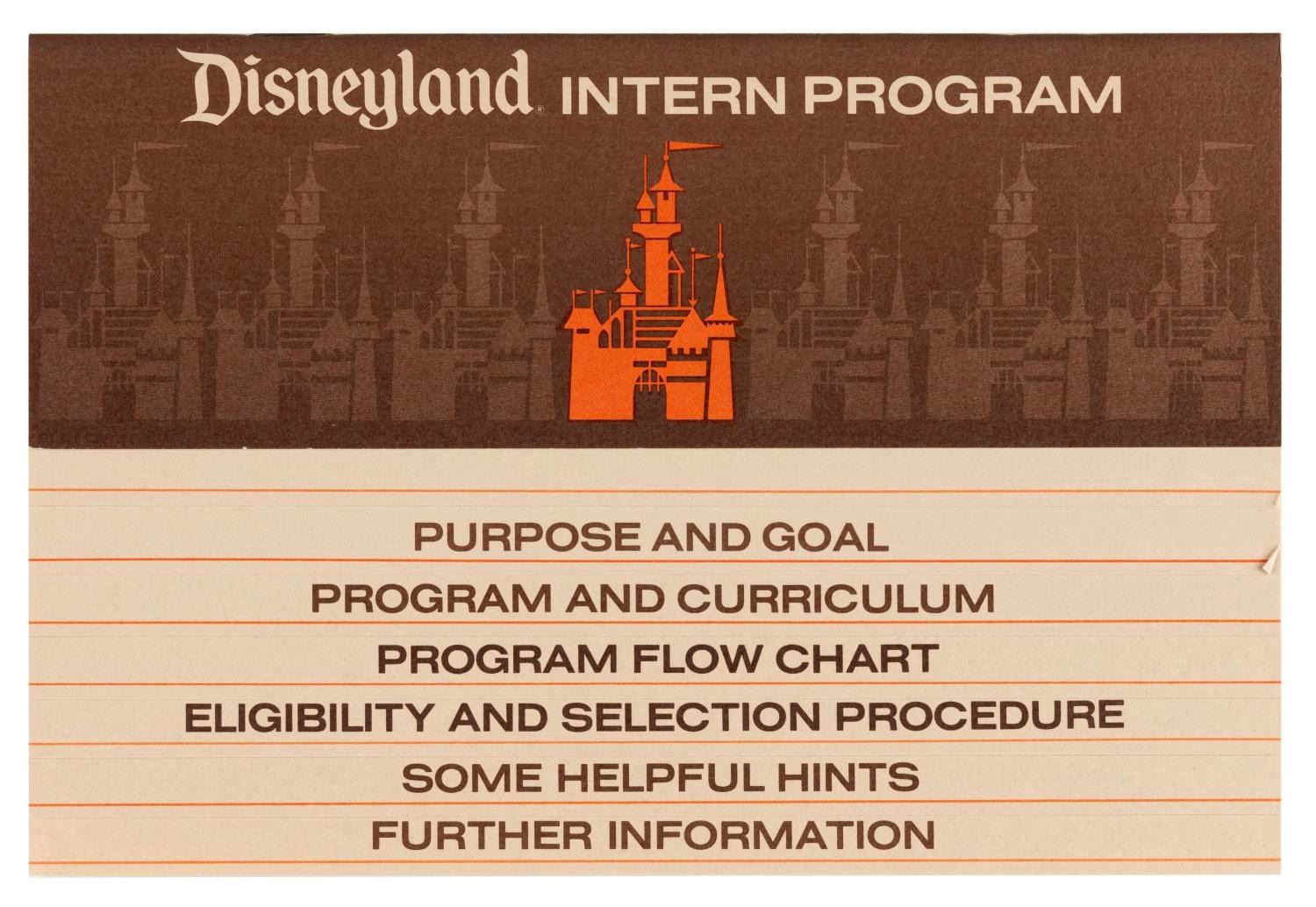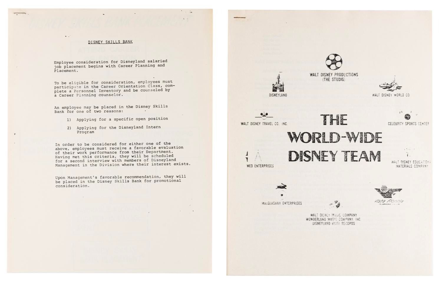 (Disneyland, 1980) A Disneyland Career Planning and Placement Department folder with brochures on the department and the Disneyland internship program, a department newsletter, flyers, and xeroxes about working at Disneyland and choosing a career. Measuring 9.5” x 11.75” overall, the folder is in good condition with wear from handling and age including scuffs and wear to the cover.