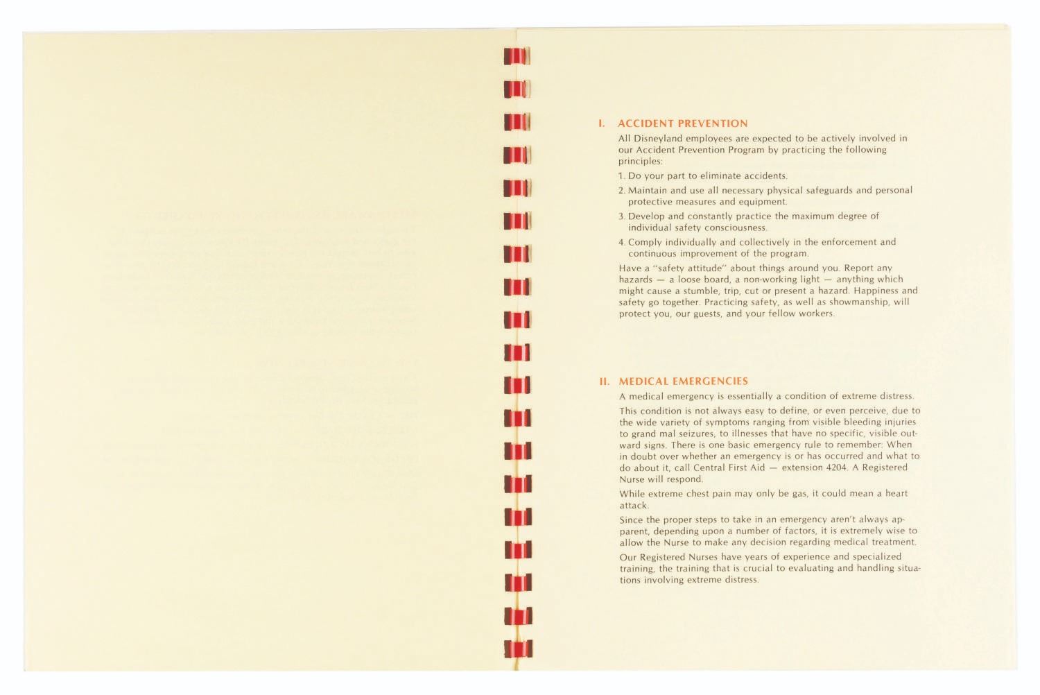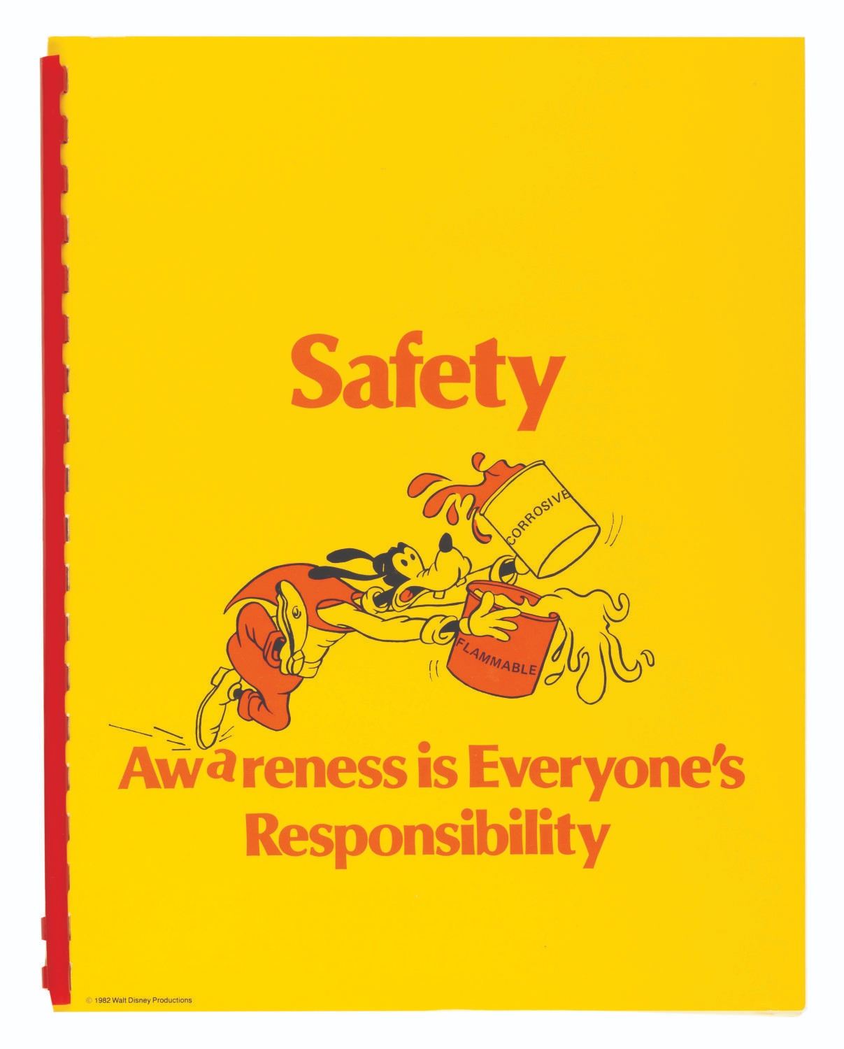 (Disneyland, 1982) A "Safety Awareness is Everyone's Responsibility" booklet for Disneyland Cast Members, providing information about fire, medical emergencies, hazardous materials, and on-the-job injuries. Measuring 8.75" x 11" the 9-page comb bound handbook is in very good condition with very light handling wear.