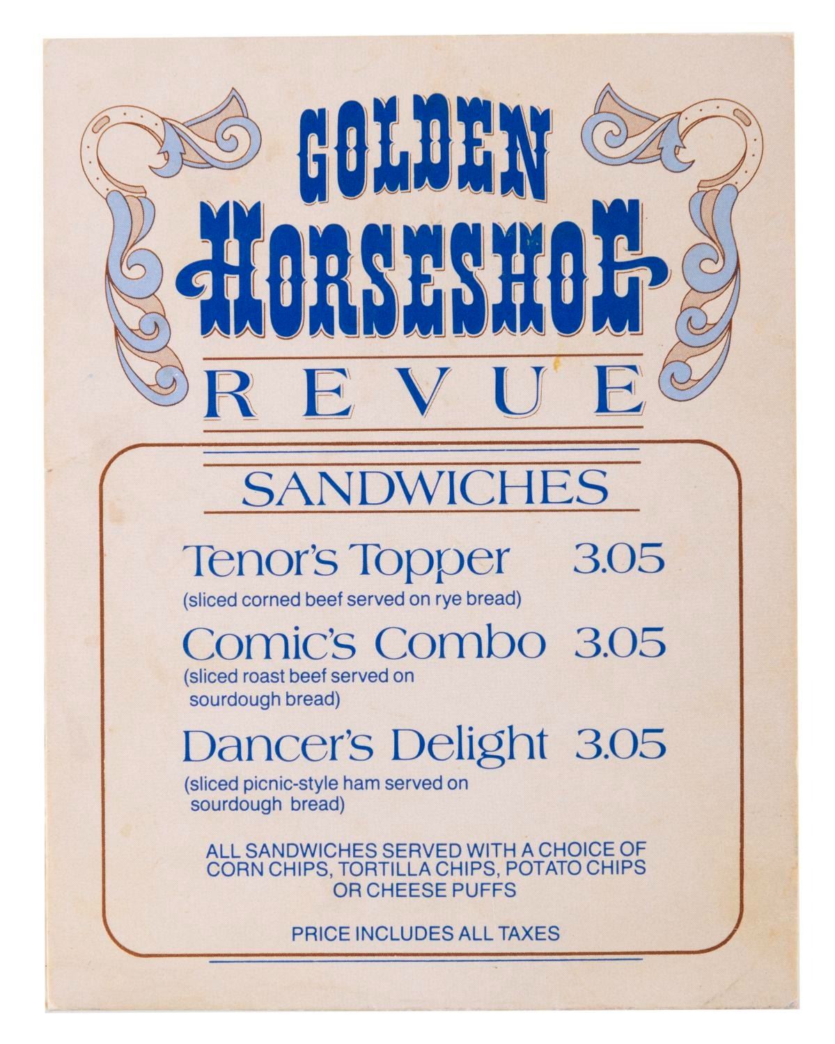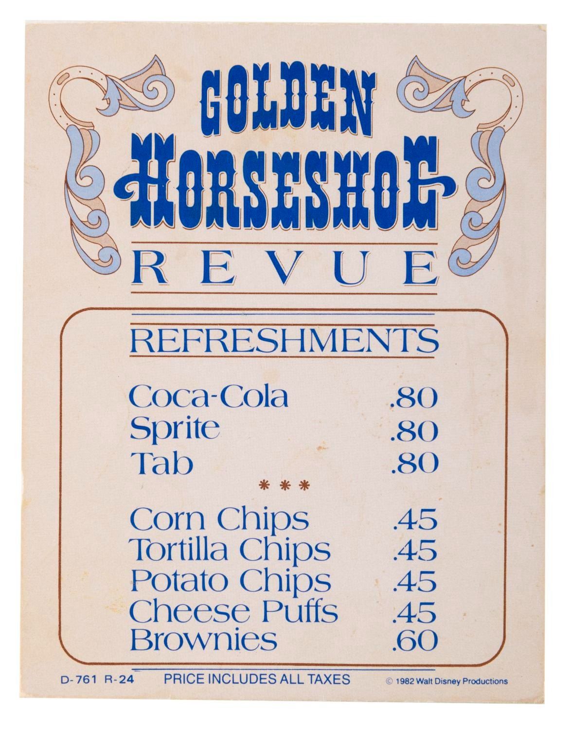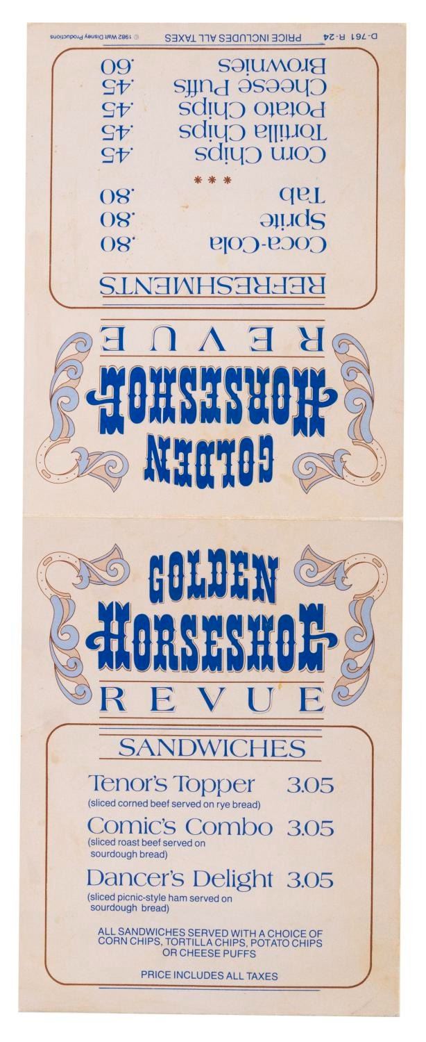 (Disneyland, 1982) A table card menu from the Golden Horseshoe Revue in 1982. Measuring 4.25" x 5.5", the card displays in good condition with wear from use, including small creases, spotting, and the tab torn off the bottom.