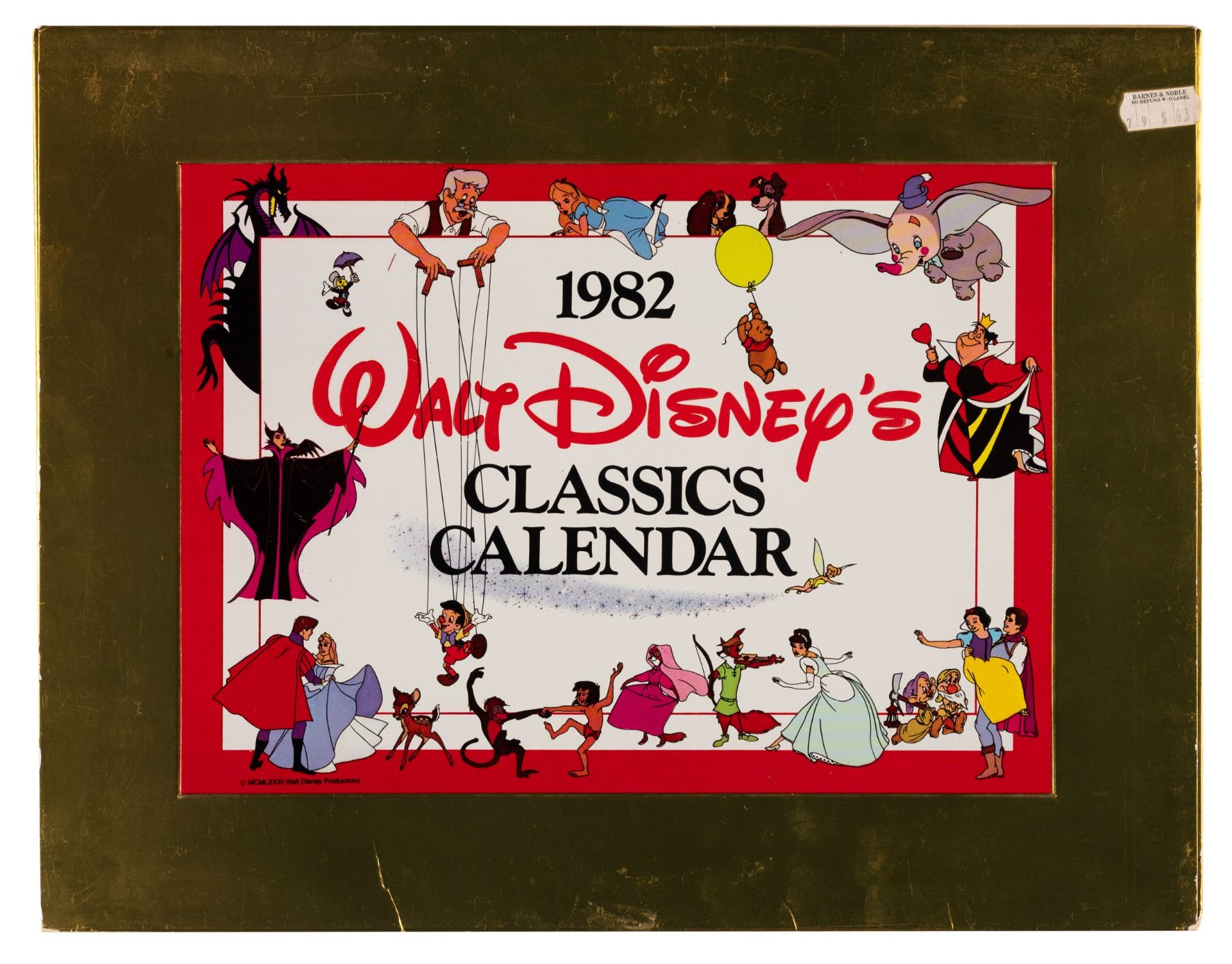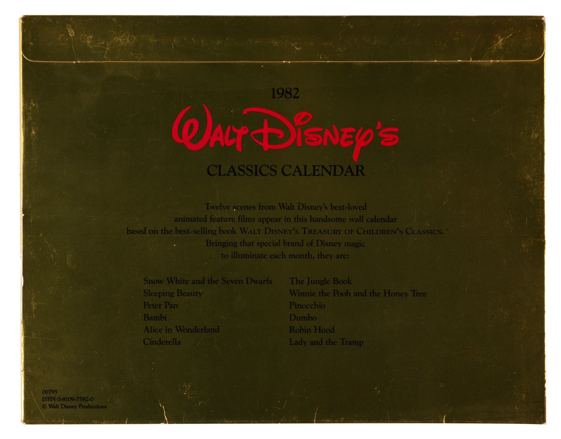 (Disney, 1982) A Walt Disney's Classics Calendar featuring twelve scenes from animated films, including "Sleeping Beauty," "Peter Pan," "Cinderella," and more. Measuring 11.25" x 14.5", the calendar is in fine unopened condition with edge wear and creasing to the outer packaging from handling and age.
