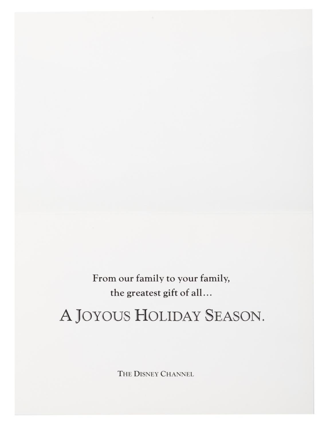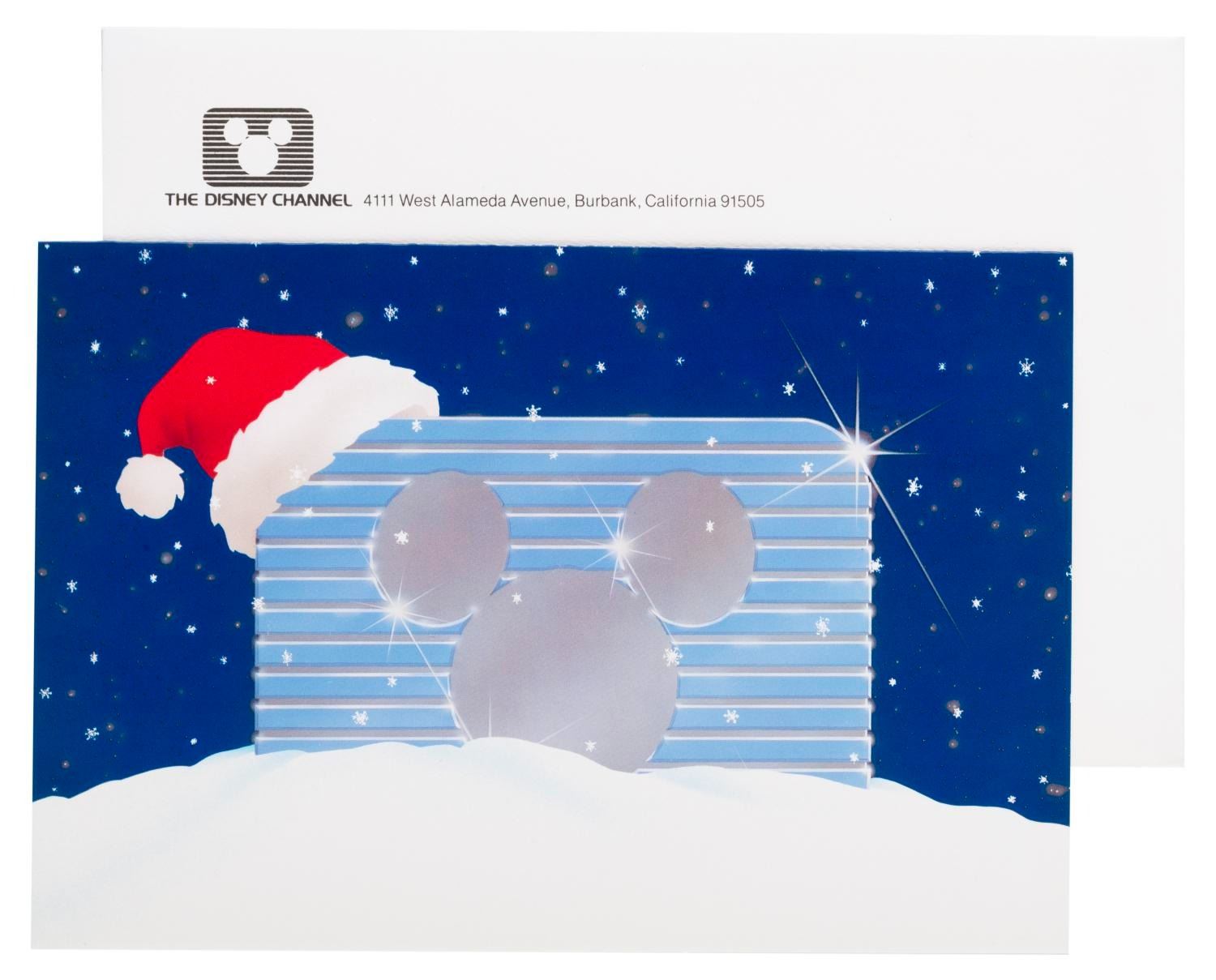 (Disney, 1983) An unused holiday card distributed by The Disney Channel for the 1983 holiday season. Measuring 5.25" x 7.75" with its 5.5" x 8.25" unused branded envelope, the card is in fine condition.